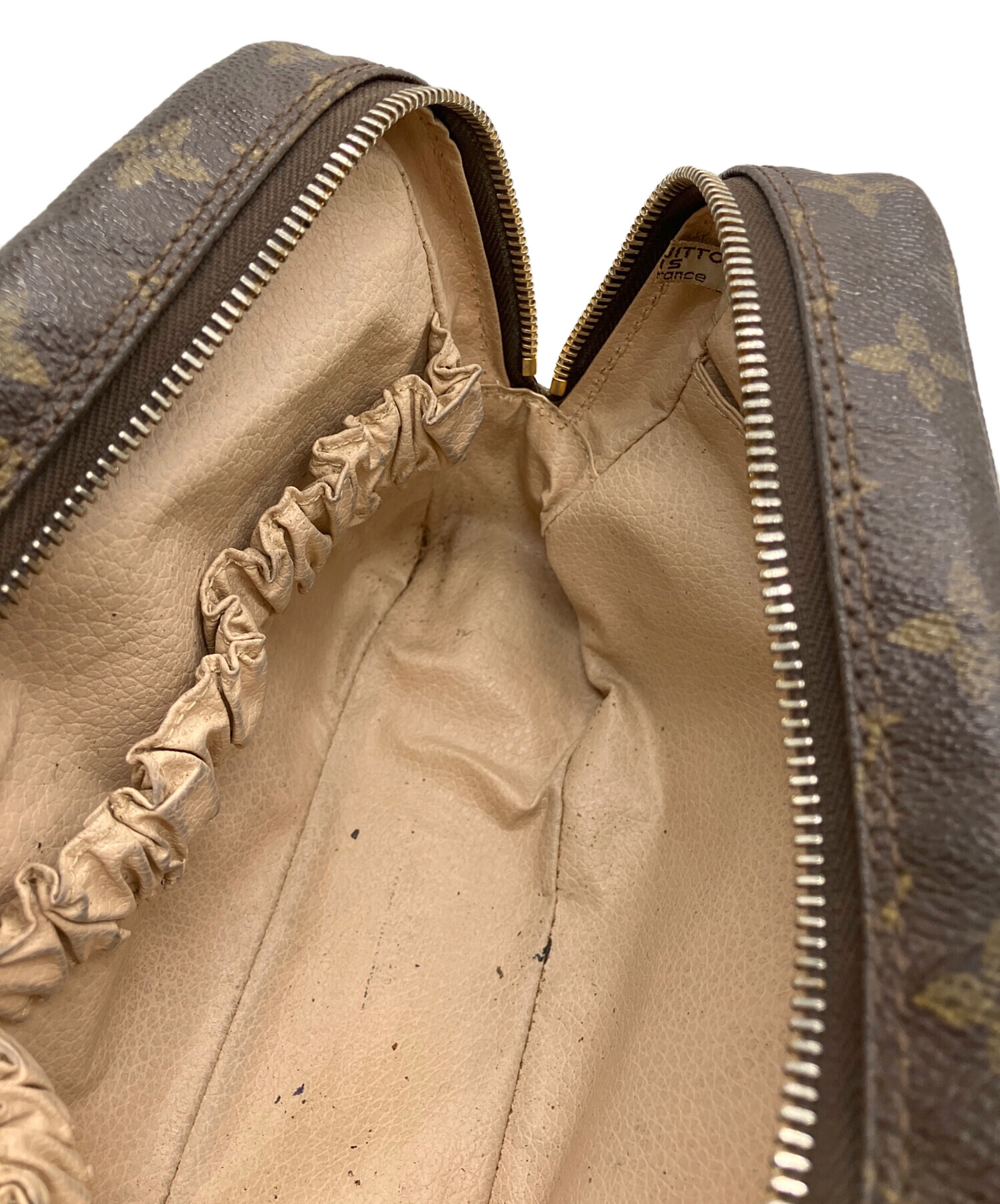 | 備考 | 全体的にややべたつき、本体に内部ヨゴレ、裂け、ジップ持ち手に使用感のあるUSEDのお品物です。 |