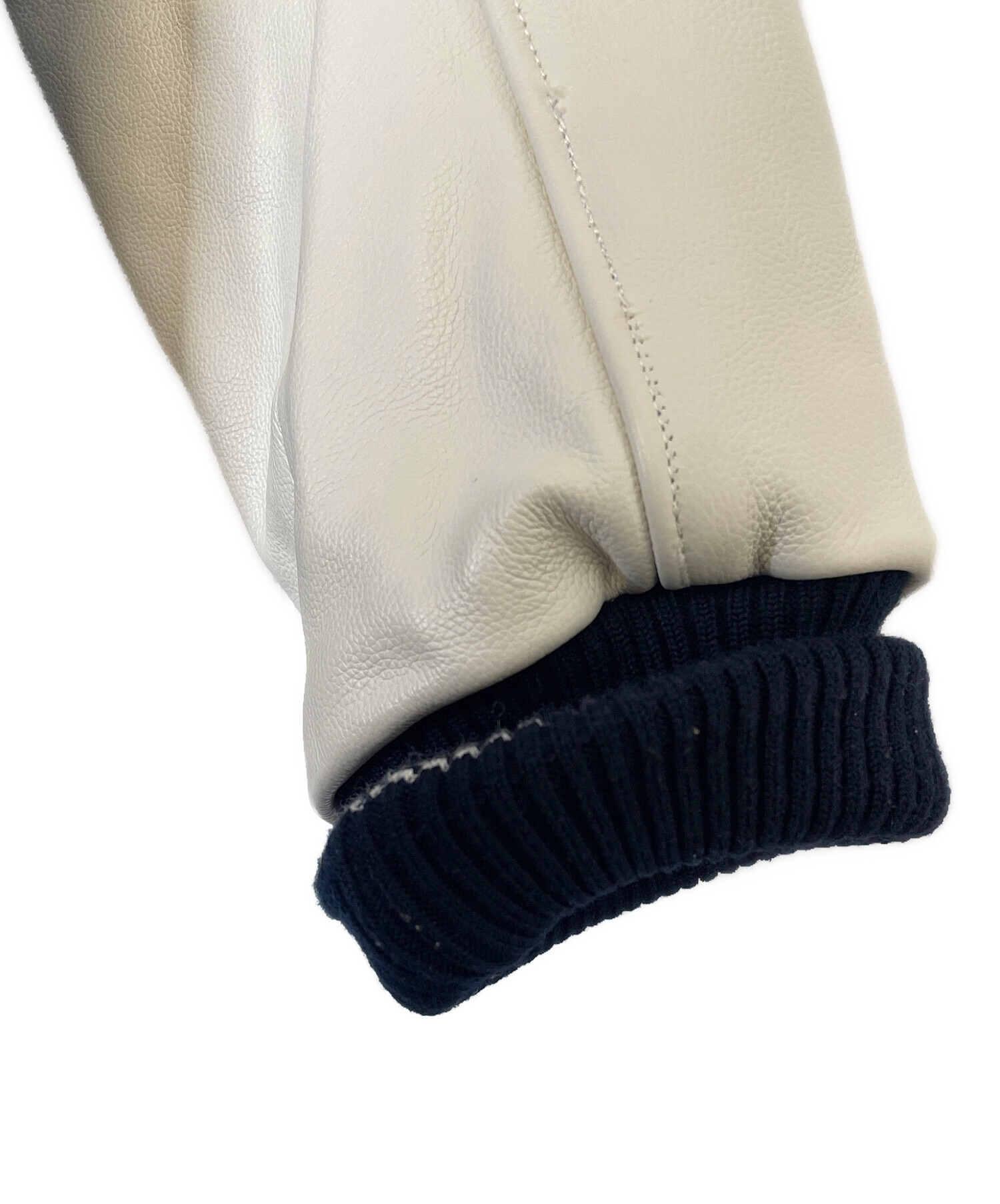 | 素材 | 表地身頃:ウール62% ポリエステル29% アクリル5% レーヨン3% ナイロン1% 表地袖、ポケット口、衿吊り、ネーム台:牛革 中綿:ポリエステル100% 裏地:ポリエステル100% リブ:アクリル63% ウール27% ポリエステル9% ポリウレタン1% |