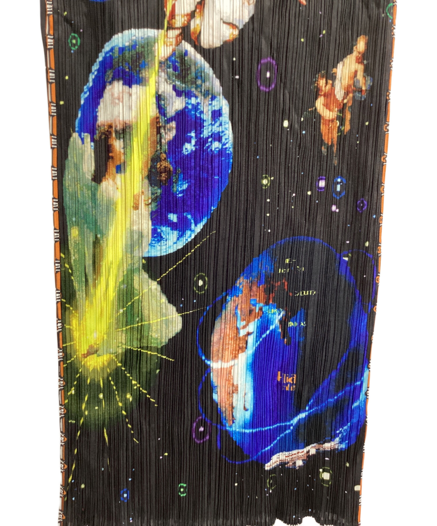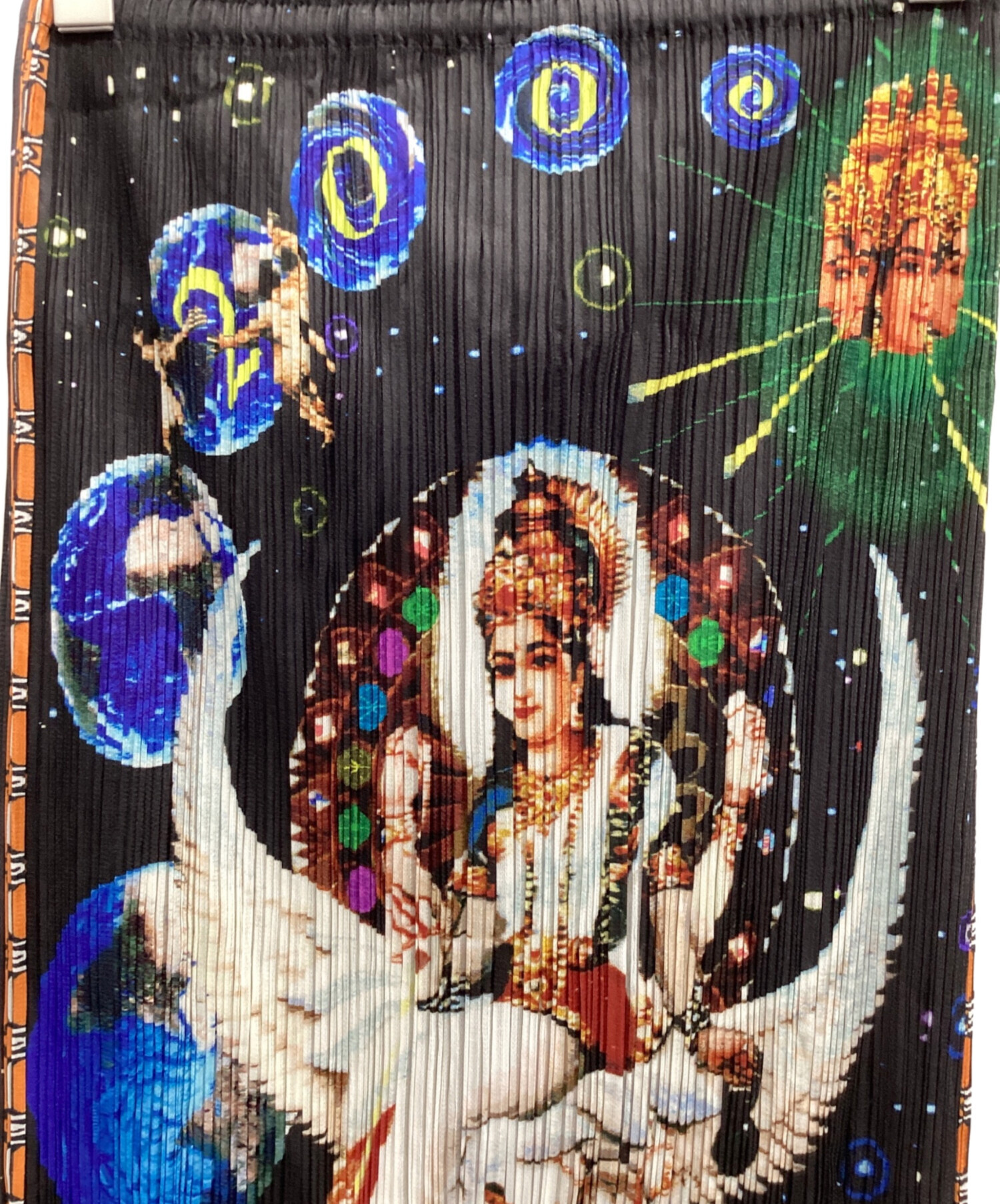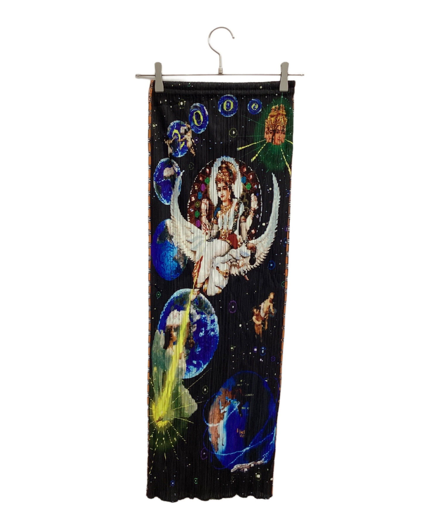 | スタッフコメント | 人気ブランドPLEATS PLEASE(プリーツプリーズ)の中でも一際異彩を放つこのスカートは、アーティスト横尾美美とのコラボレーション。前面に配されたインドや西洋の神々、そして惑星をはじめとする宇宙、これは森羅万象を超越した一着であり、また背面に広がる星々は無であり解脱、阿頼耶識なのかもしれません。 |