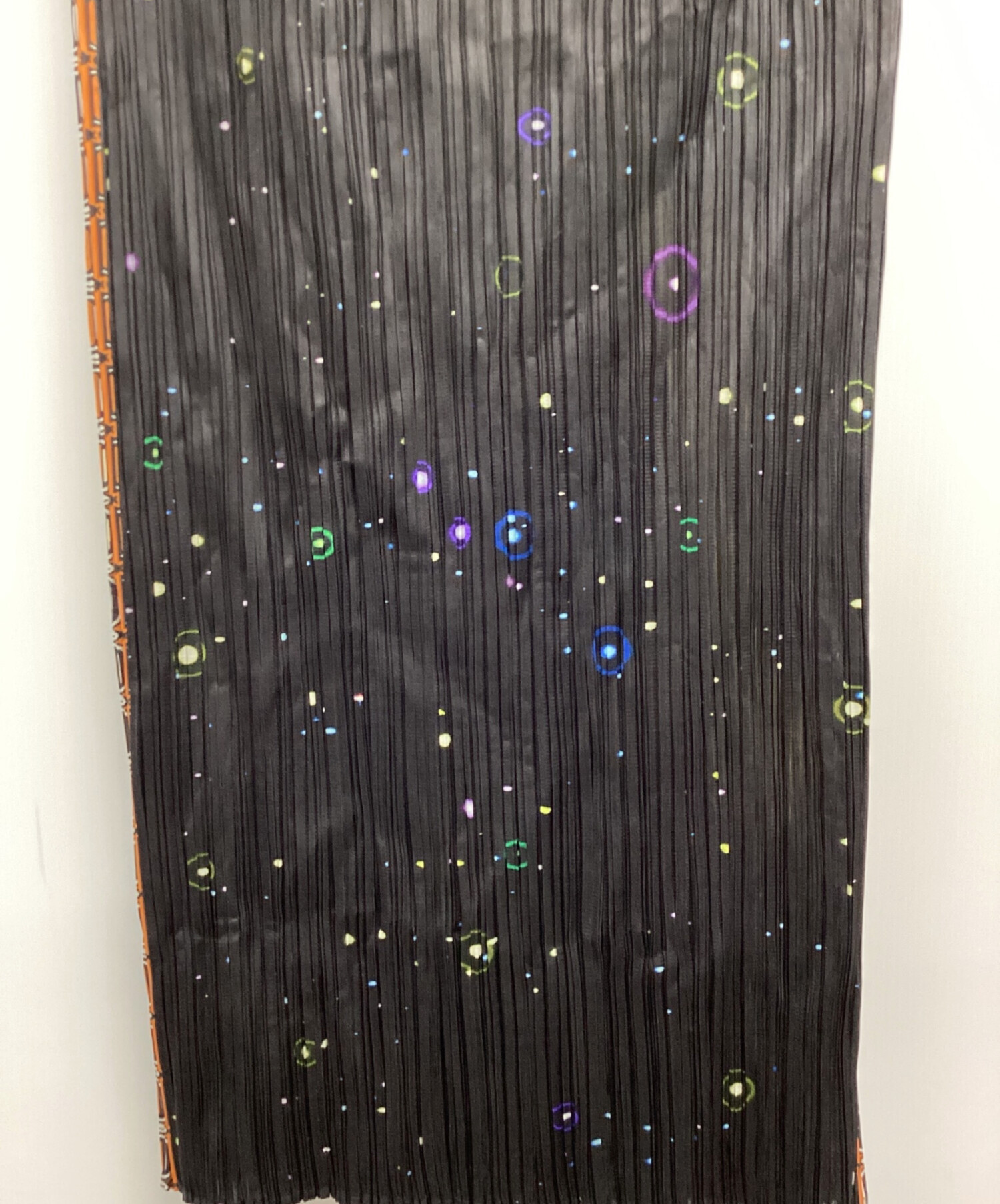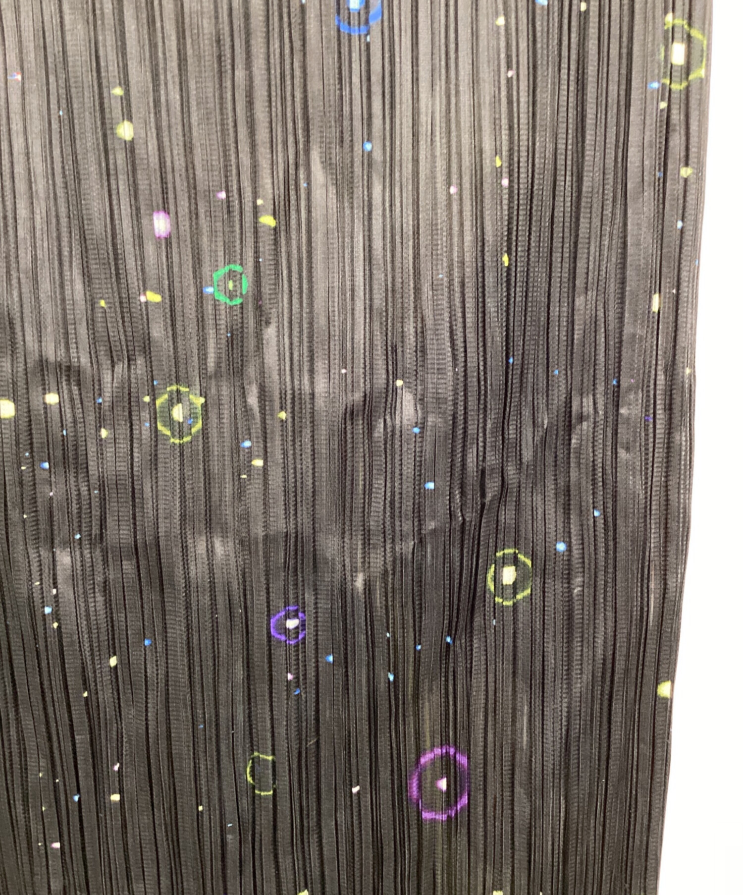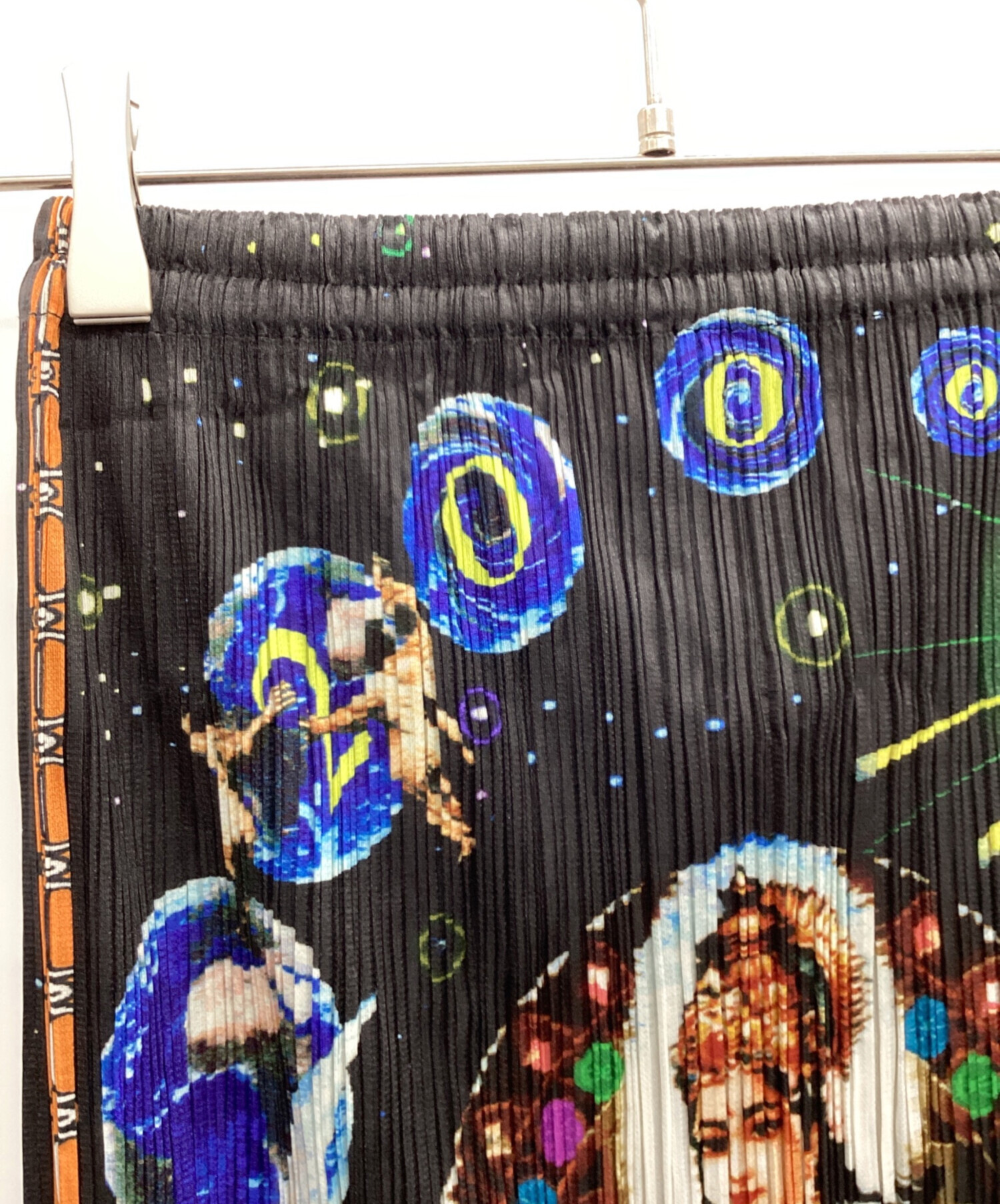 | スタッフコメント | 人気ブランドPLEATS PLEASE(プリーツプリーズ)の中でも一際異彩を放つこのスカートは、アーティスト横尾美美とのコラボレーション。前面に配されたインドや西洋の神々、そして惑星をはじめとする宇宙、これは森羅万象を超越した一着であり、また背面に広がる星々は無であり解脱、阿頼耶識なのかもしれません。 |