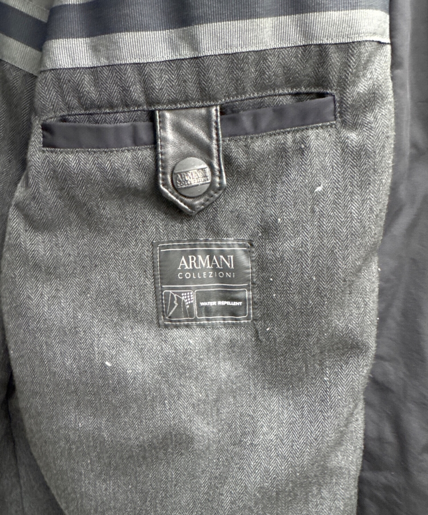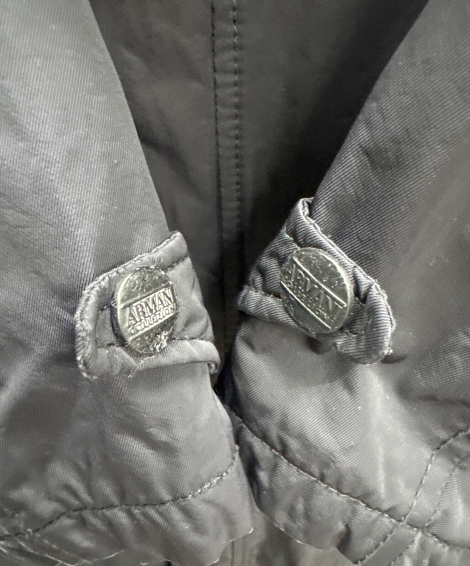 • ARMANI COLLEZIONI(アルマーニ コレツィオーニ)ARMANI COLLEZIONI (アルマーニ コレツィオーニ) レザー切替コート ブラック サイズ:46の古着・服飾アイテム 首元ボタンにべた付き有