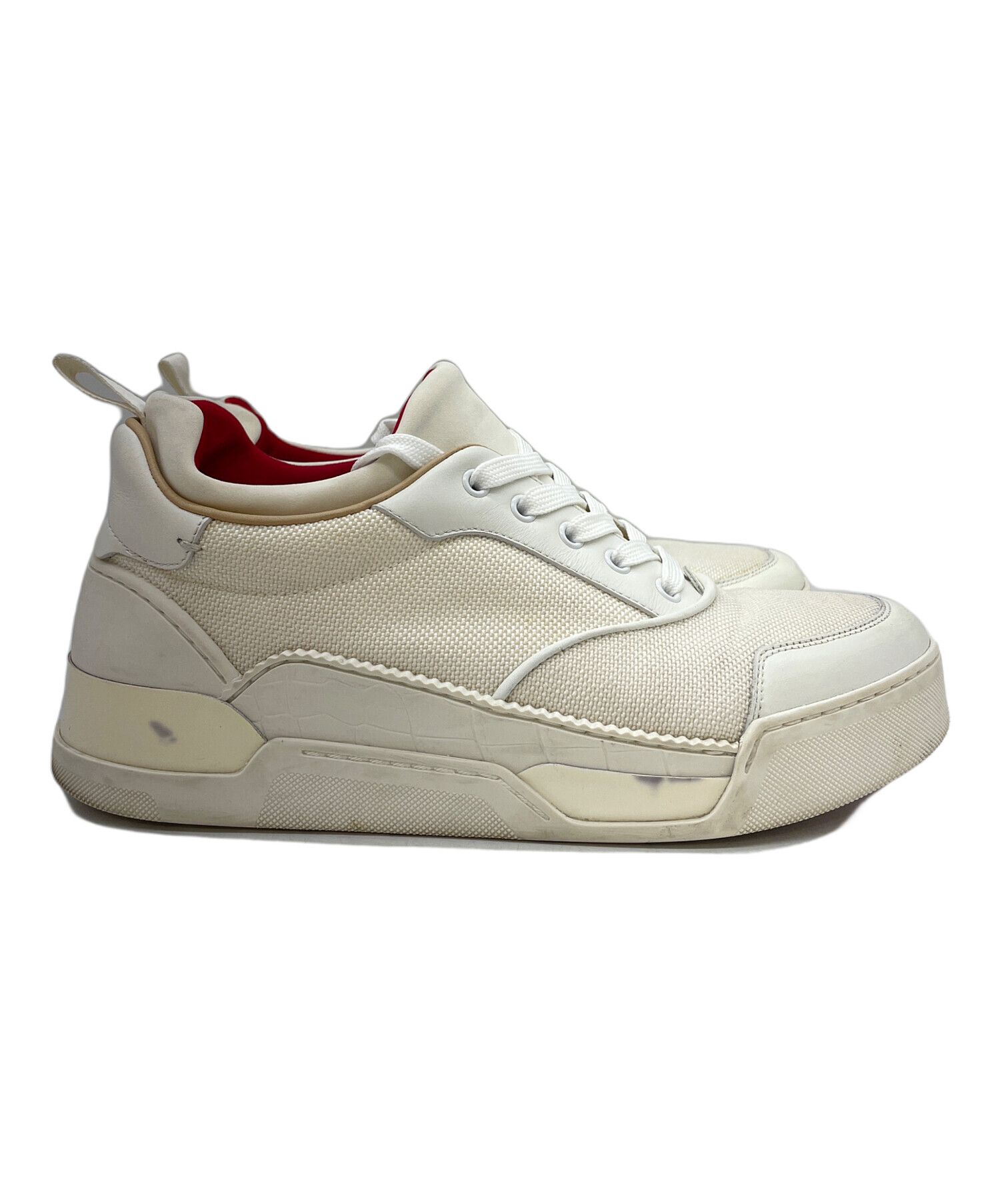| スタッフコメント | ホワイトのワントーンが、AURELIENの特徴である複雑なデザインを際立たせているローカットスニーカーです。 ルブタンの「赤」を使用したシューライナーが、着脱のしやすい履き心地も備えています。 |