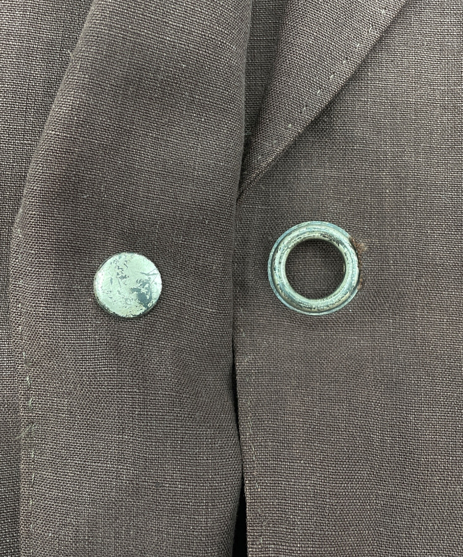 前身頃の正面中央のハトメにスレやヨゴレ、ハガレ、サビ、生地の飛び出しがございます。(画像11枚目参照)