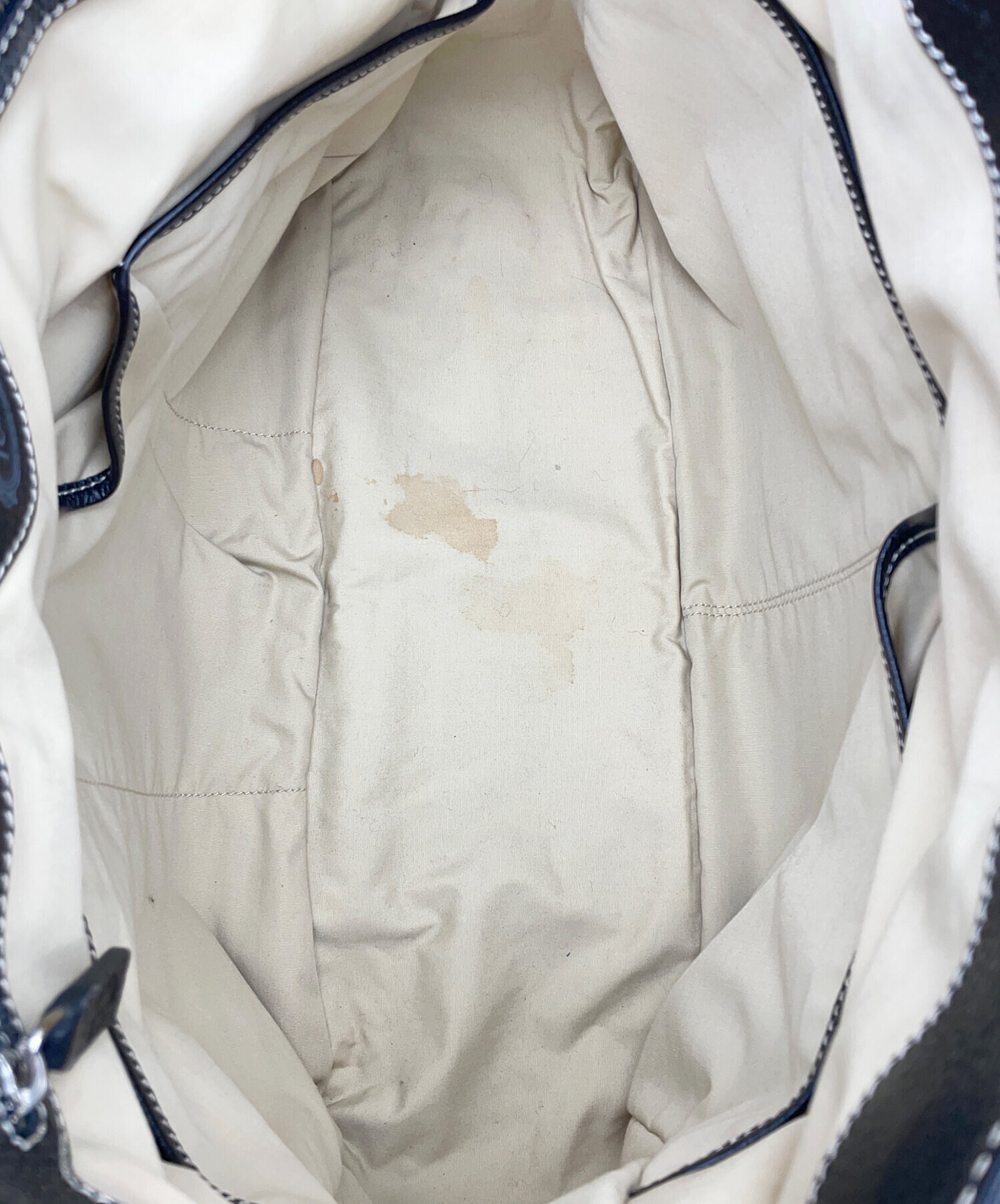 | 状態 | 内面の底にシミがございます。(画像5、19枚目参照) ロゴ装飾上にキズがございます。(画像7、9、10枚目参照) 袋口コバの両端に、ワレがございます。(画像11、12枚目参照) 持ち手と見返しのレザー部分に、変色がございます。(画像17、18枚目参照) こちらの商品は中古品の為、使用に伴います細かなキズ、汚れがございます。店頭にて展示販売を行っている為、記載に無い細かなキズ、汚れが見受けられる場合がございます。 |