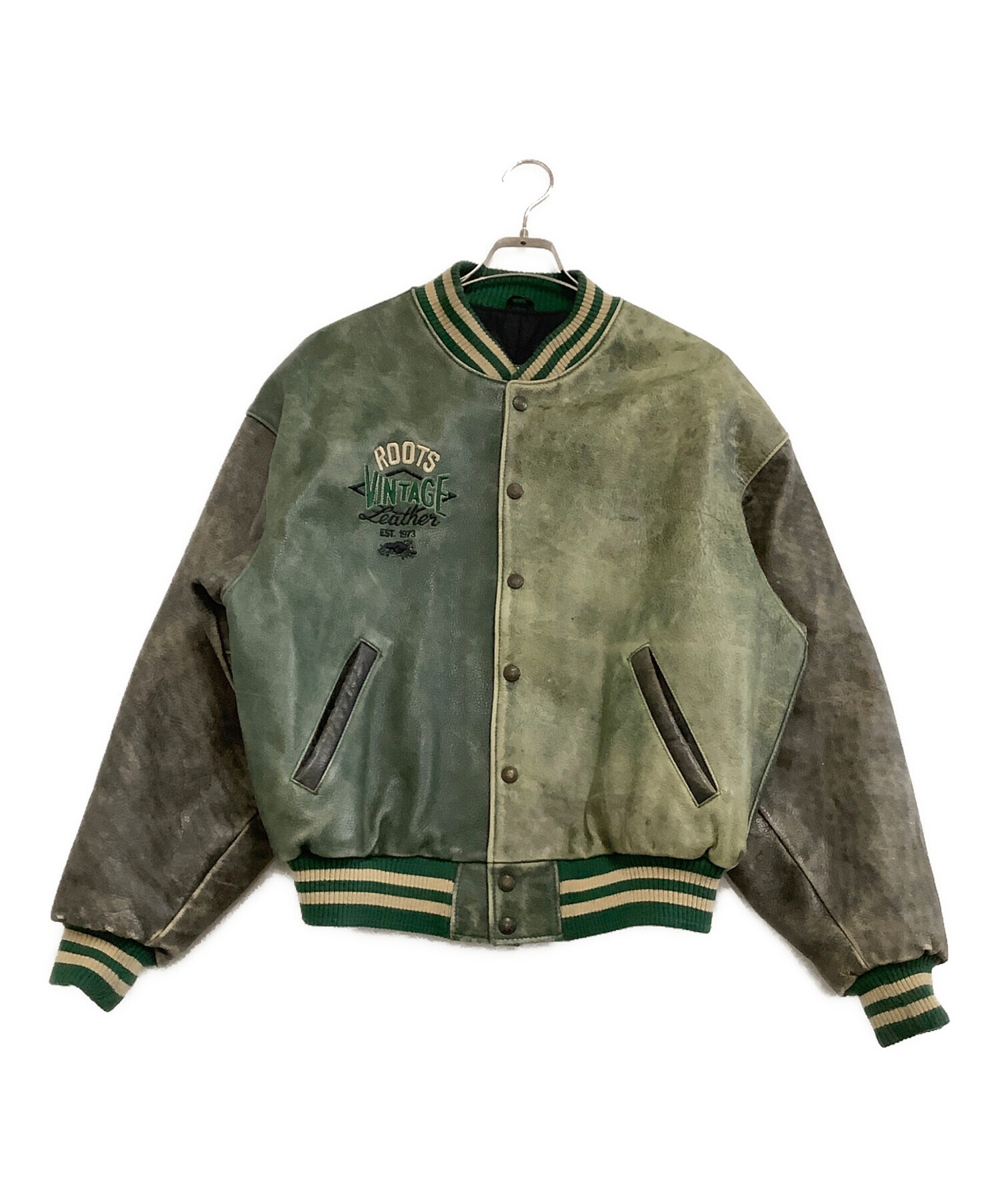 • Roots(ルーツ)Roots (ルーツ) 刺繍ワッペンオールレザースタジャン グリーン×グレー サイズ:Lの古着・服飾アイテム 袖穴スレ有