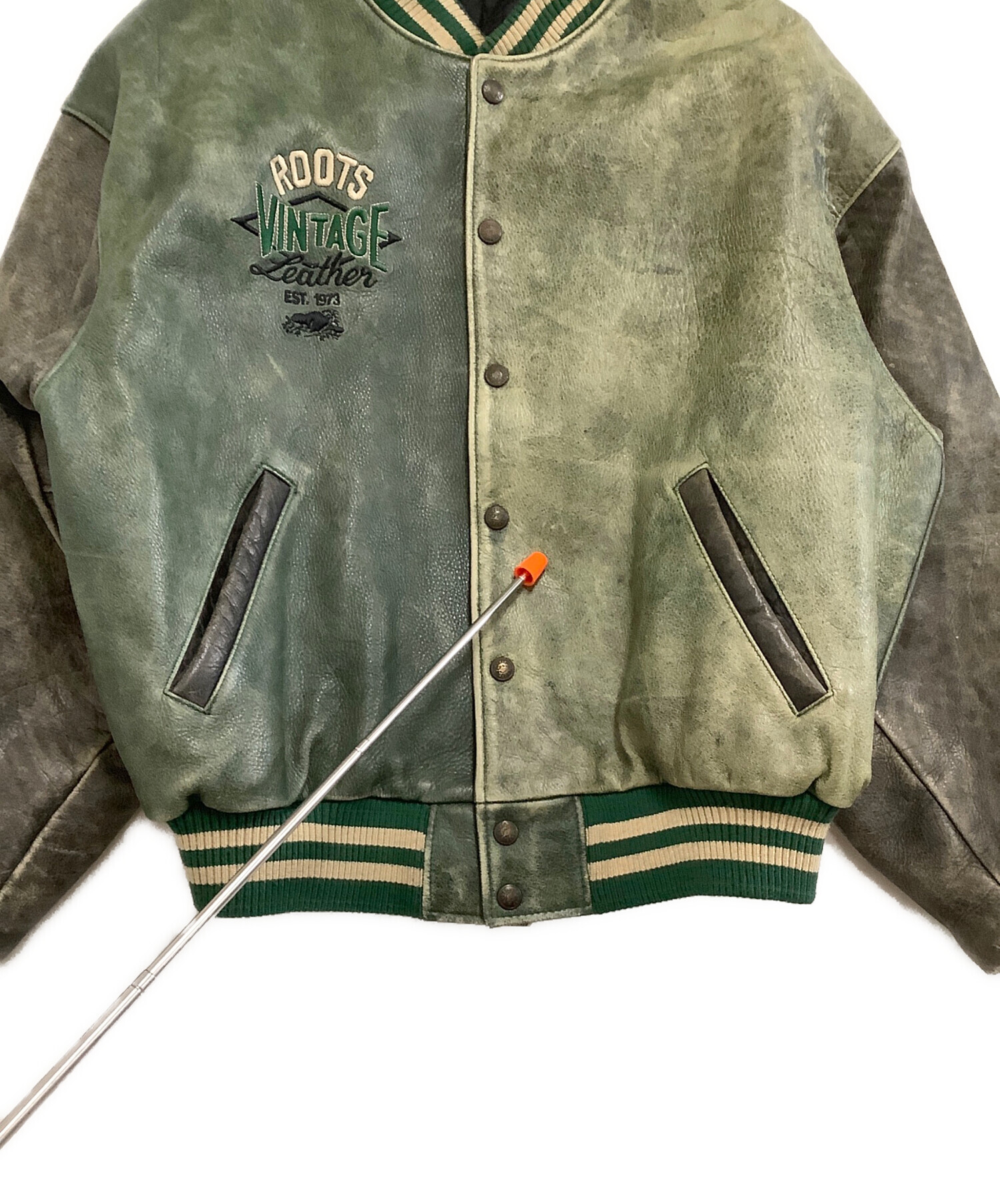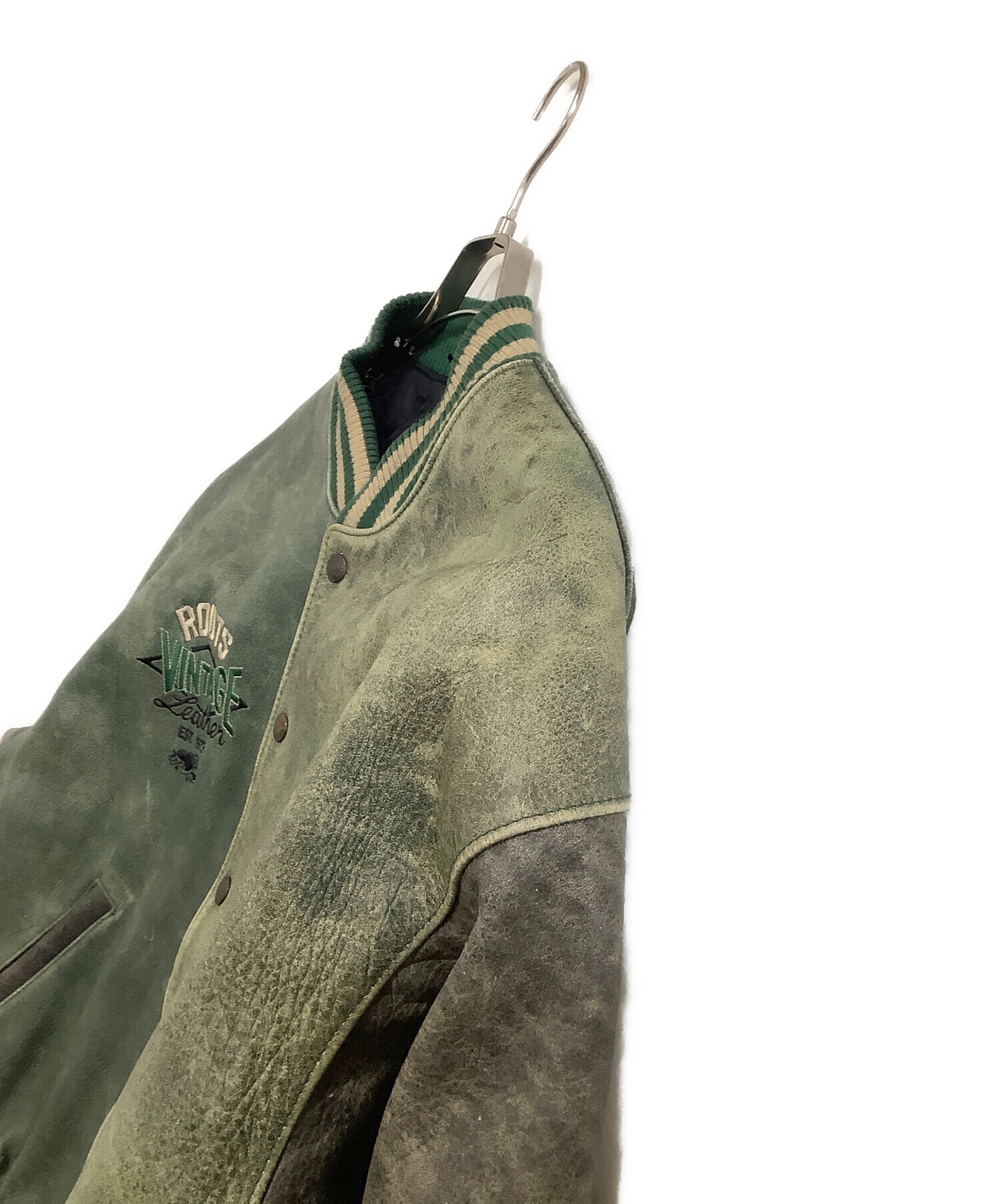 • Roots(ルーツ)Roots (ルーツ) 刺繍ワッペンオールレザースタジャン グリーン×グレー サイズ:Lの古着・服飾アイテム スレ有
