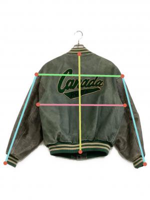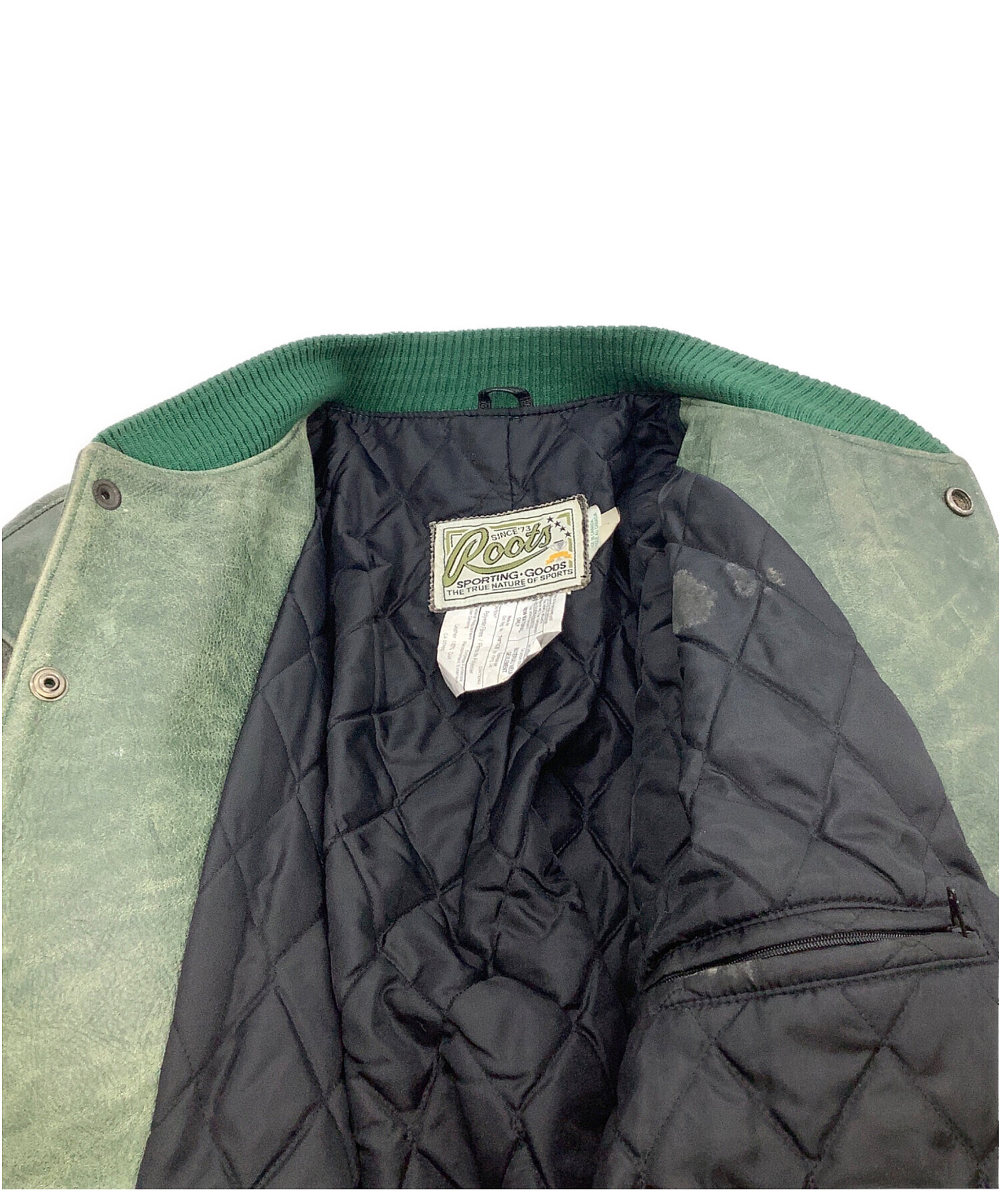 • Roots(ルーツ)Roots (ルーツ) 刺繍ワッペンオールレザースタジャン グリーン×グレー サイズ:Lの古着・服飾アイテム 内部ヨゴレ毛玉有