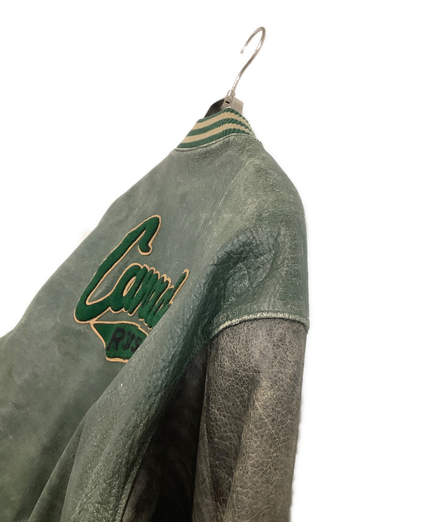 • Roots(ルーツ)Roots (ルーツ) 刺繍ワッペンオールレザースタジャン グリーン×グレー サイズ:Lの古着・服飾アイテム 袖内部毛玉有