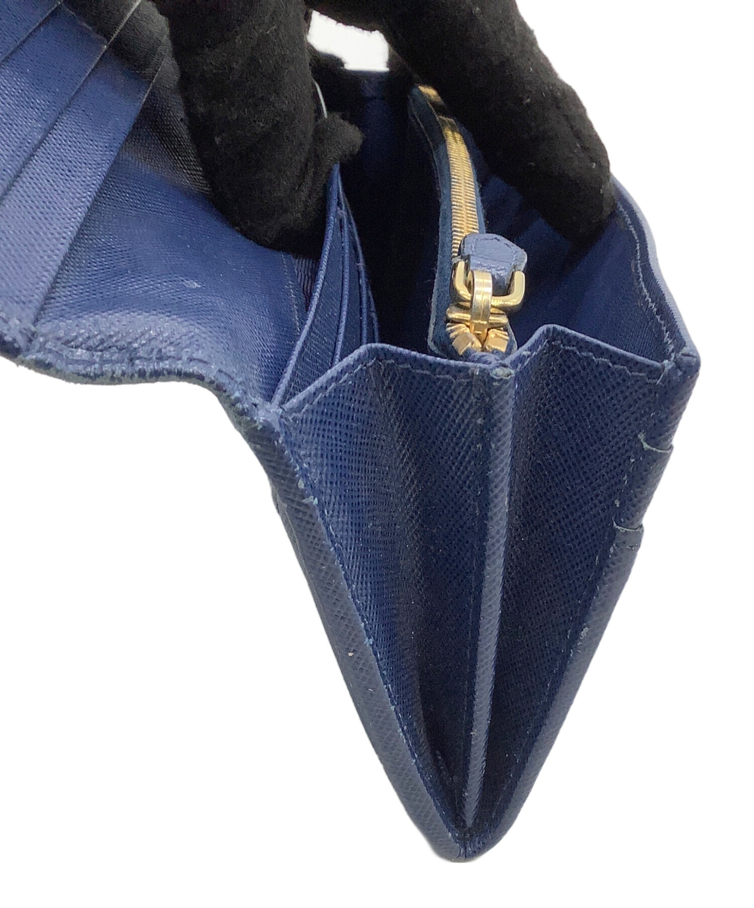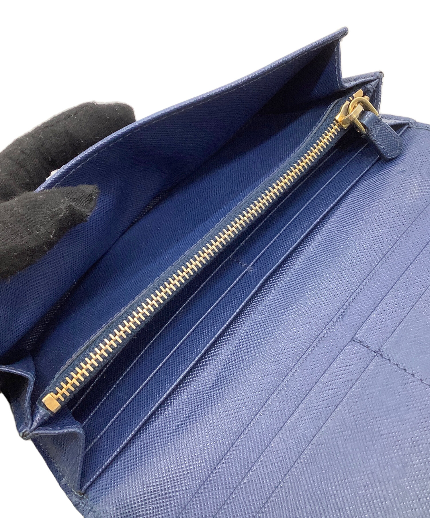 • PRADA(プラダ)PRADA (プラダ) 長財布 サフィアーノ ネイビー×ゴールドの古着・服飾アイテム 跡、ファスナー金具メッキハガレキズ有
