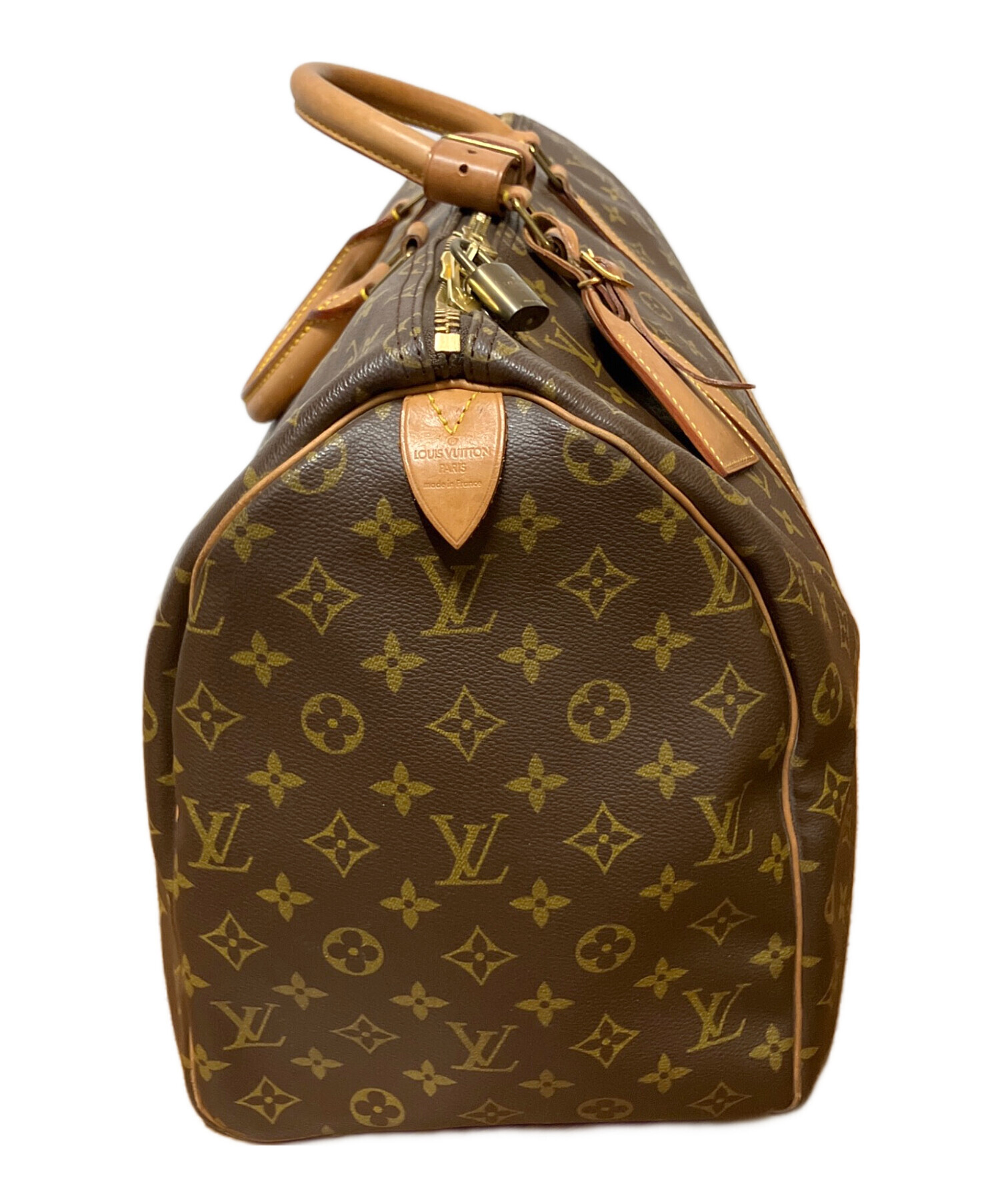 | 状態 | こちらの商品は中古品の為、使用に伴いますハンドルベルトなどにシミ、レザーのふちにスレキズ、金属部に軽い緑青の浮かび上がりなど劣化が見受けられます。またジッパーの動作に不調が見受けられます。店頭にて展示販売を行っている為、記載に無い細かなキズ、汚れが見受けられる場合がございます。 |