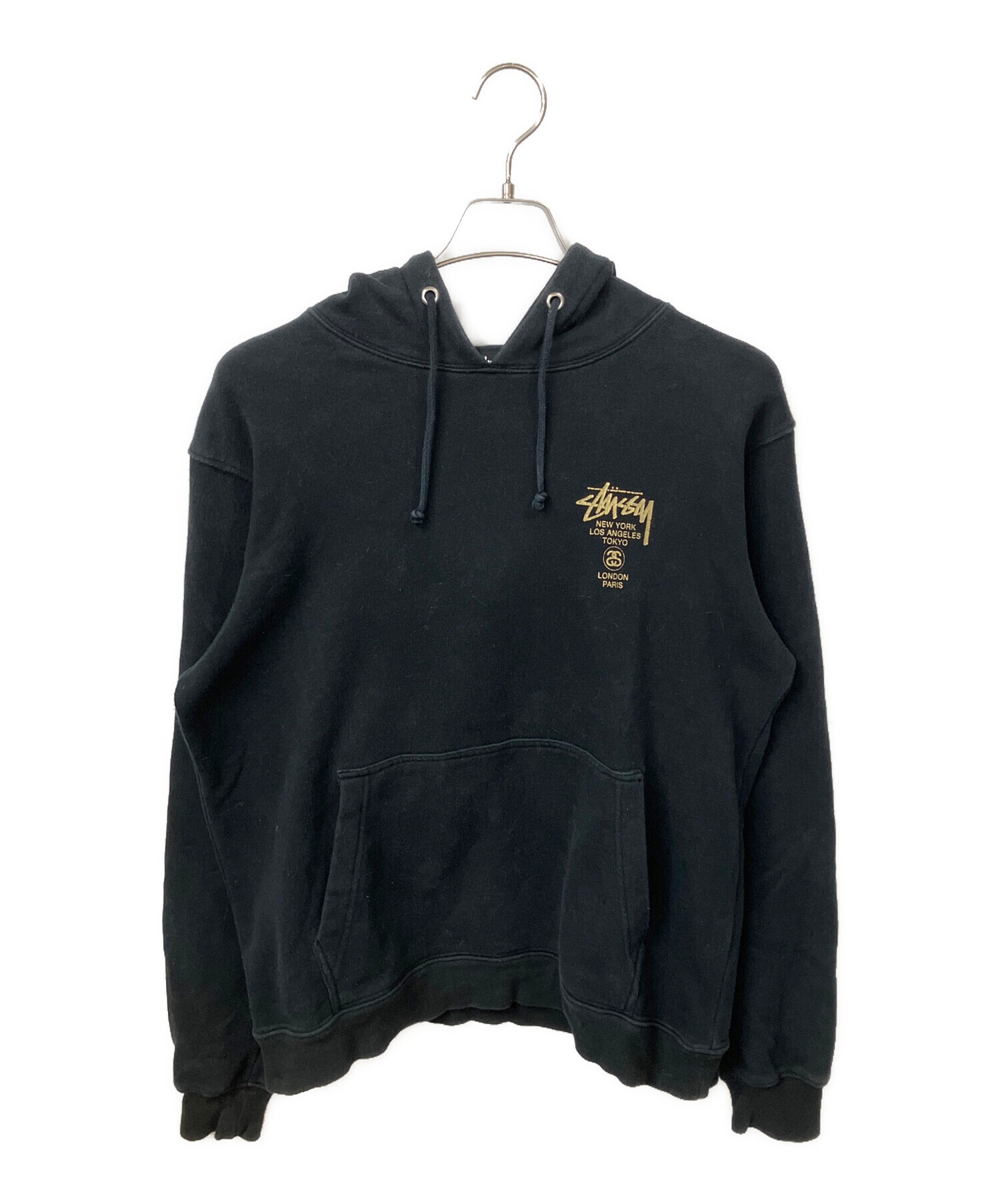 • stussy(ステューシー)stussy (ステューシー) WORLD TOUR HOODIE ブラック サイズ:Mの古着・服飾アイテム 袖色落ち有