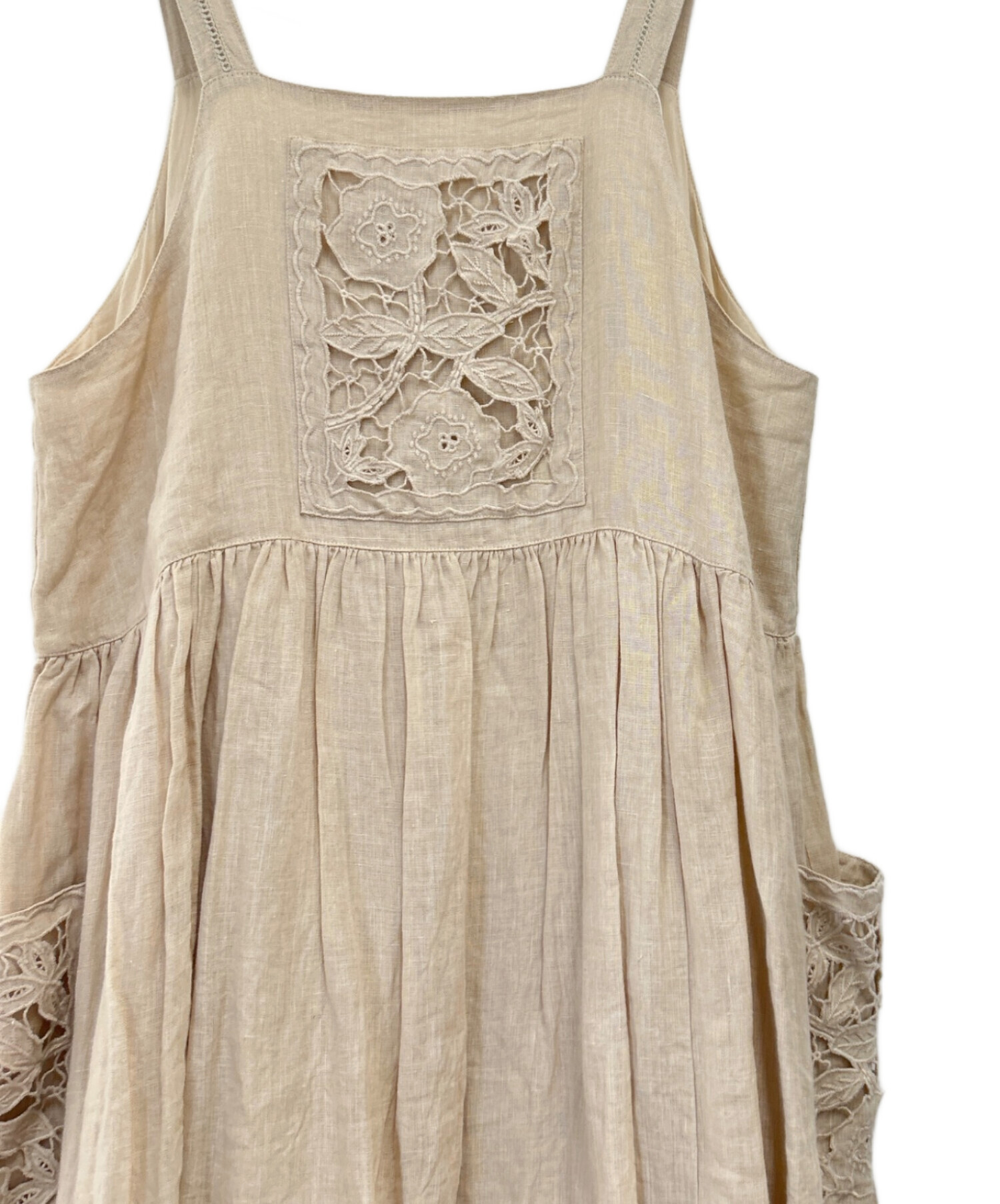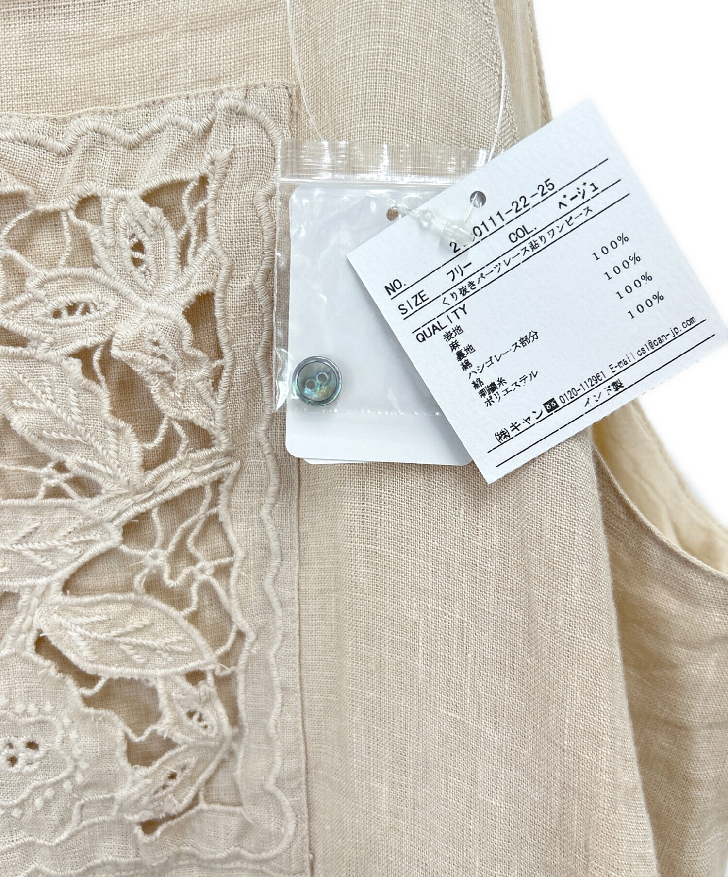 | 素材 | 本体 麻:100% 裏地 綿:100% ハシゴレース部分 綿:100% 刺繍糸 ポリエステル:100% |