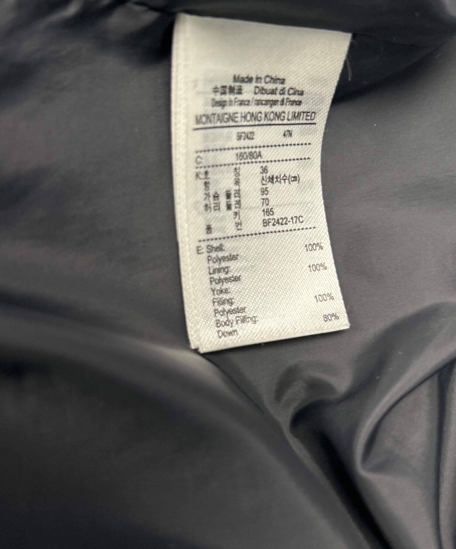 | 素材 | 表地 ポリエステル100% 裏地 ポリエステル100% 中綿 ポリエステル100% 身頃わた組形成 ダウン80% フェザー20% |