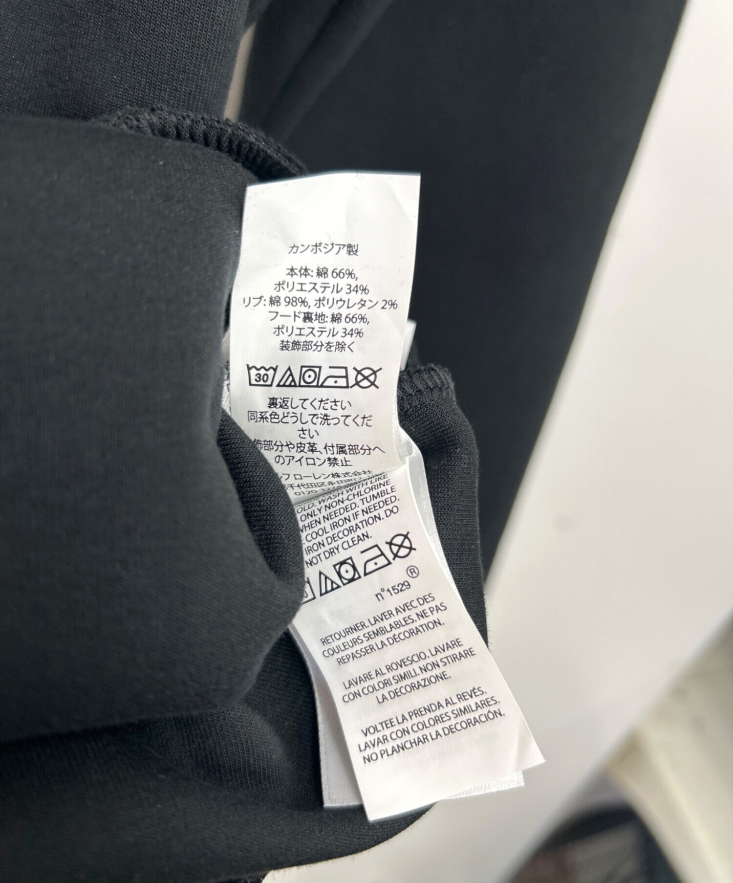 | 素材 | 本体 綿66% ポリエステル34% リブ部分 綿98% ポリウレタン2% フード裏地 綿66% ポリエステル34% 装飾部分を除く |