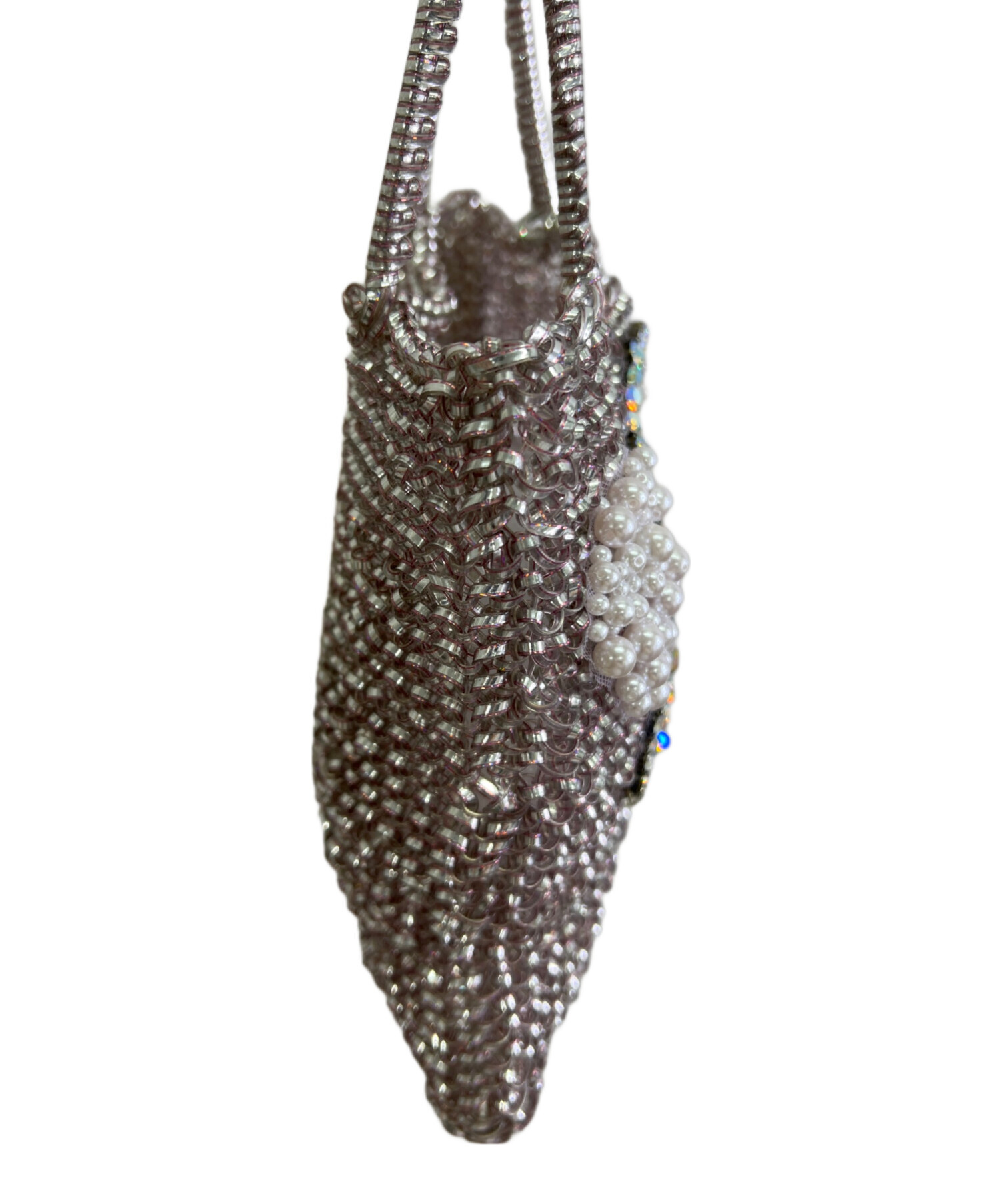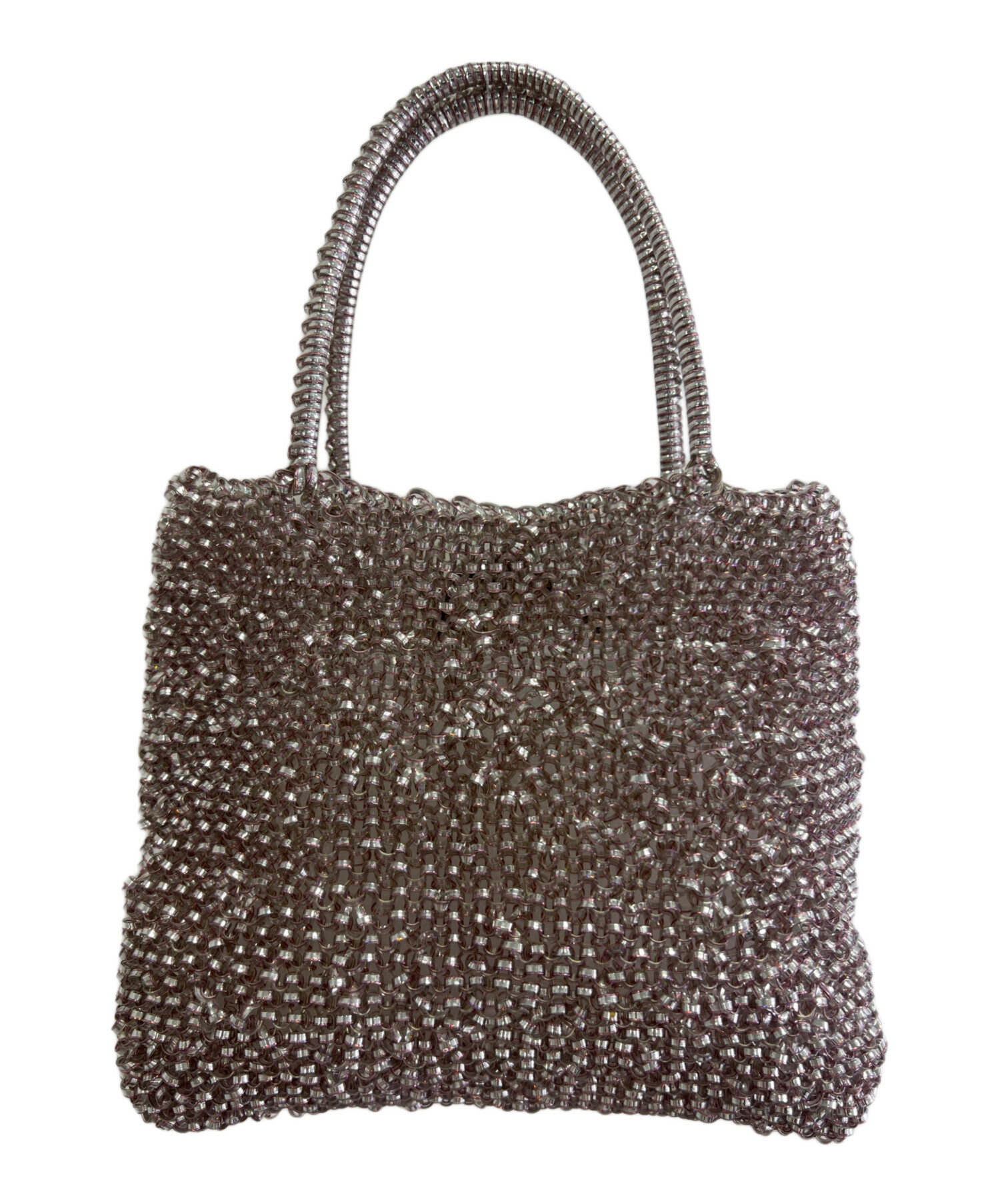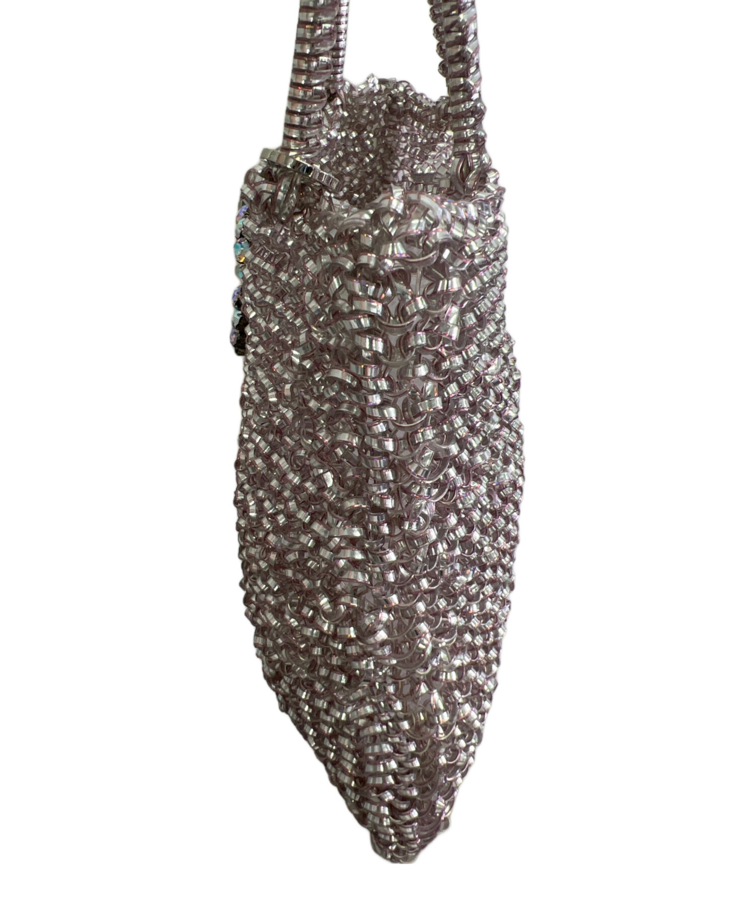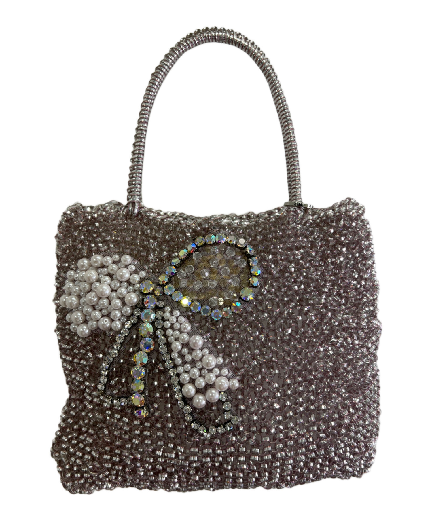 | スタッフコメント | ・定番のスクエア型で程よいサイズ感のワイヤーバッグ。 ・光の角度でキラキラ輝き、ラインストーンとパールでデザインされたリボンがポイント。 |