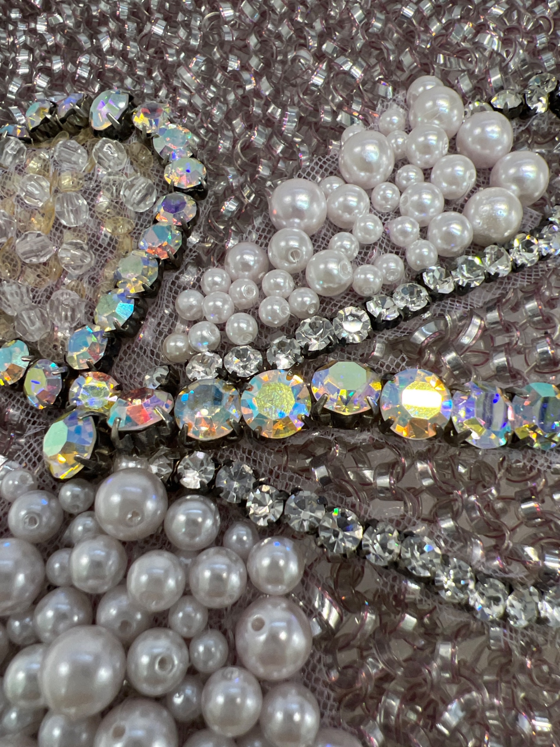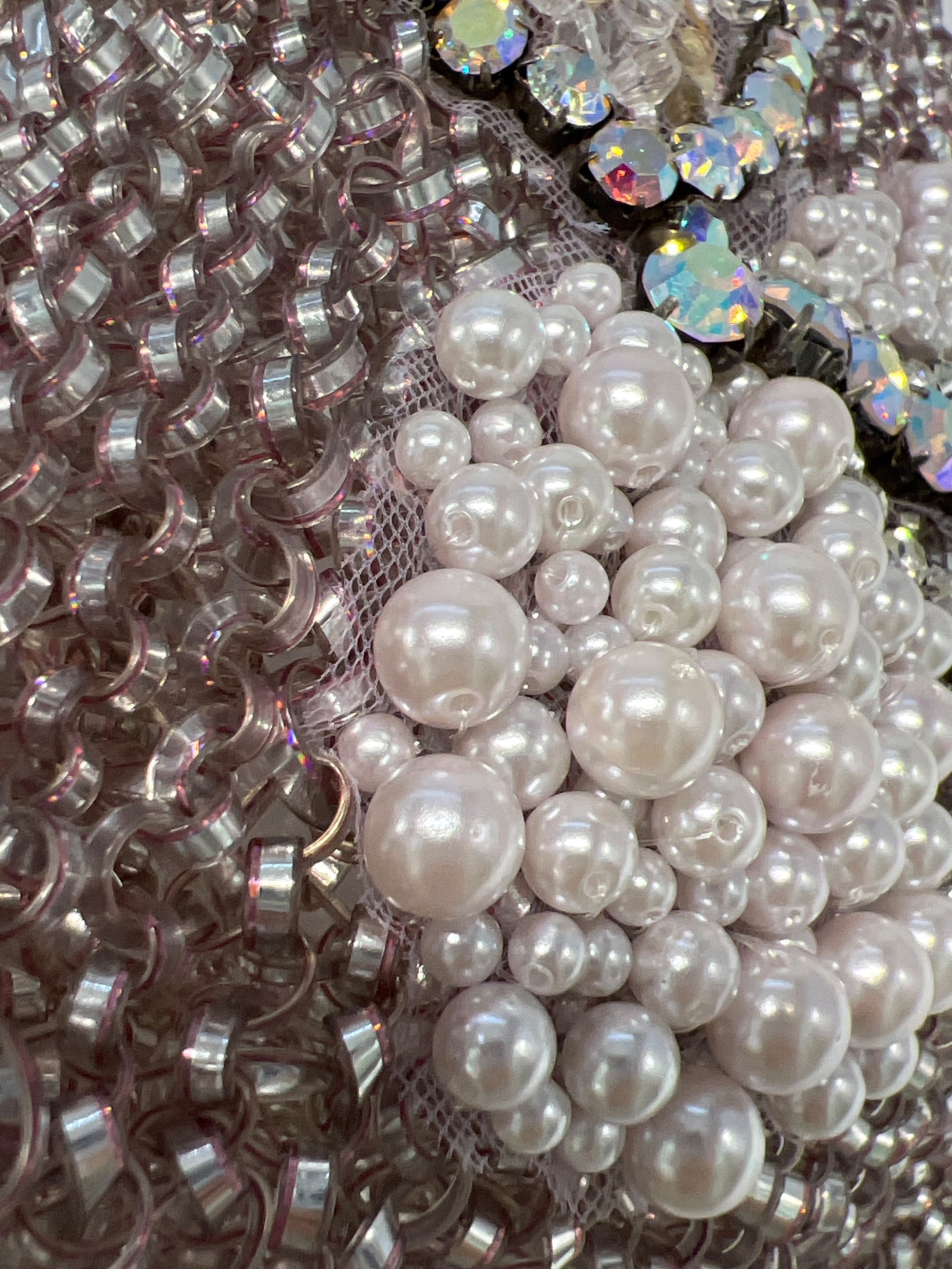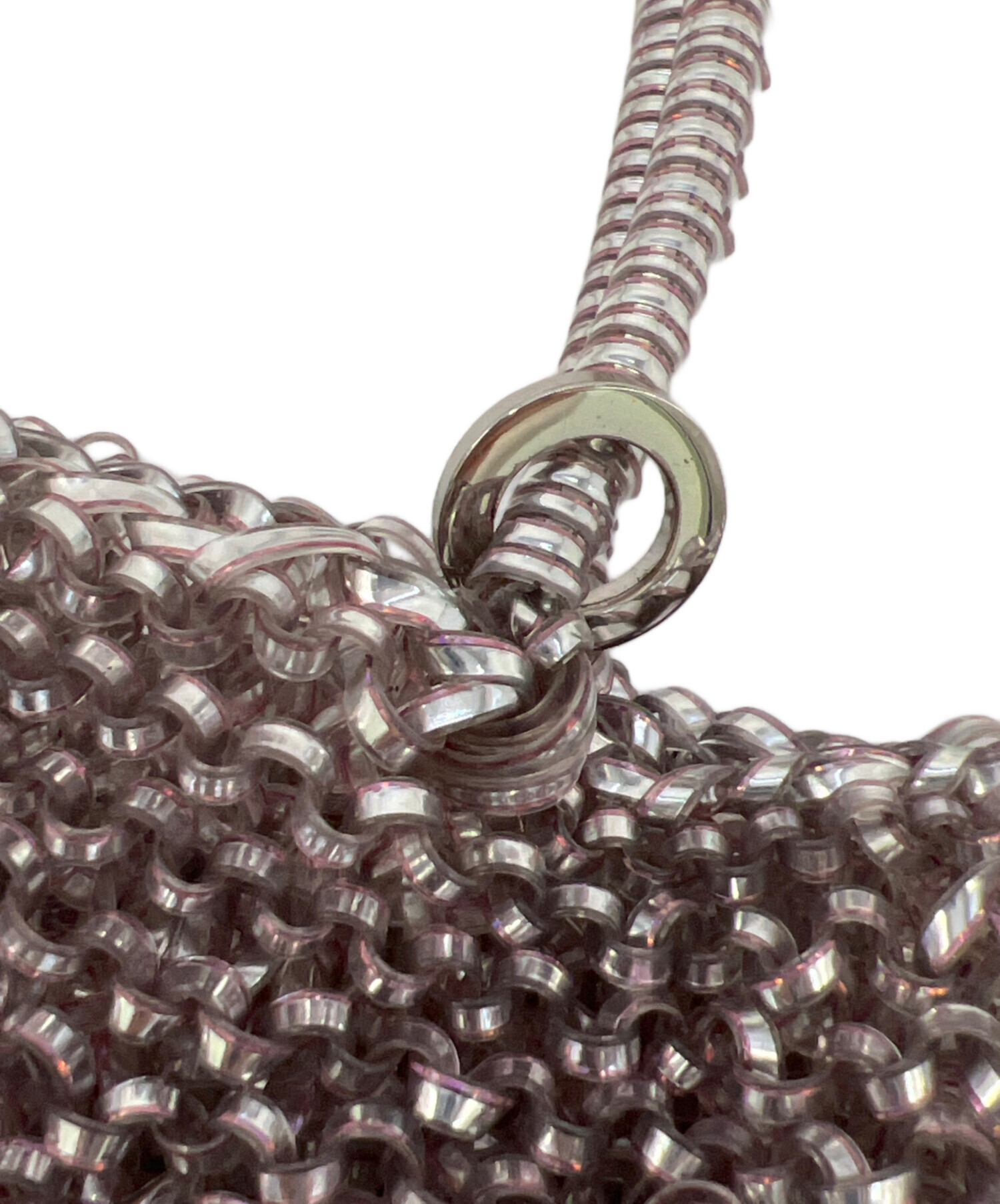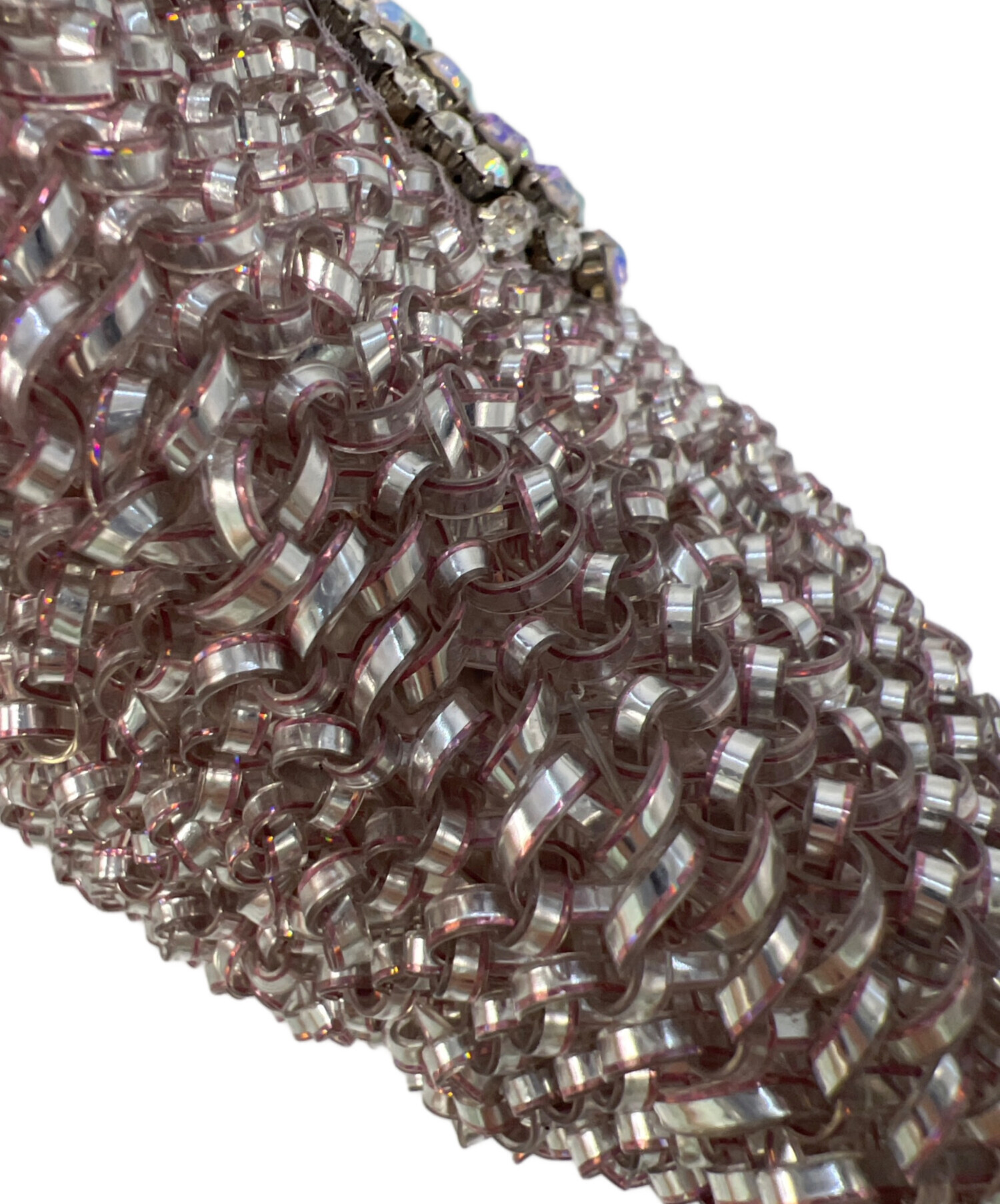 | スタッフコメント | ・定番のスクエア型で程よいサイズ感のワイヤーバッグ。 ・光の角度でキラキラ輝き、ラインストーンとパールでデザインされたリボンがポイント。 |