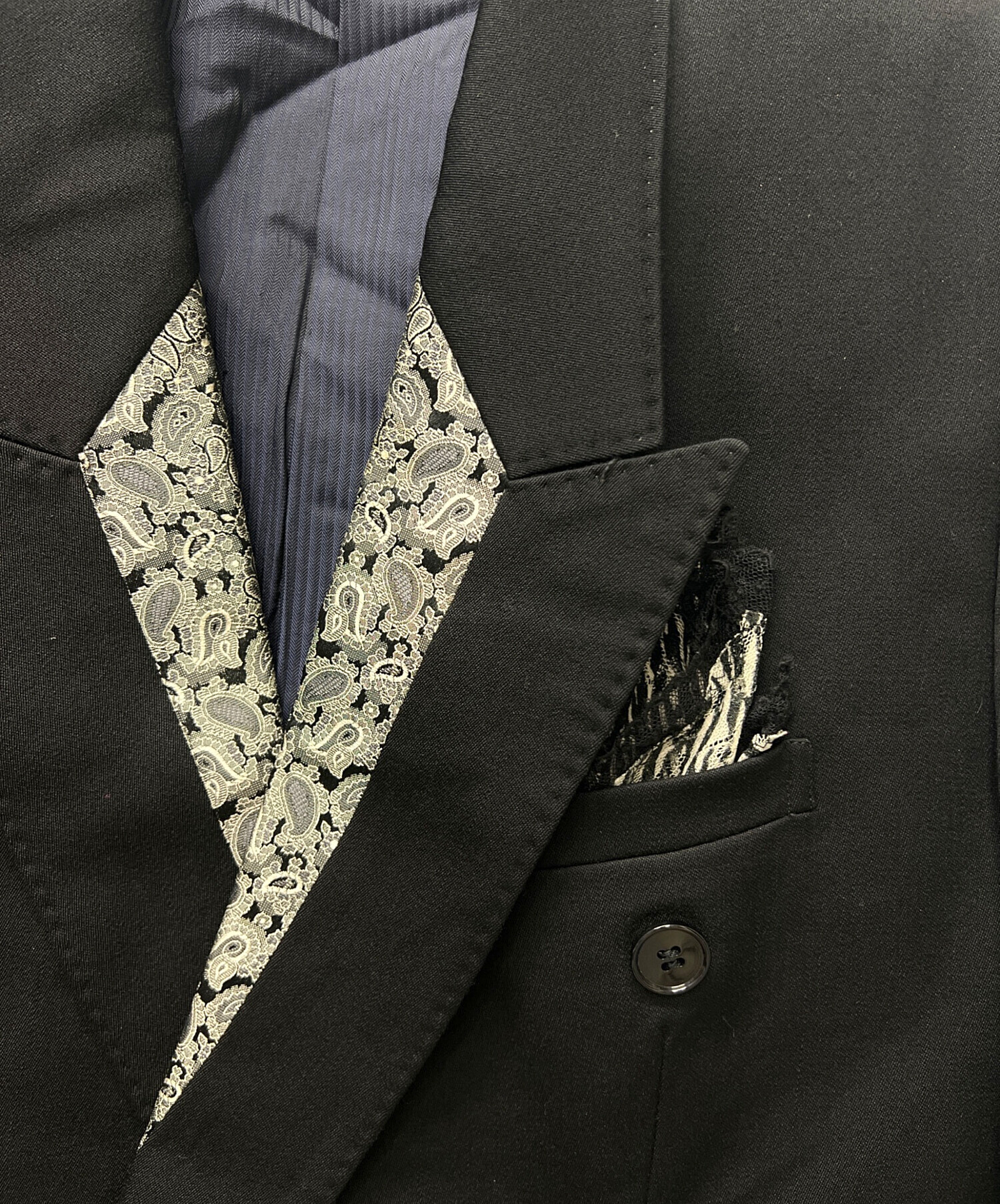 | 素材 | ジャケット: 毛 100% 裏地: キュプラ 100% 衿部分: 絹 100% パンツ: 毛 100% |
