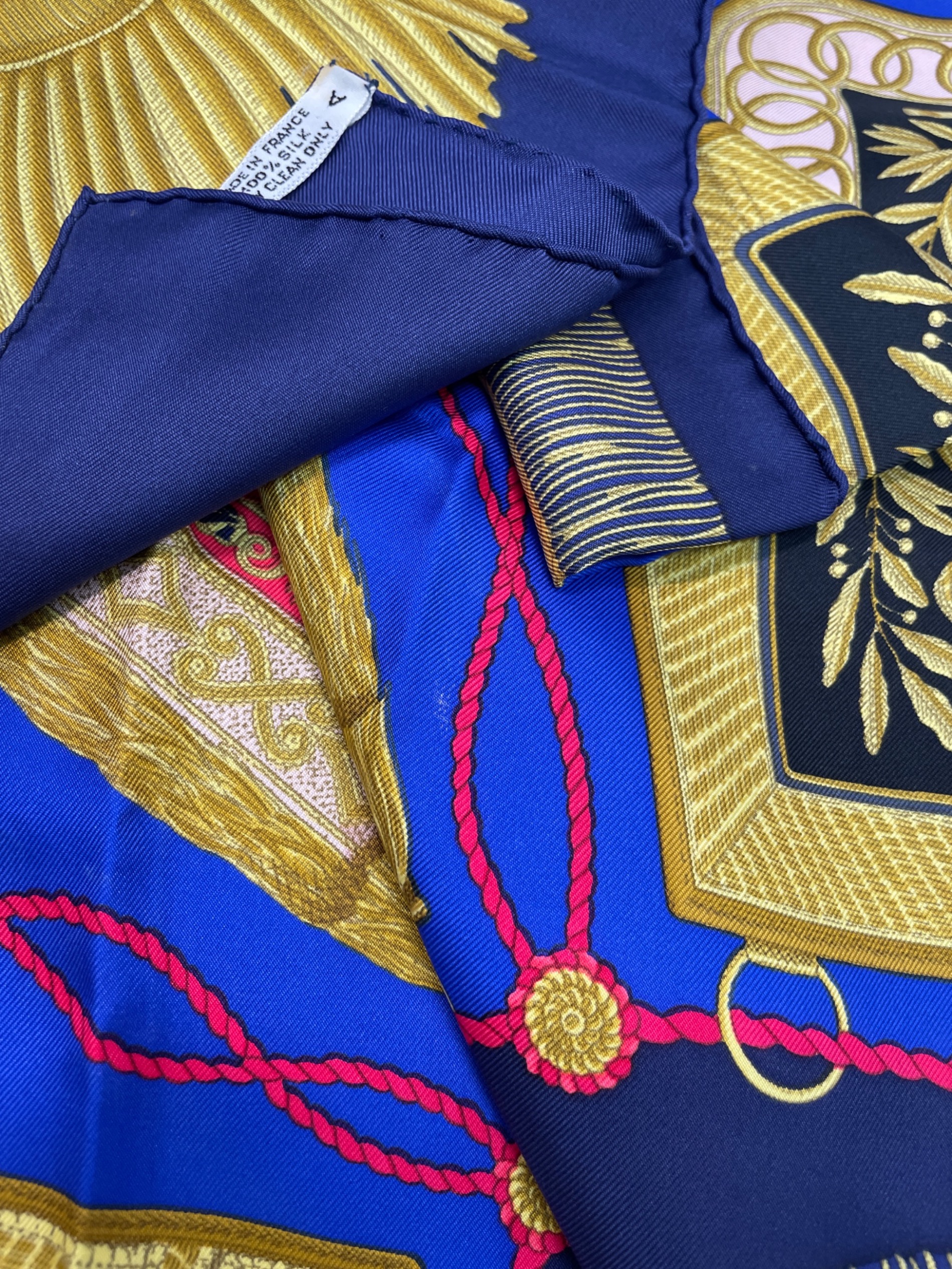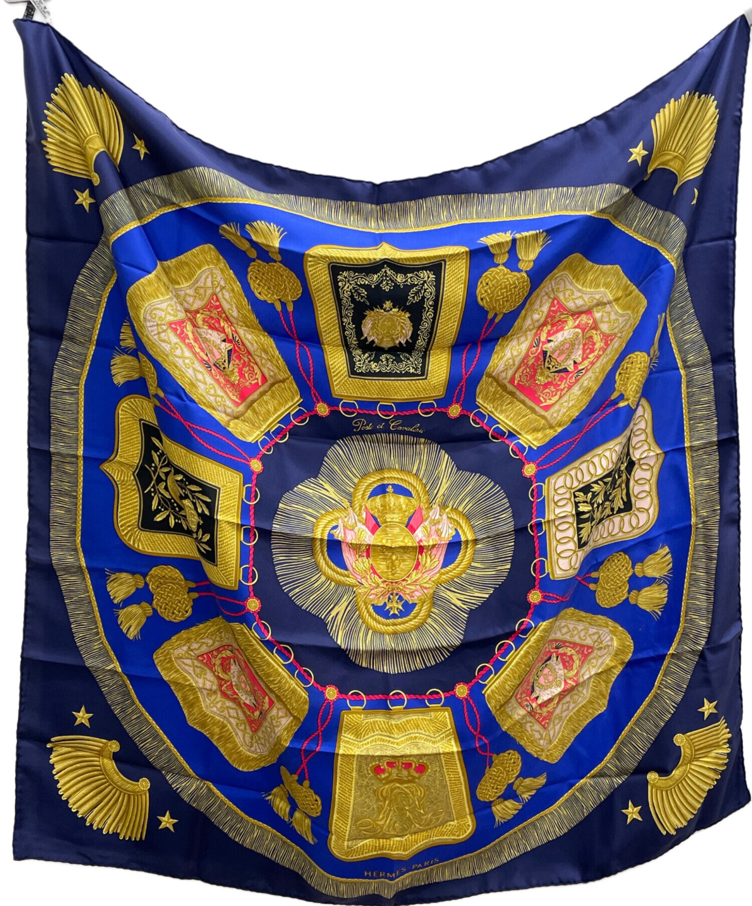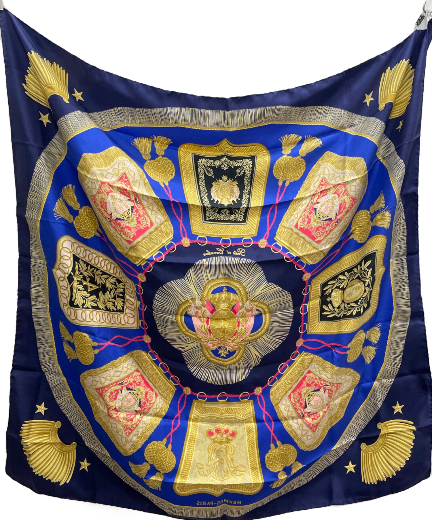 | スタッフコメント | 百合の紋章や王冠、タッスルなど気品溢れるモチーフが散りばめられたデザイン。使い方次第で何通りも楽しめるカレ90の中でもミリタリーテイストを感じられるアイテム。 |