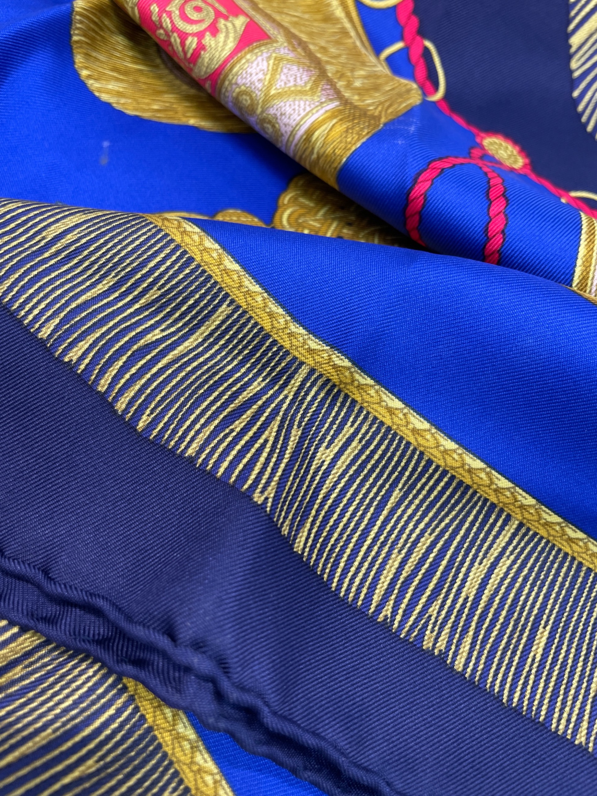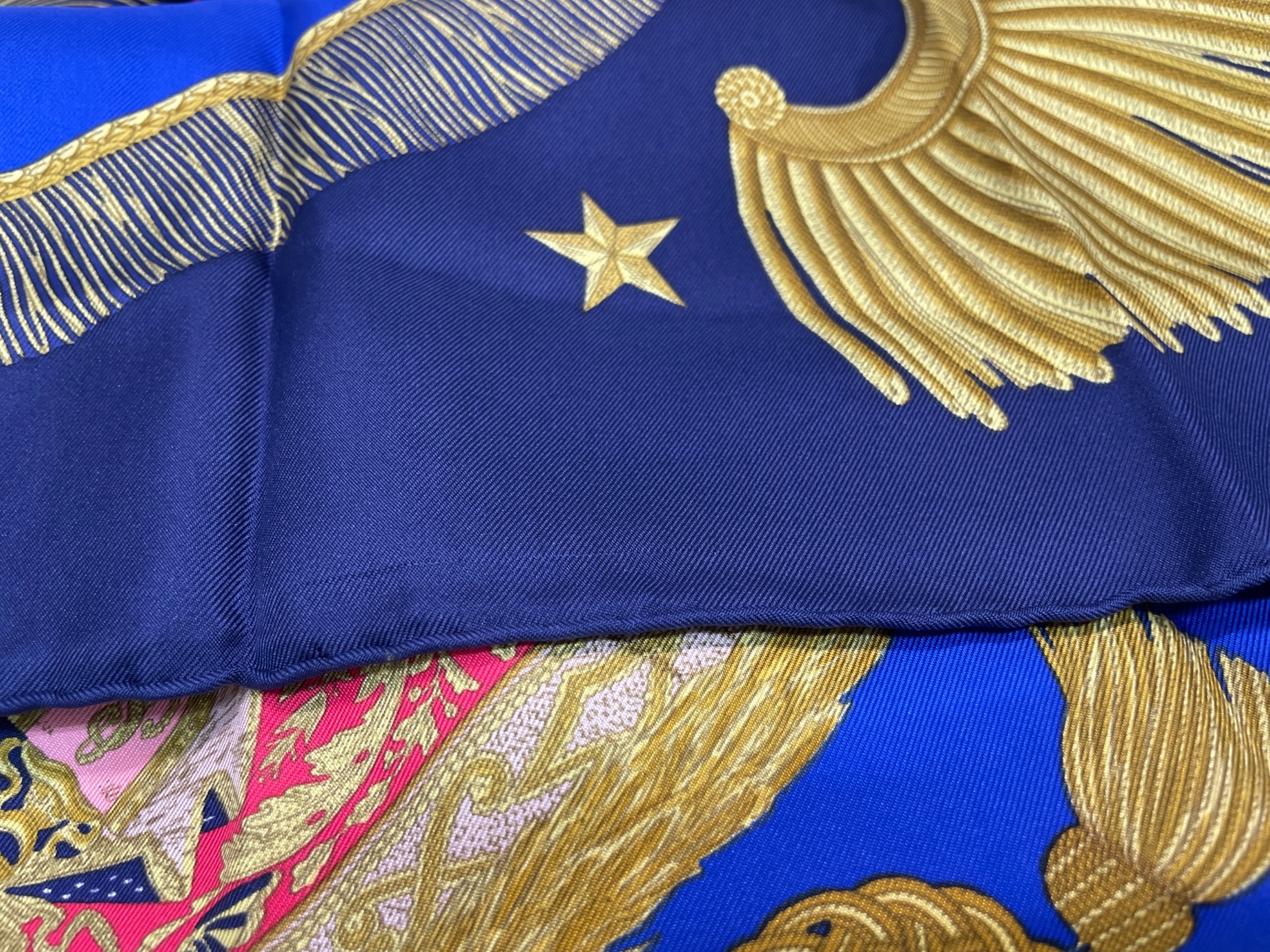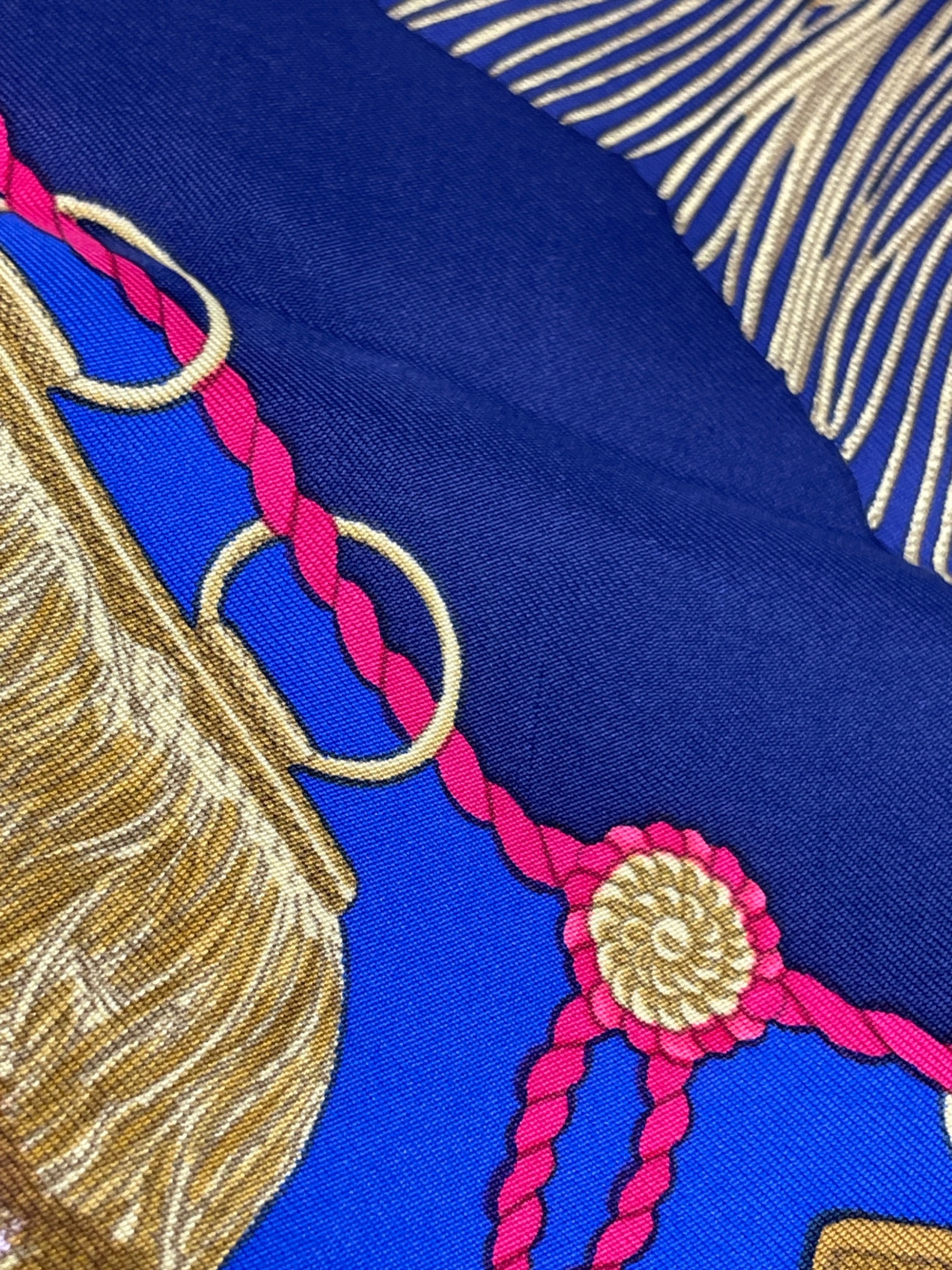| スタッフコメント | 百合の紋章や王冠、タッスルなど気品溢れるモチーフが散りばめられたデザイン。使い方次第で何通りも楽しめるカレ90の中でもミリタリーテイストを感じられるアイテム。 |
