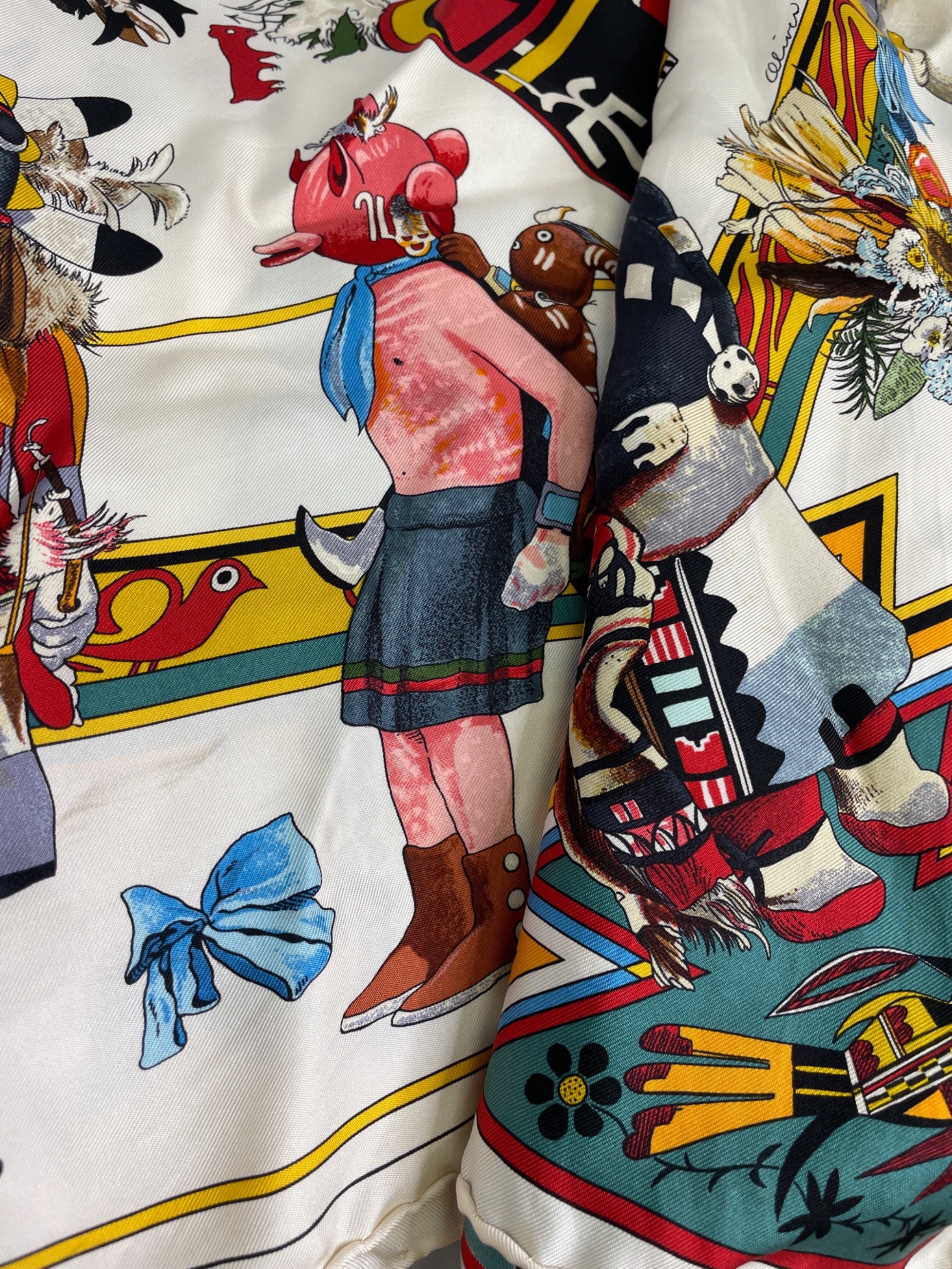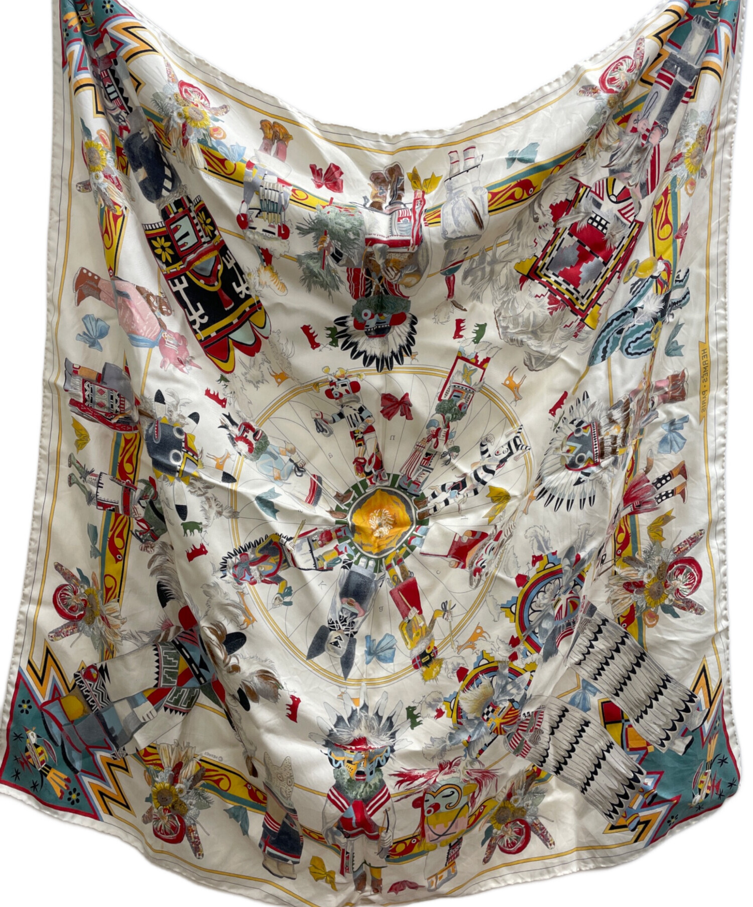 スタッフコメント 1992年Kermit Oliverによって発表された「Kachinas 」。カチーナはアメリカ南西部で穏やかに暮らすホピ族の子どもたちへ贈る儀式に用いられる人形のこと。ネイティブ・アメリカンをモチーフとしたスカーフは身を守ってくれるような神聖なイメージをもたらし、ファッションとしてだけでなくお守りのような気持ちで身につけられるアイテム。