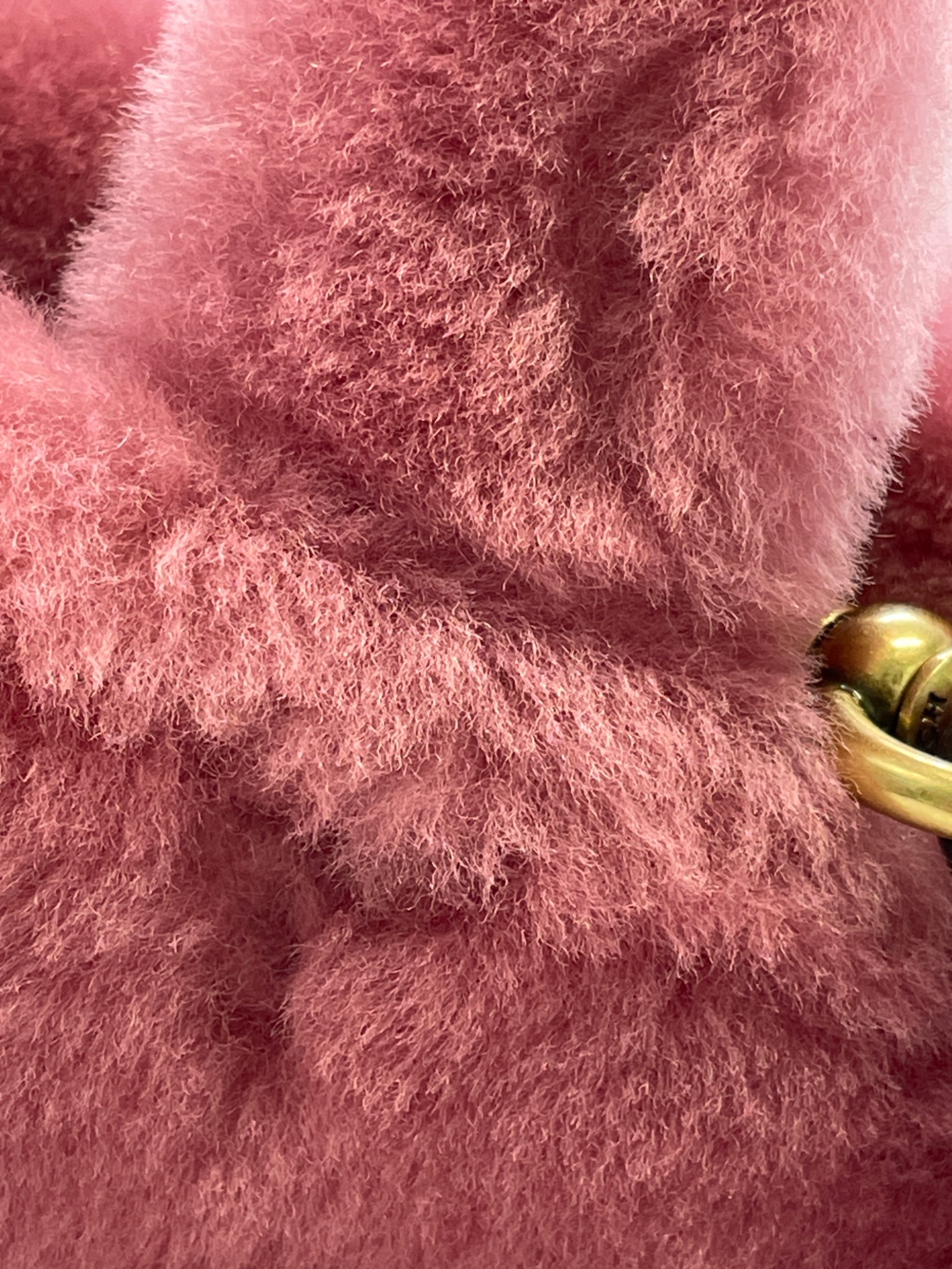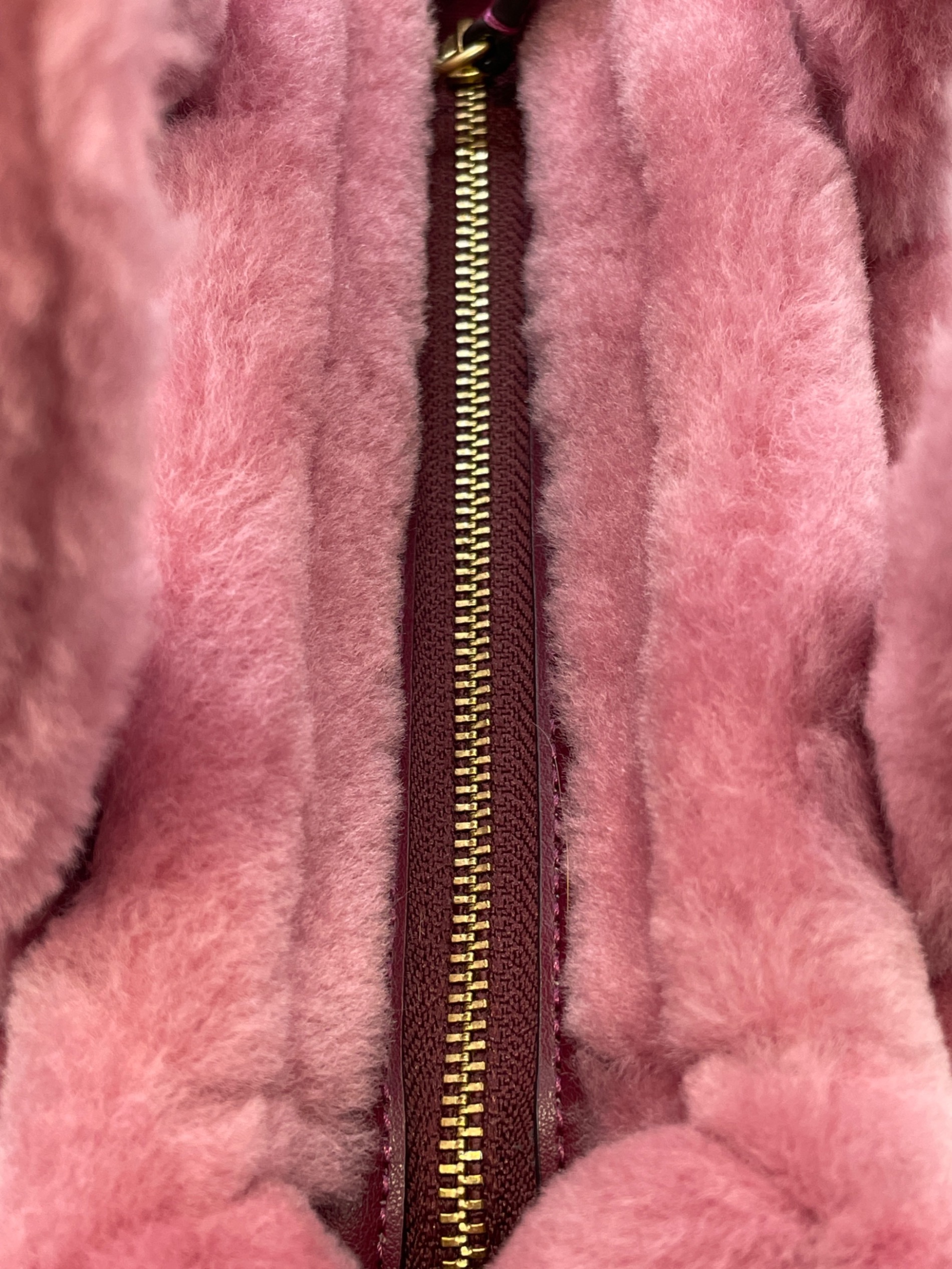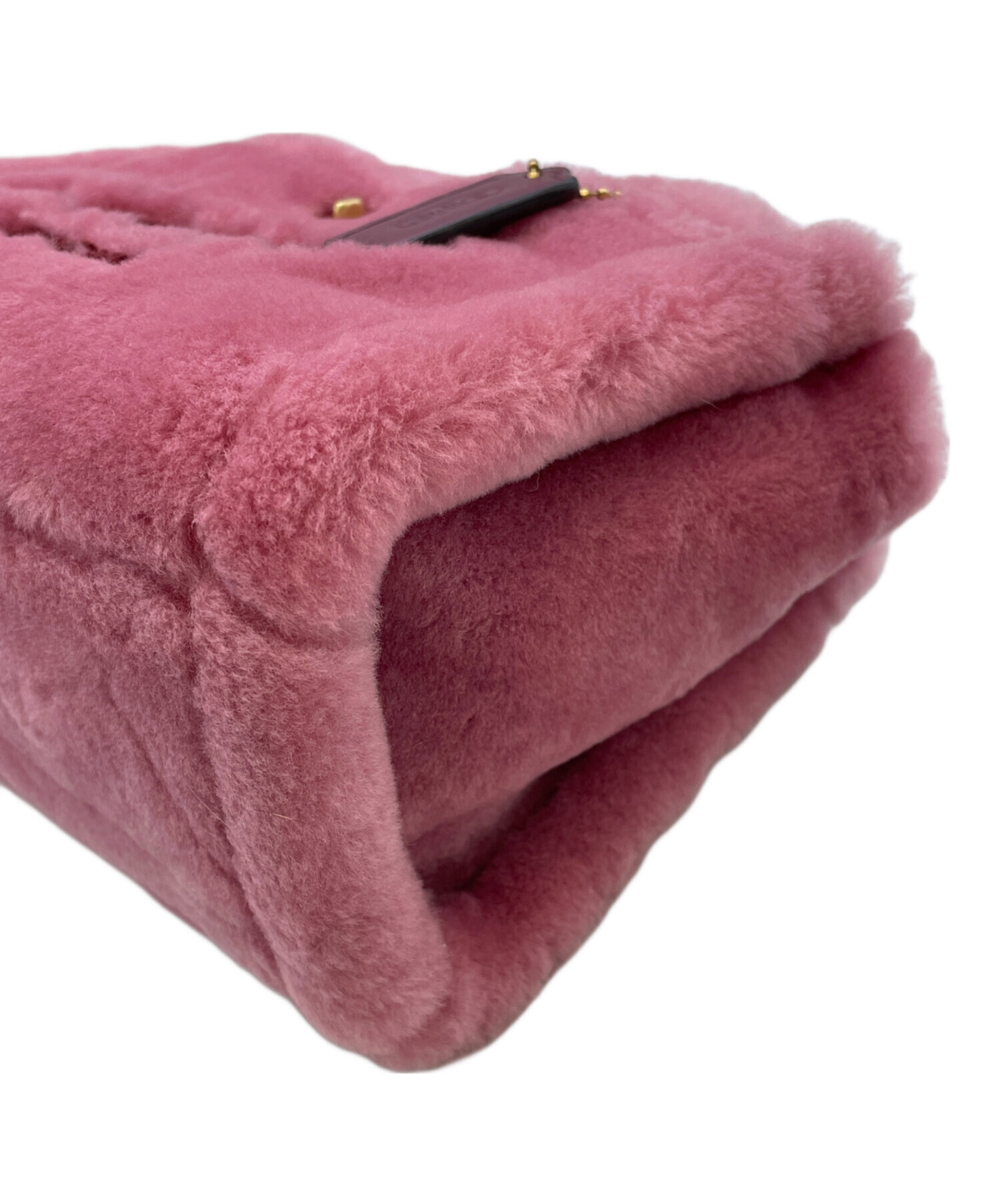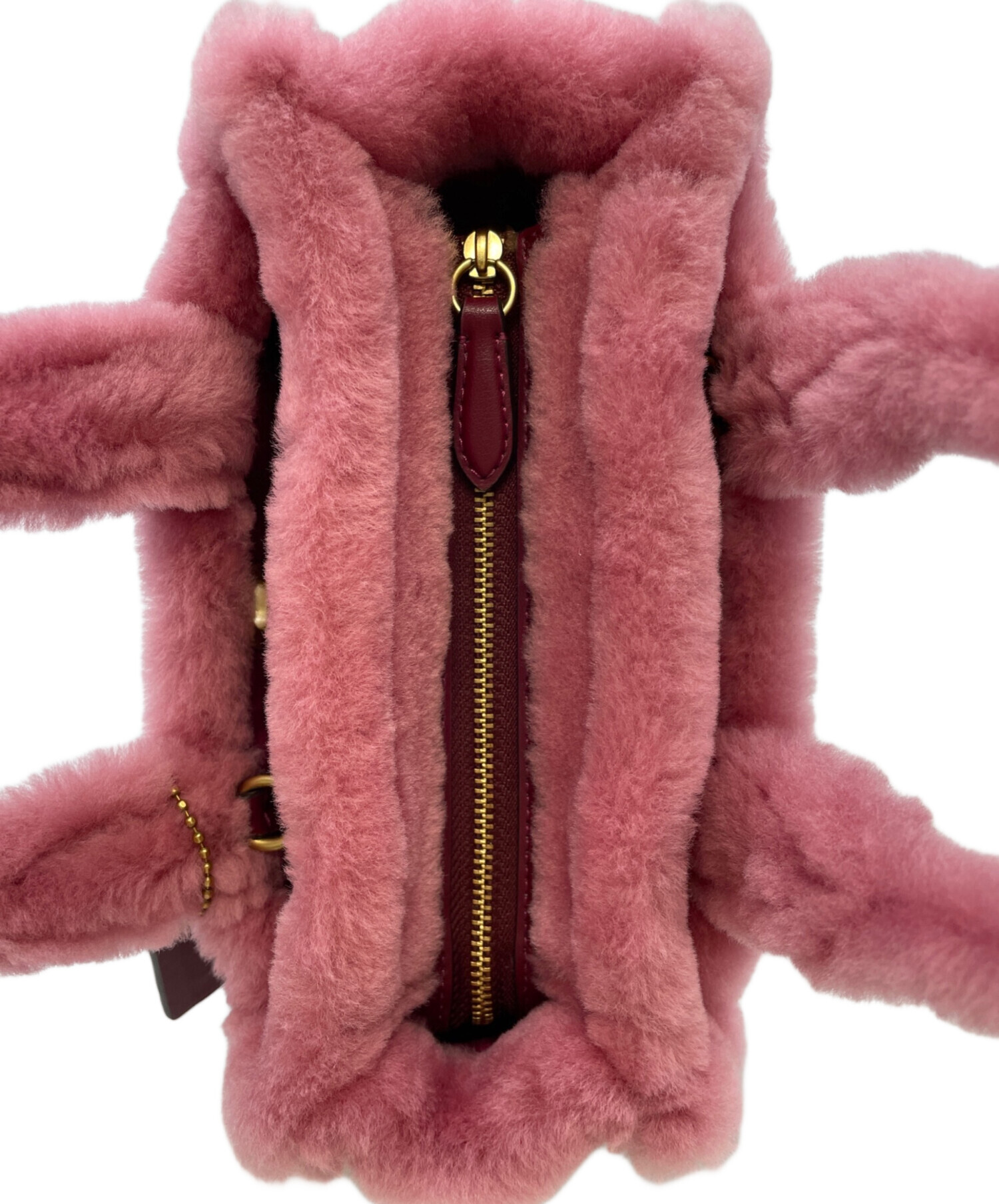 • COACH(コーチ)COACH (コーチ) カーゴ トート バッグ 20・シアリング ピンクの古着・服飾アイテム ファーに線のような箇所。ストラップ変色、毛羽立ち、金具跡。