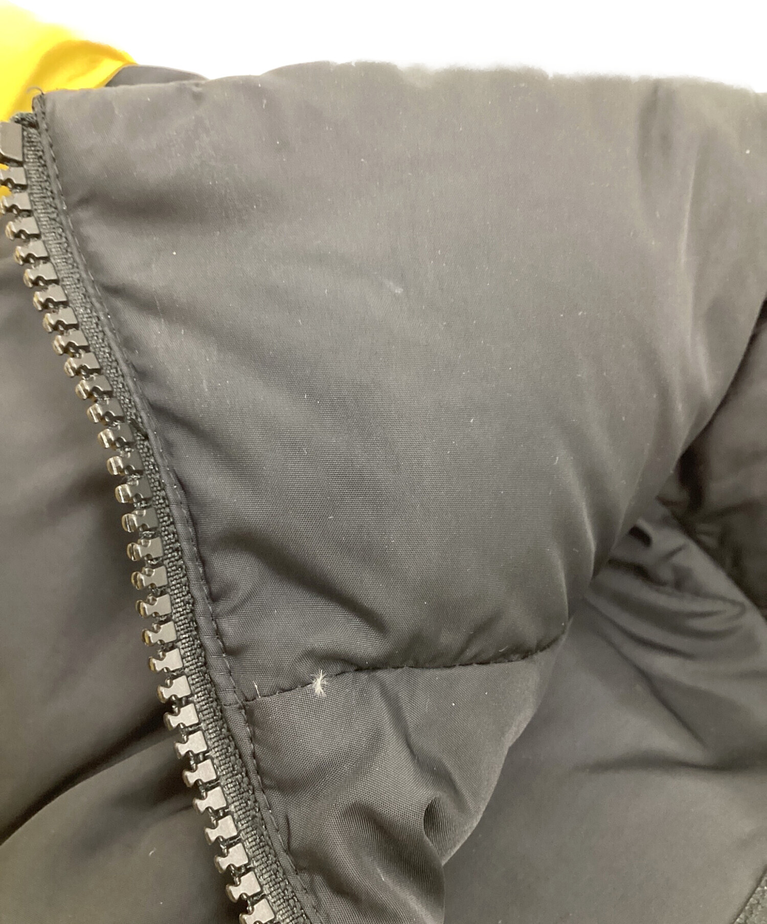 • THE NORTH FACE(ザ ノース フェイス)THE NORTH FACE (ザ ノース フェイス) NUPTSE JACKET(ヌプシ ジャケット) イエロー×ブラック サイズ:Mの古着・服飾アイテム 背面裏地にシミ汚れあり