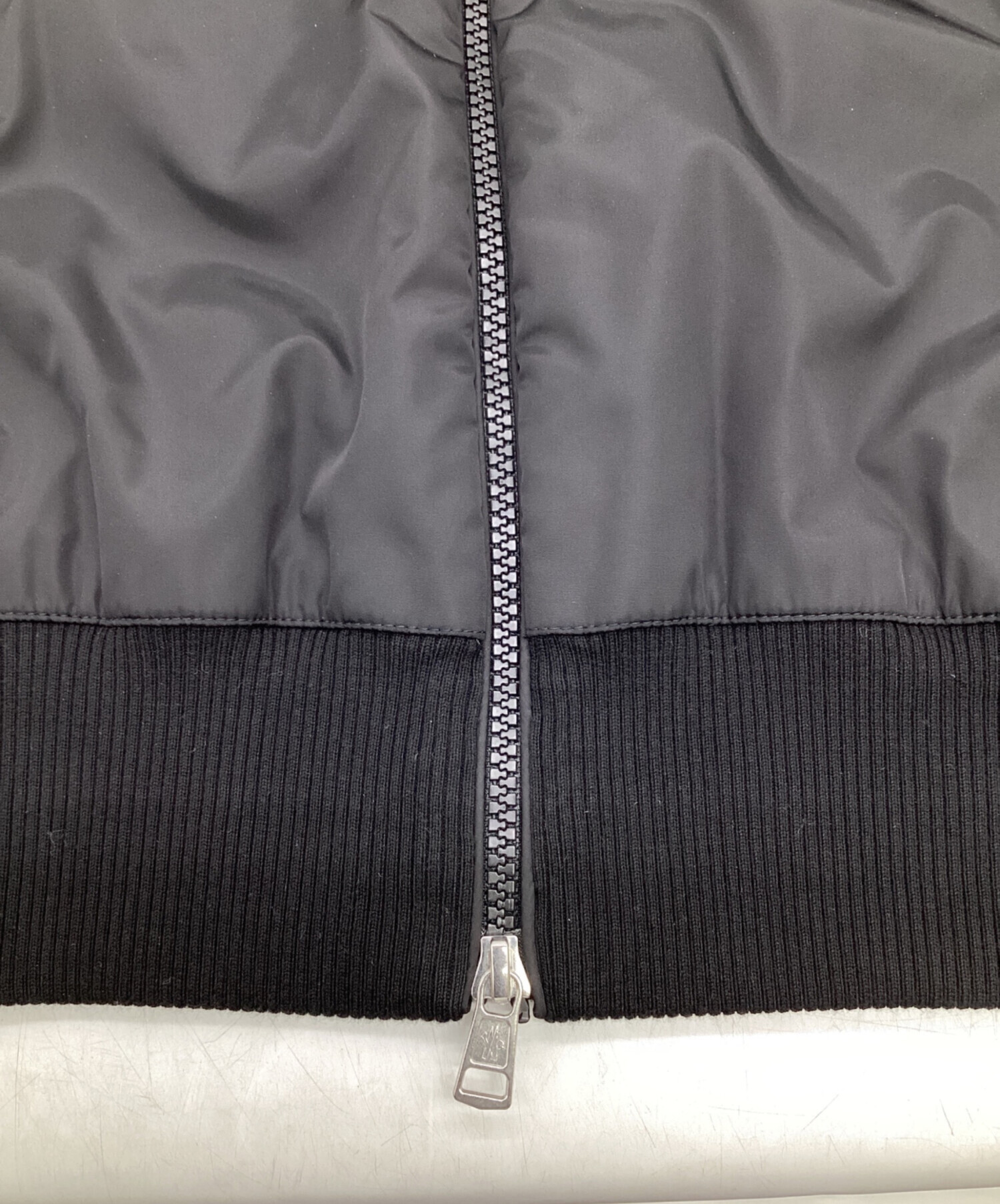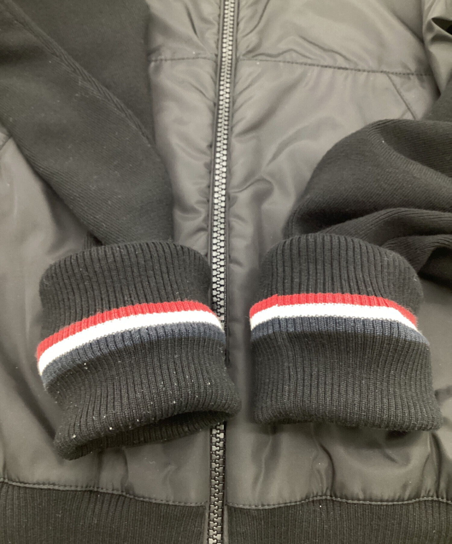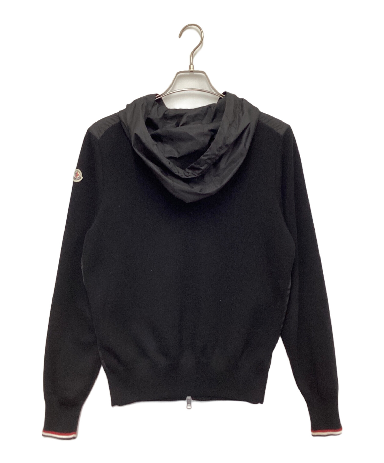 | スタッフコメント | ナイロン・ニット切替えが特徴的なフーディーです。フードにはドローコード、フロントはダブルファスナーで機能的、シルバー色が本体のブラックに映えます。袖口の「トリコロール」がさりげないアクセントです。 |