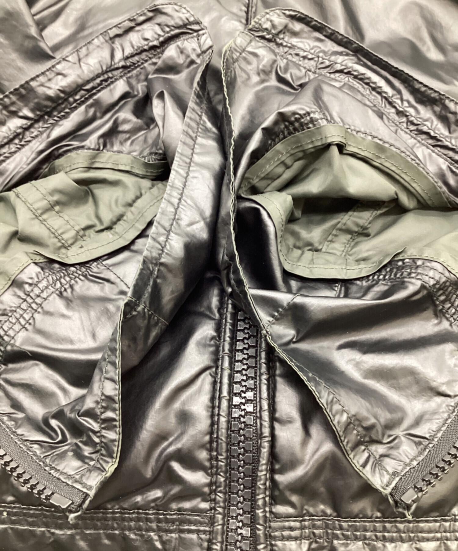 | スタッフコメント | シングルライダースをスポーティーなナイロンに落とし込んだ1着、コーティングによる鈍いツヤ感が存在感あります。コーテイングの擦れ=経年変化を楽しめる個性的なお品物です。 |