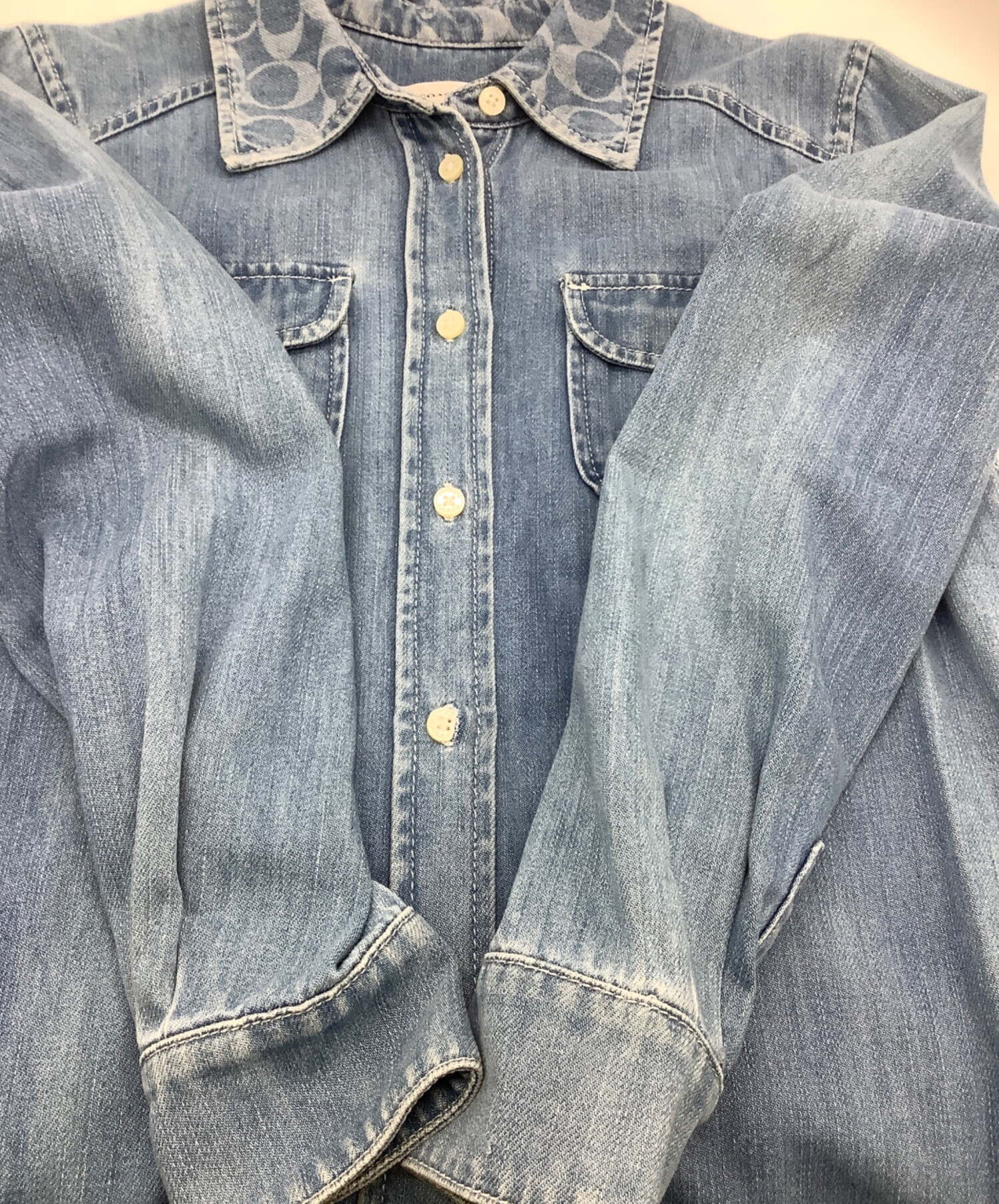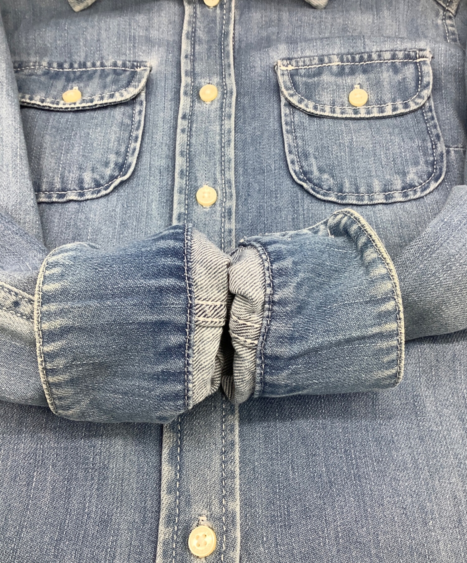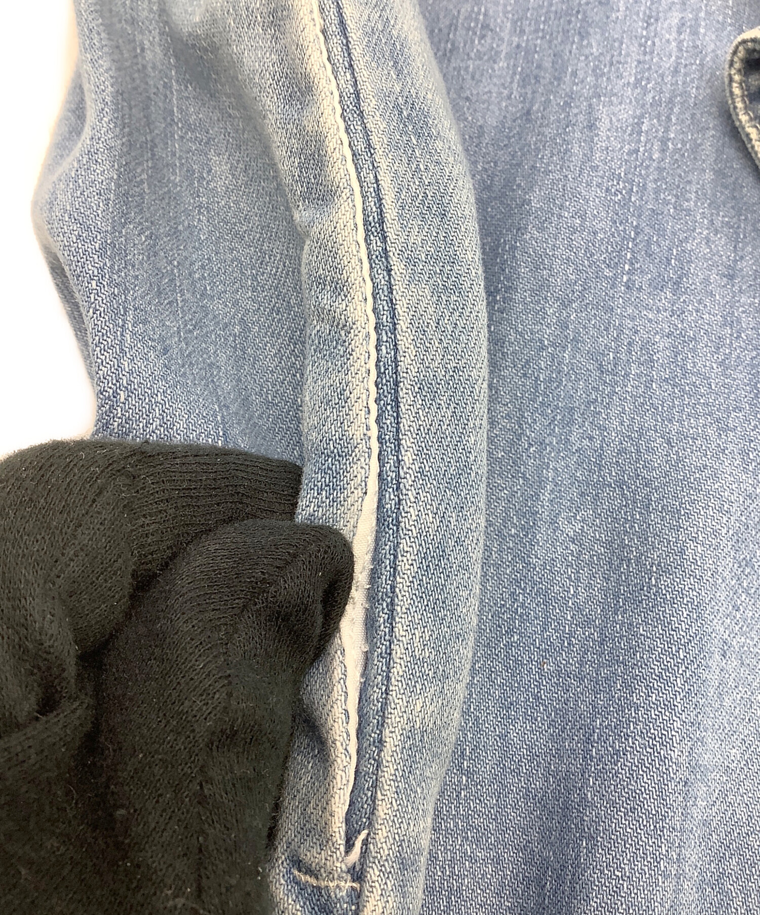 | スタッフコメント | 「シグネチャー」デニムの衿、ムラ感のあるタテ落ちが特徴的なアイスブルーです。 |
