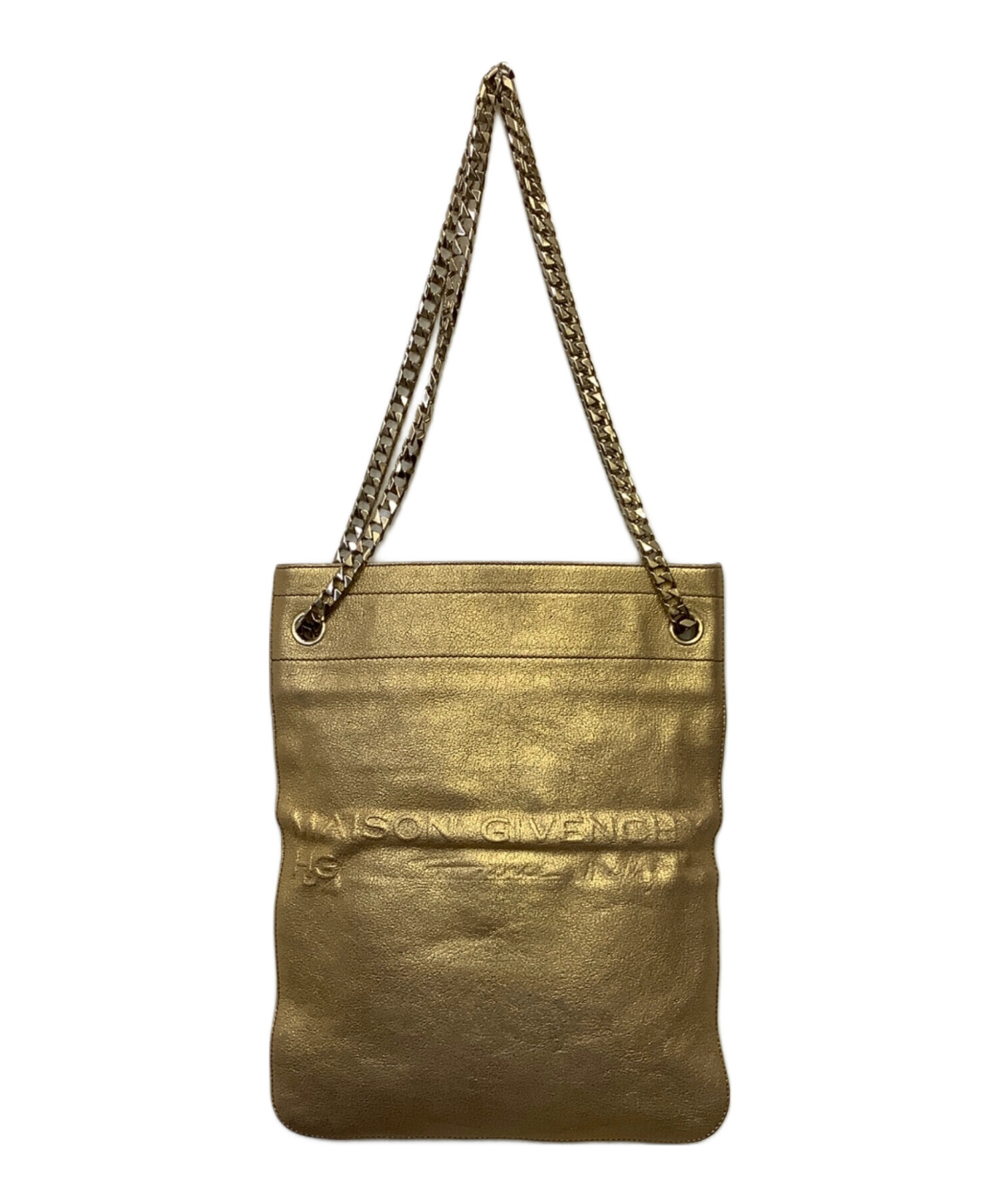 | スタッフコメント | 鈍いゴールドに浮かび上がる「MAISON GIVENCHY HDG」。シンプルな縦型バッグをゴージャスに魅せるチェーンショルダー、存在感あるお品物です。 |