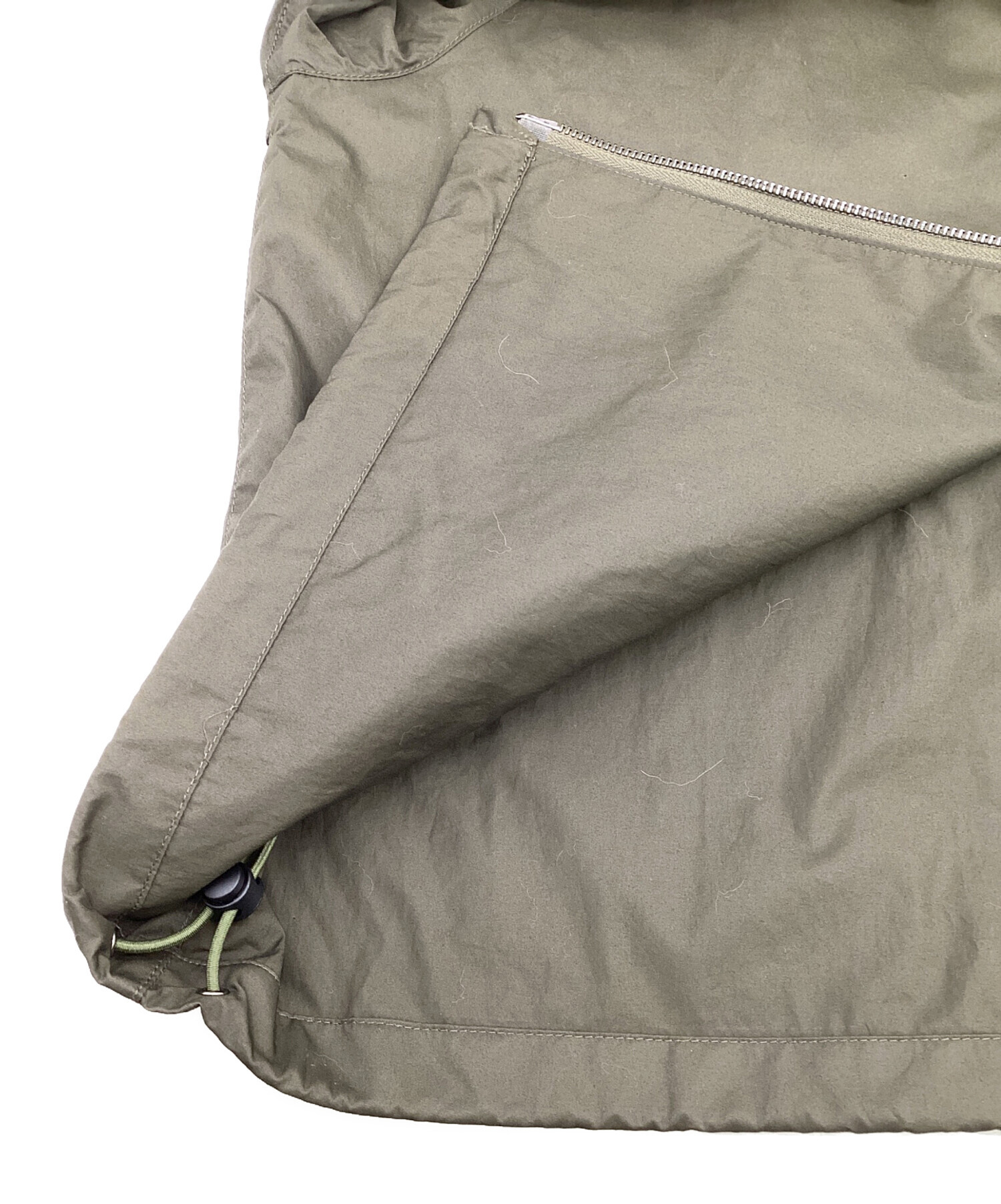 スタッフコメント 薄手の生地感、裏地無しの1枚仕立て、アジャスターベルト無しドローコード仕様の別注モデルです。