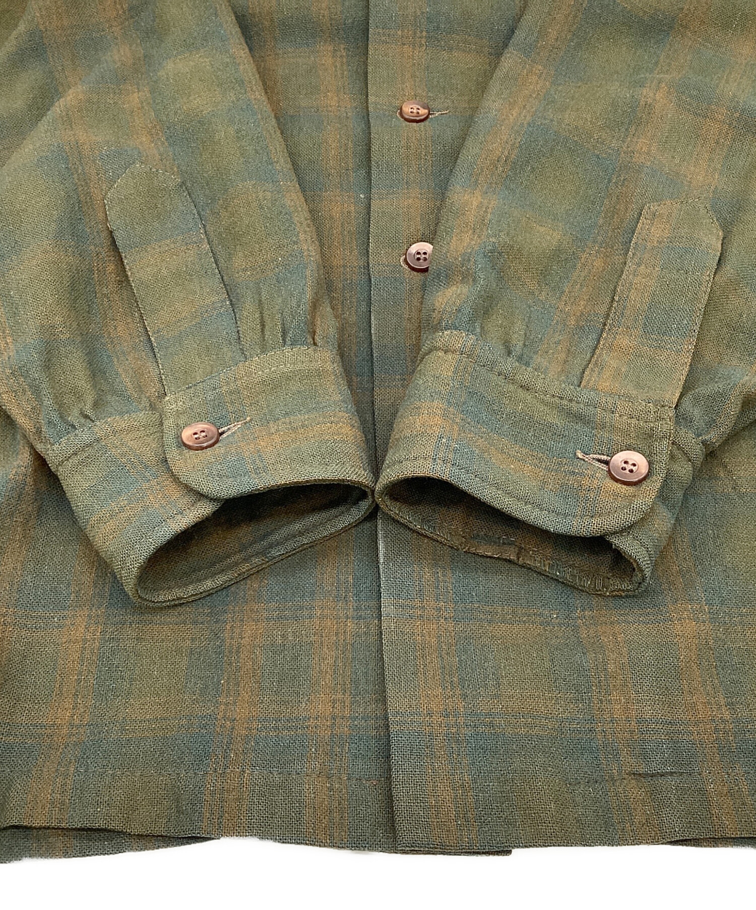 | スタッフコメント | 深みのあるチェック柄、ザックリとしたウール地が特徴的です。袋縫いの衿やフラップ、裏面肩周りのスベリなどデイテールにこだわりのあるお品物です。 |