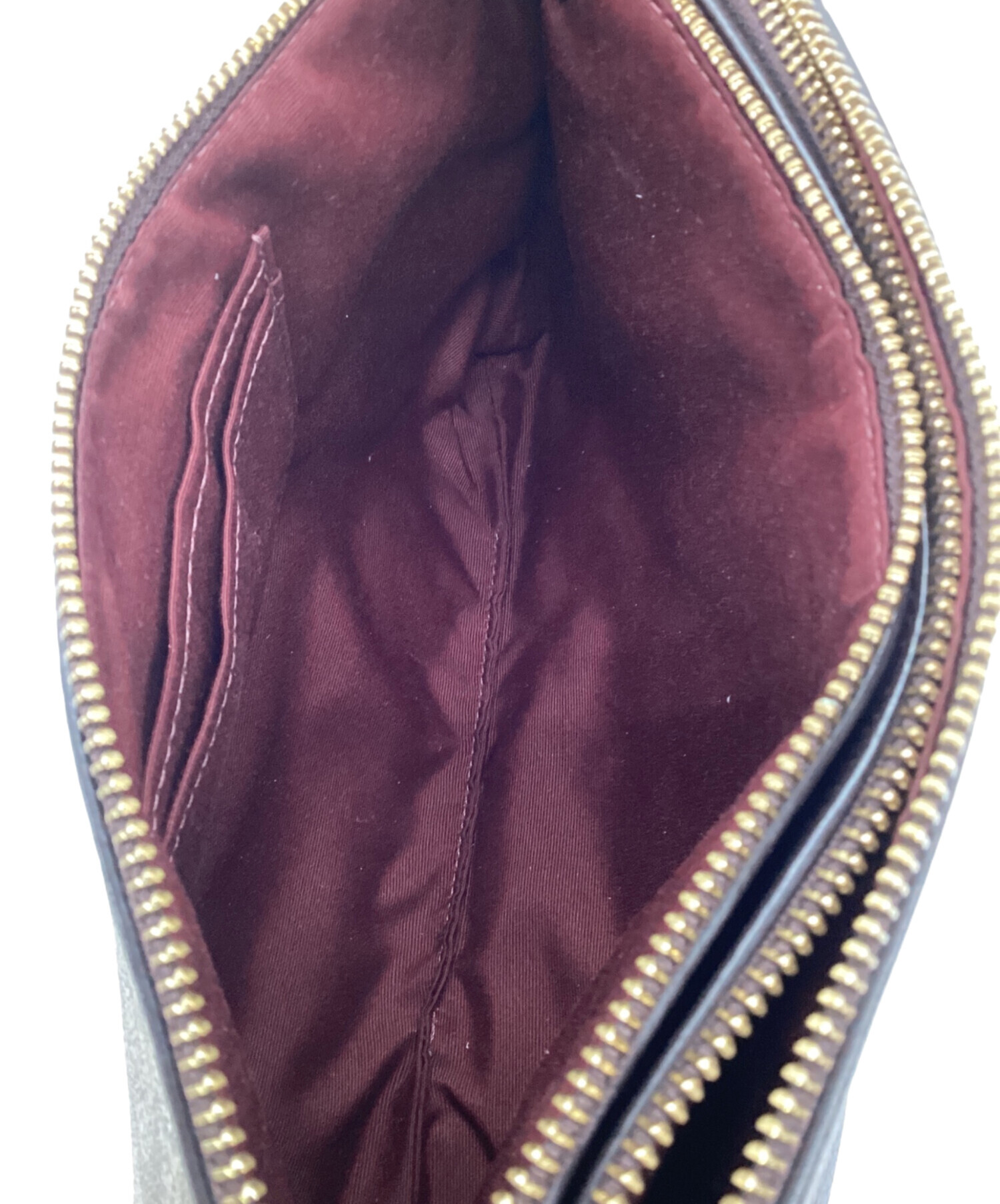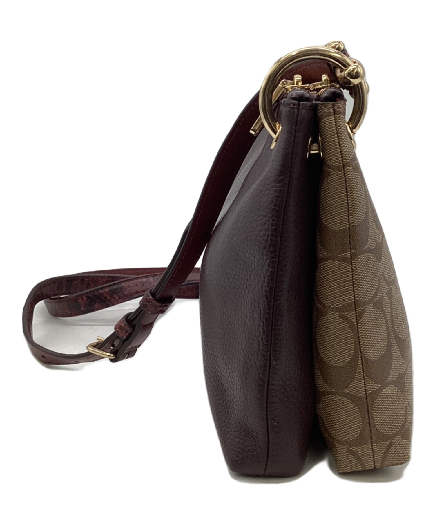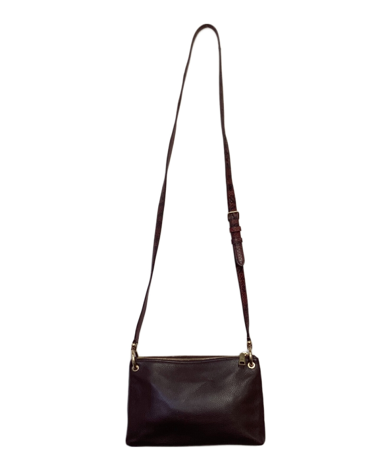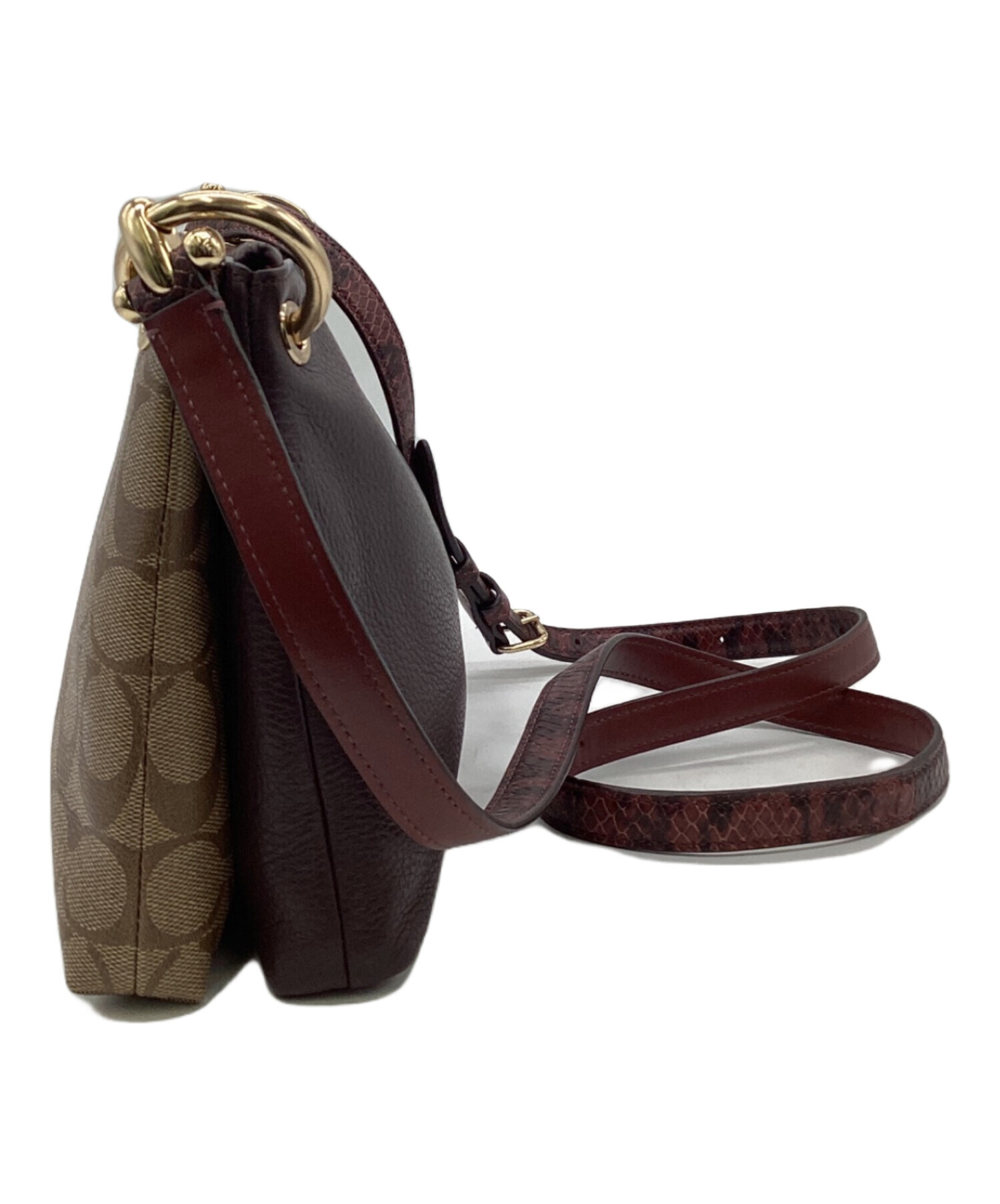 | スタッフコメント | 仕分けされた2列のメイン収納、シグネチャー柄とボルドー色のコンビが特徴的です。細身のストラップはウロコ調の型押しが施された「スネーク」柄、シンプルなシルエットながら存在感あるお品物です。 |
