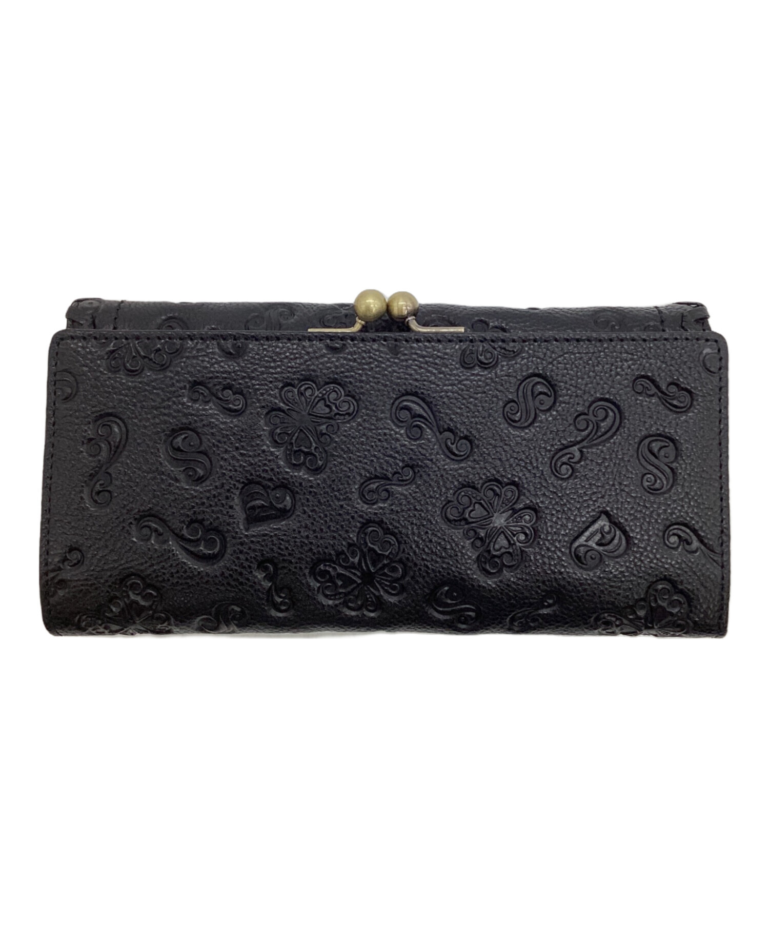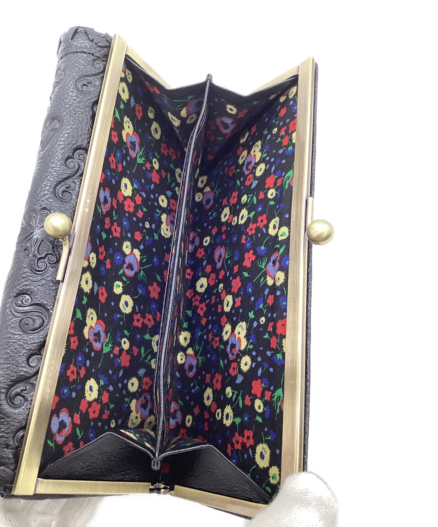 | スタッフコメント | エンボスによる「パピヨン」、裏地フラワープリントの存在感ある長財布。フラップ・がま口の2つの収納部を備えた実用的なお品物です。 |