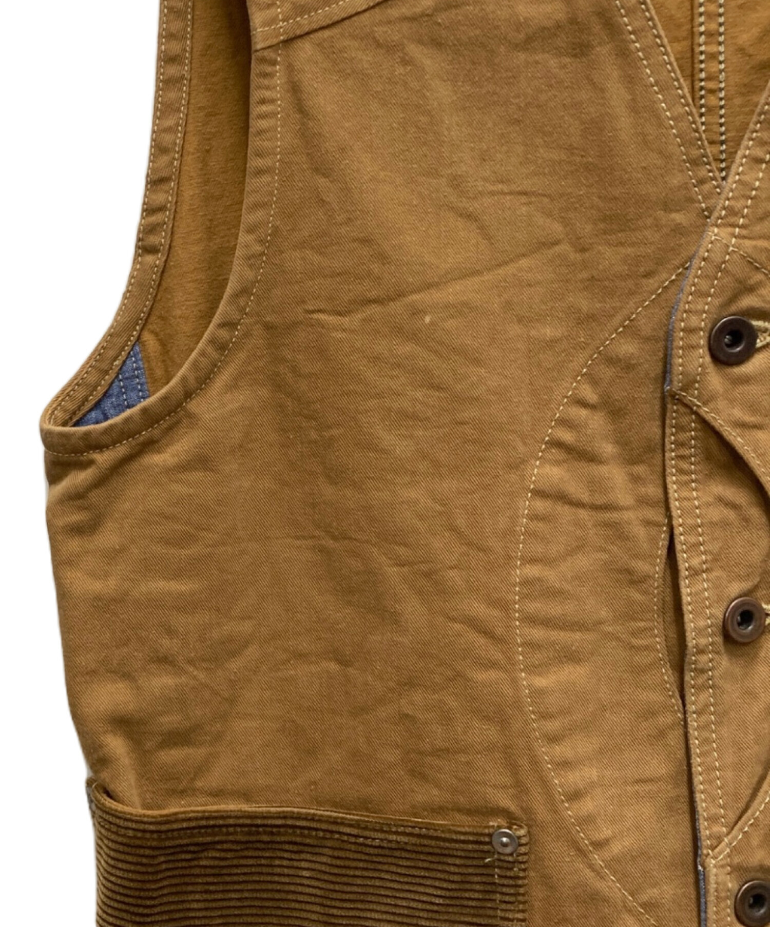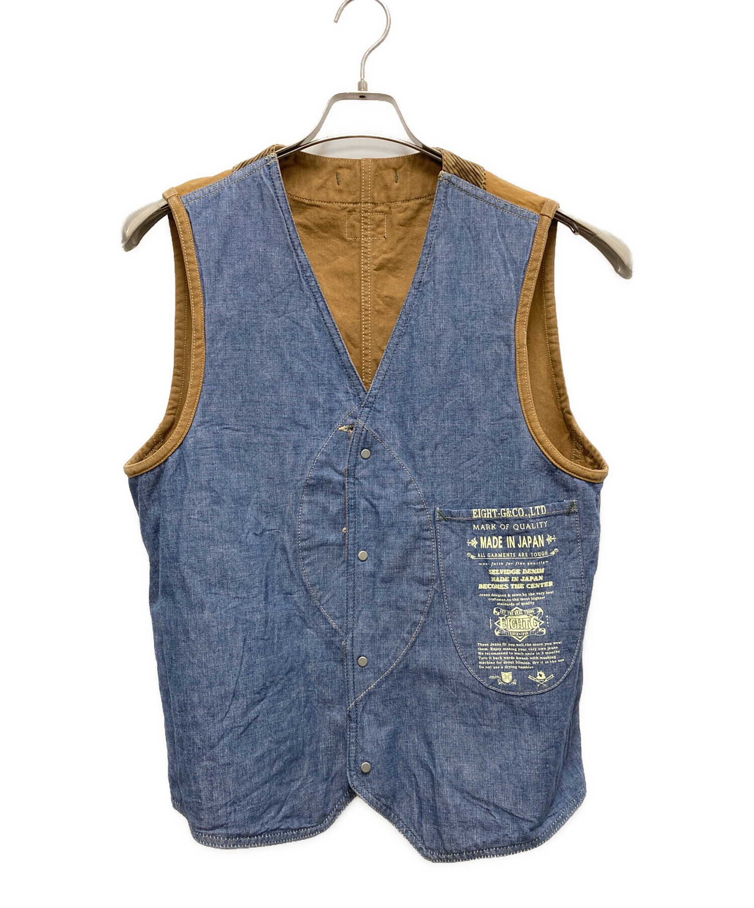 | スタッフコメント | エイトジー/ハーフムーンベストの入荷です。ポケット部分にコーデュロイ生地がパッチワークされていたり裏地がダンガリー生地だったりと細部までこだわりを感じる一着です。 |