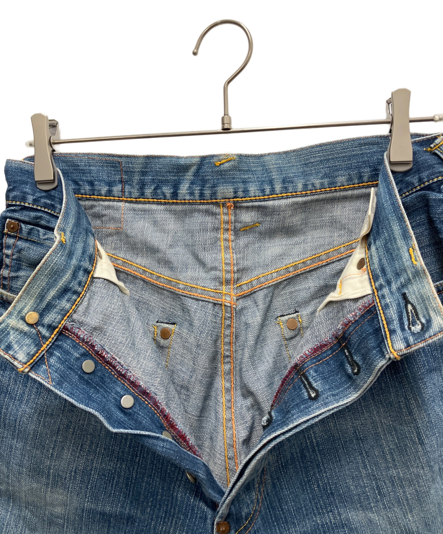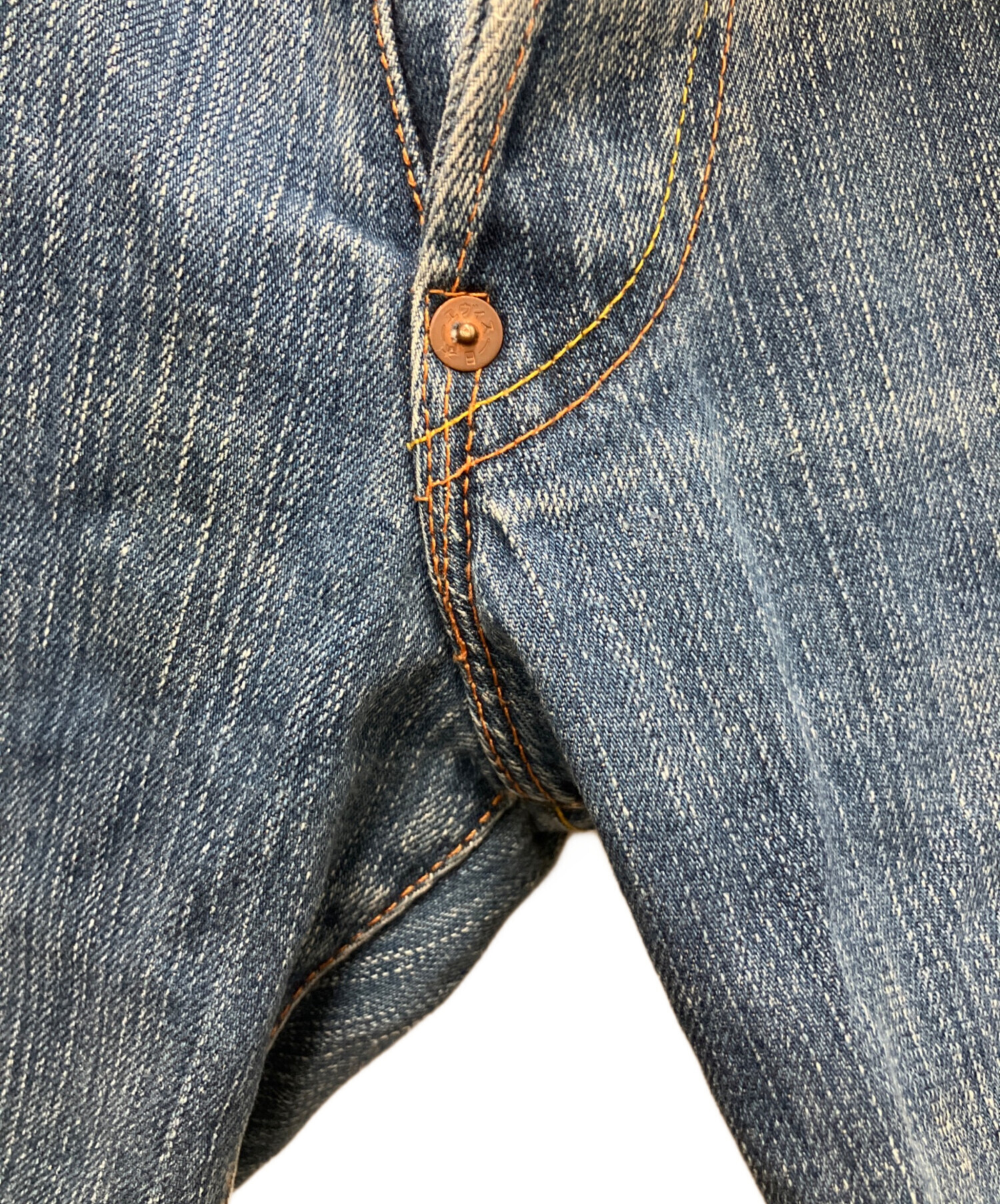 | 備考 | フロントVステッチ/隠しリベット/股リベット/オレンジ×イエローステッチ/ボタンホールブラック/バックポケット裏シングルステッチ/ベルトループずれ有/閂止めブラック |