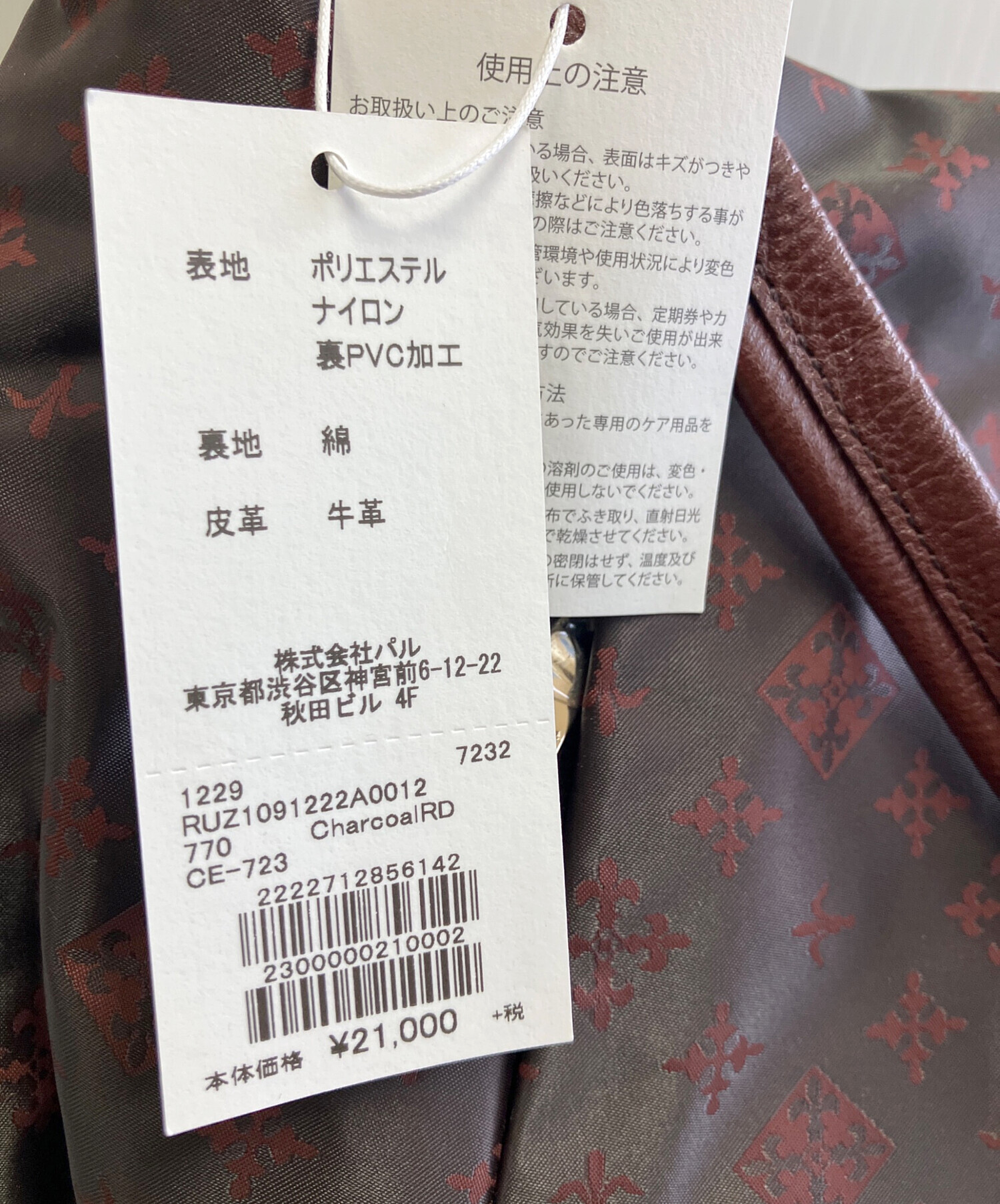 | 素材 | 表地:ポリエステル、ナイロン、裏PVC加工 裏地;コットン 皮革:牛革 |