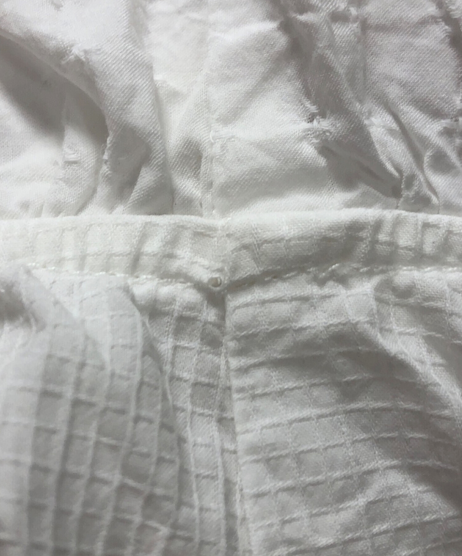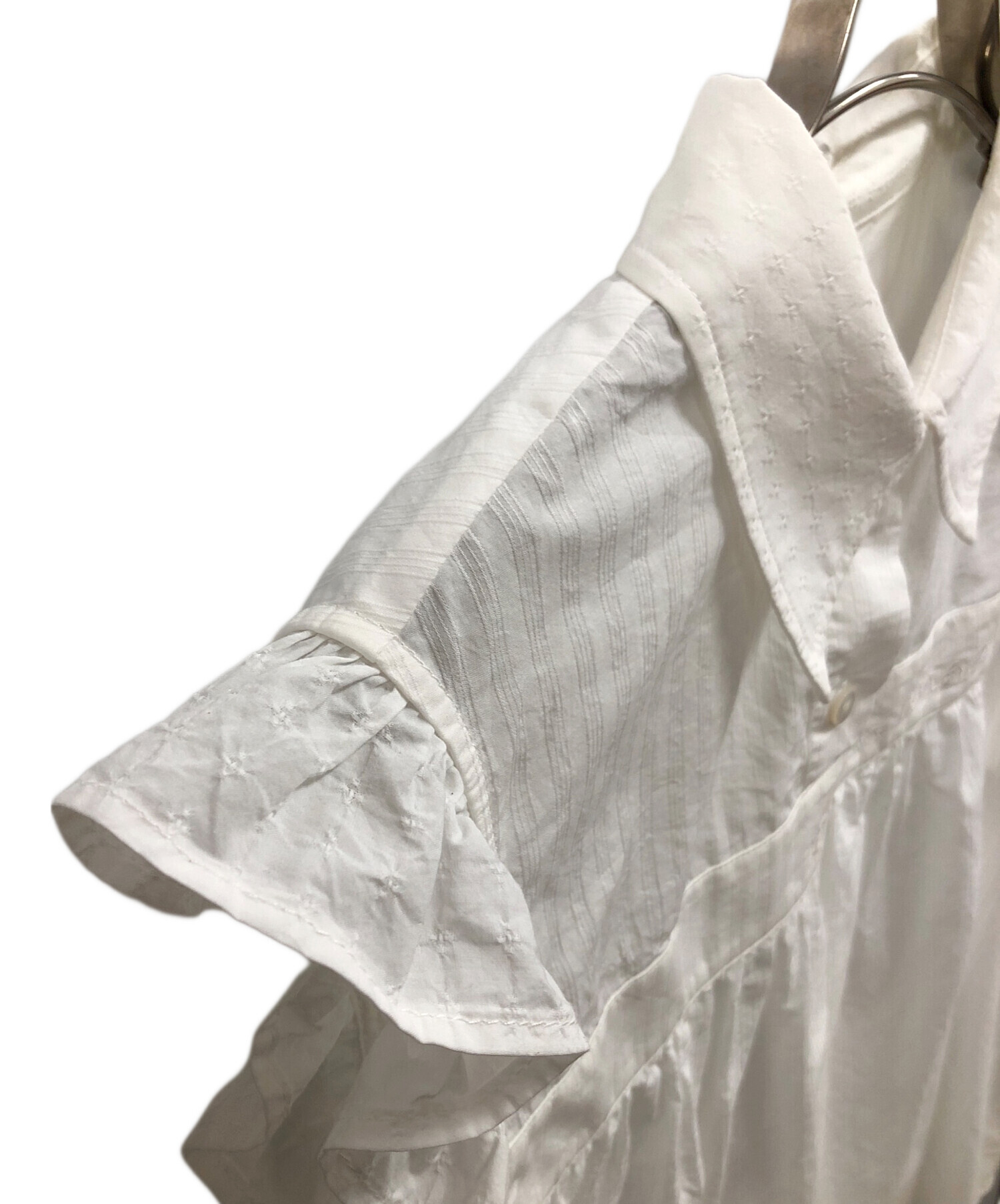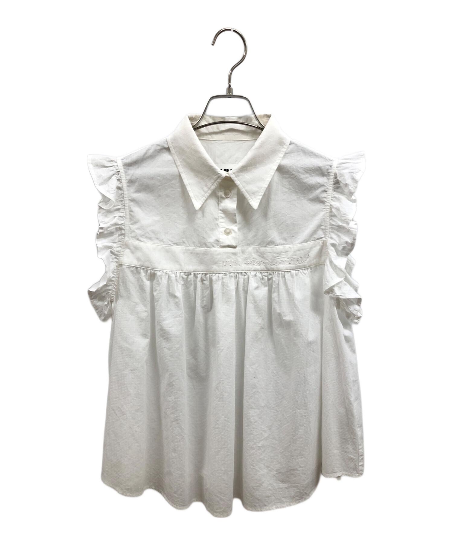 | スタッフコメント | Maison Margiela(メゾンマルジェラ)ノースリーブブラウス。 清涼感のあるホワイトカラーに、可愛らしく胸部周りにギャザー、肩周りにフリルが施されており、ガーリーなデザインが特徴。 |