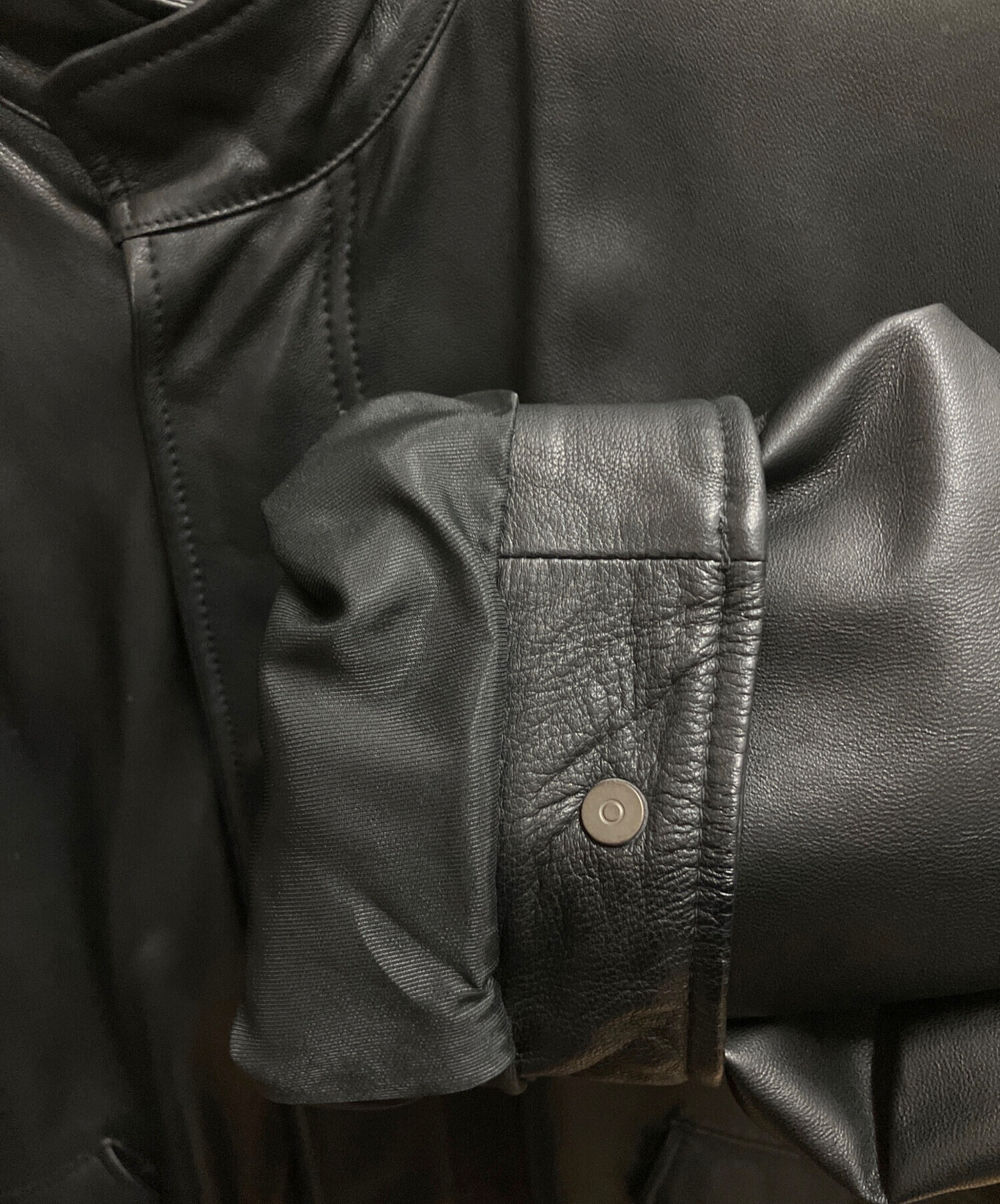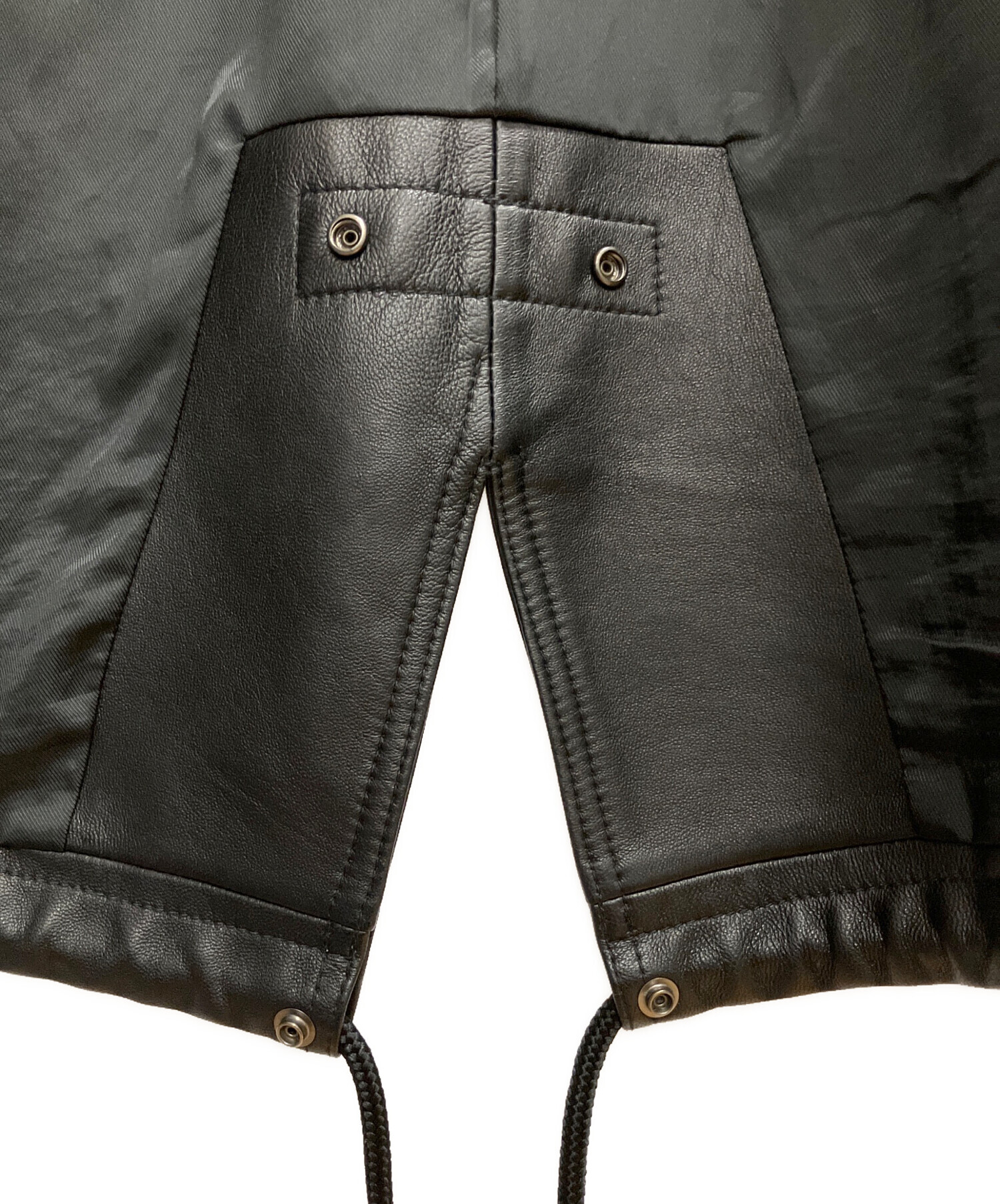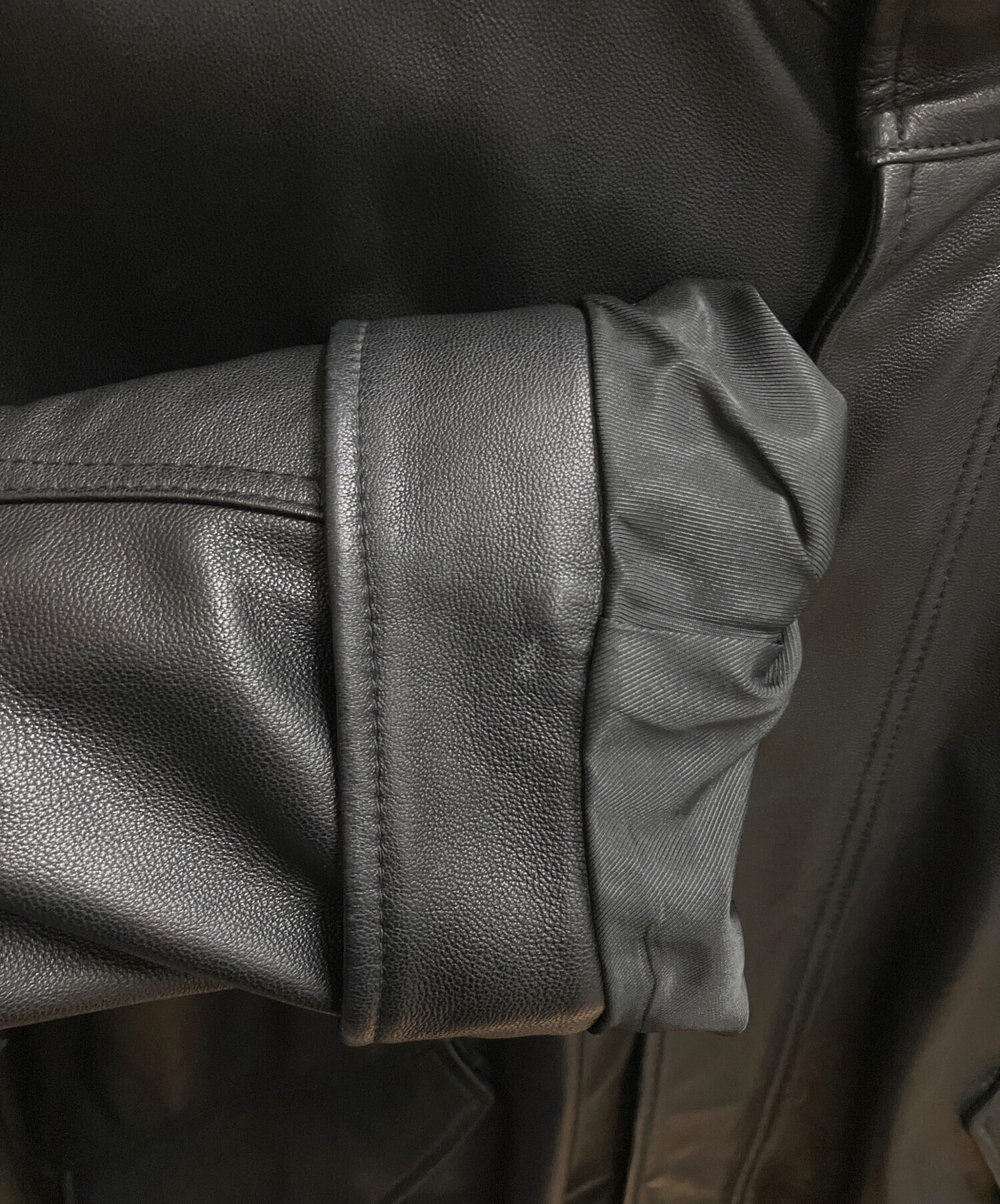 • Adam et Rope(アダム エ ロペ)Adam et Rope (アダム エ ロペ) シープレザービッグシルエットモッズコート ブラック サイズ:SIZE Lの古着・服飾アイテム 右袖口裏、ヨゴレあり