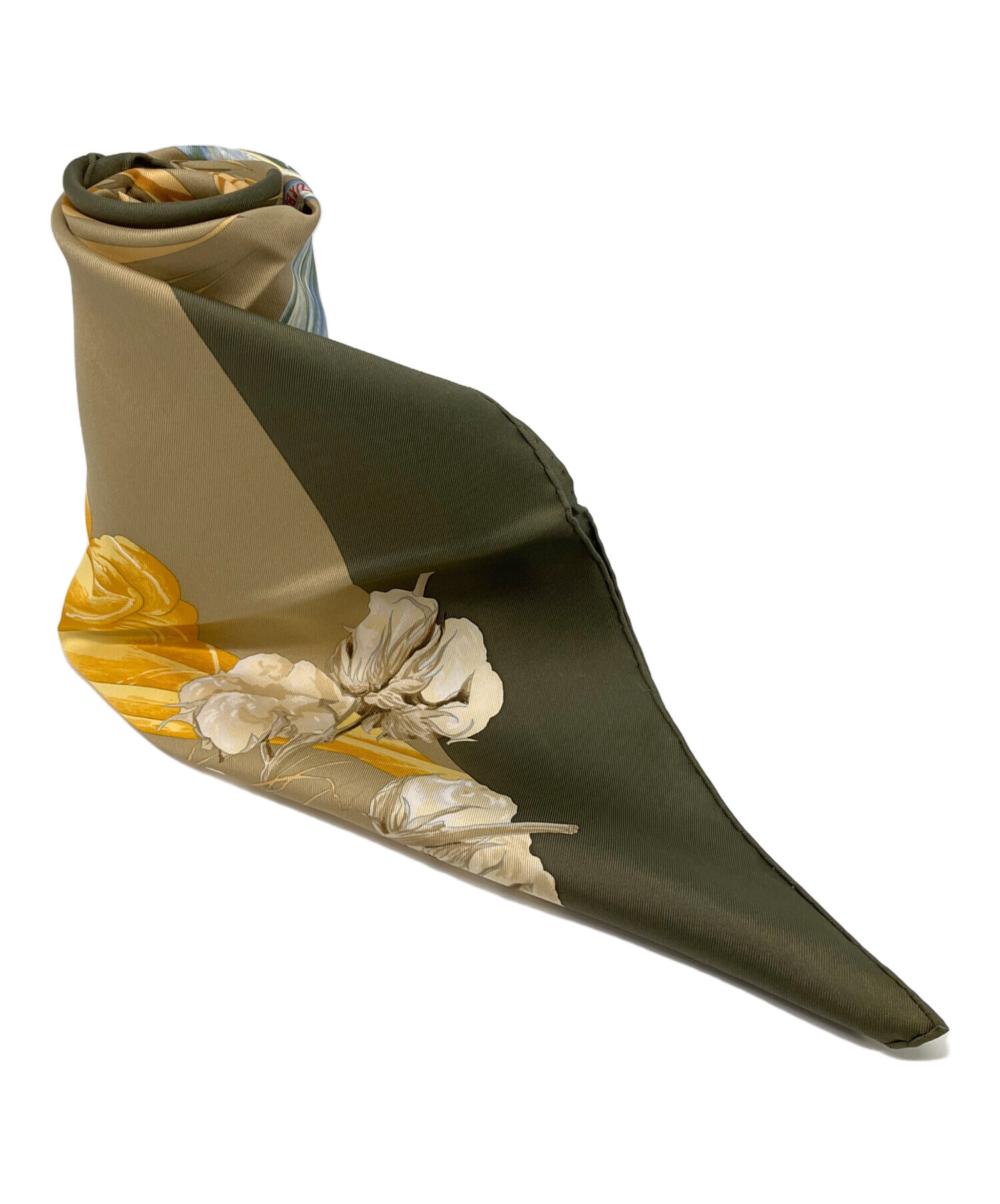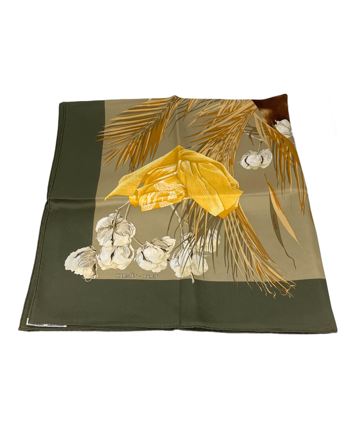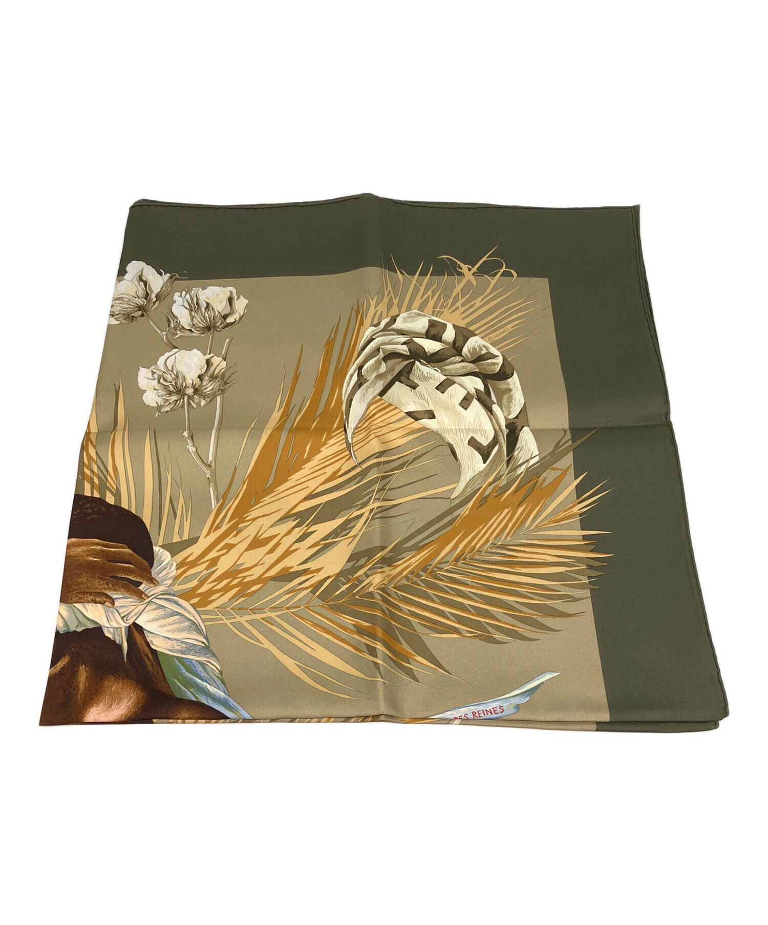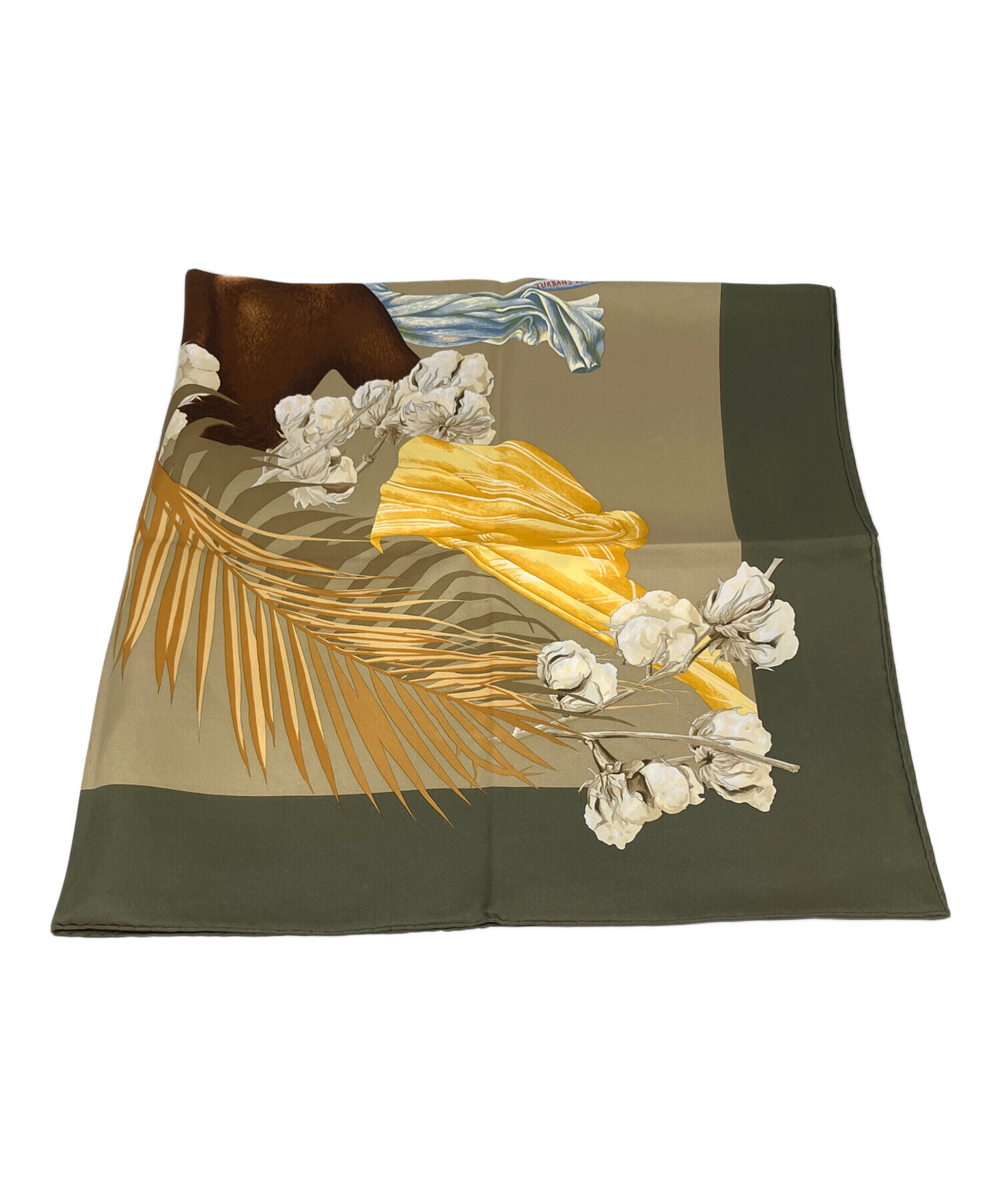 | スタッフコメント | HERMES(エルメス) カレ90 王妃のターバン スカーフ オリーブ×ブラウンカラー フランス製 シルク100% |