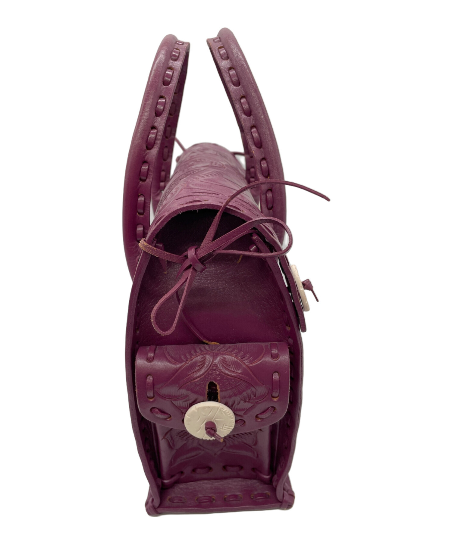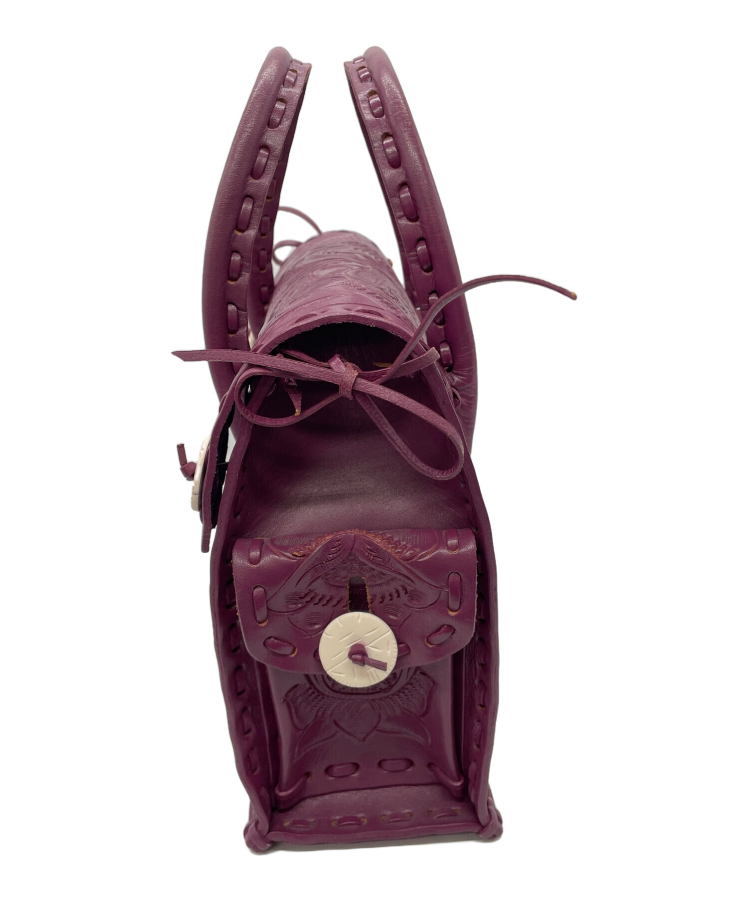 • Carving Tribes(カービングトライブス)Carving Tribes (カービングトライブス) レザーハンドバッグ パープルの古着・服飾アイテム ボタン色移り有