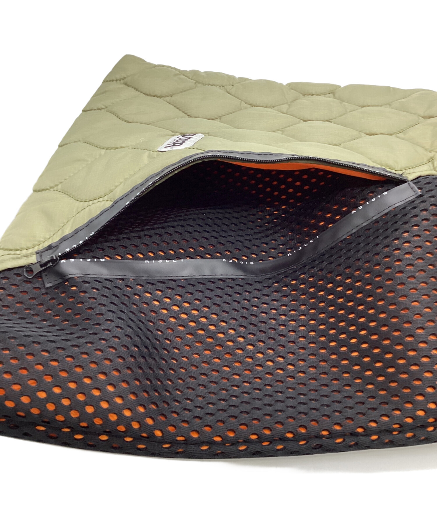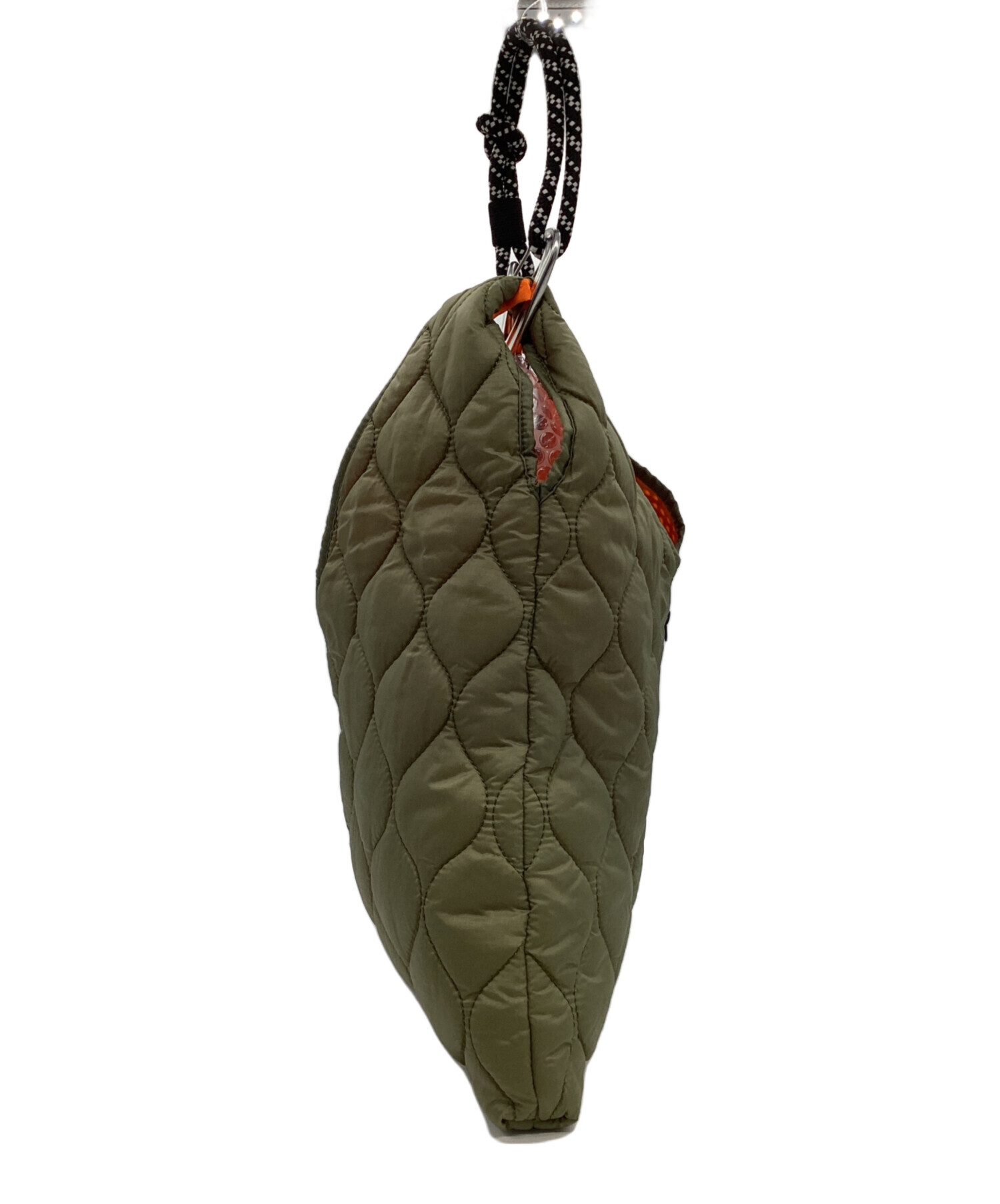 | スタッフコメント | メッシュとキルティングのトライアングルバッグです。ブラックとカーキの配色の安定感と大きなカラビラが存在感を出しています。また、ブランドタグが全体のバランスを整えて良いアクセントになっています。 |