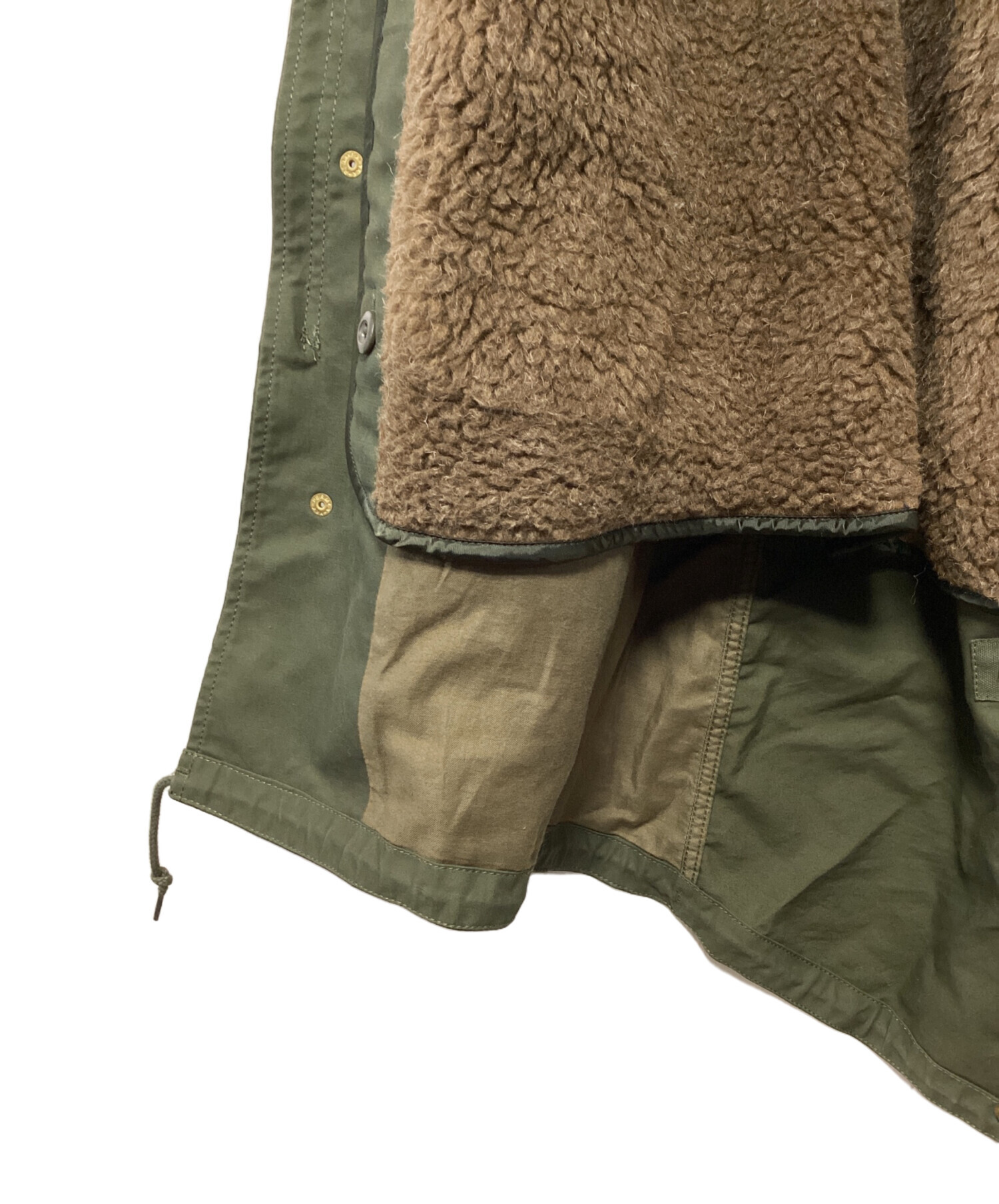 | 素材 | 綿 100% ボア部分: ポリエステル 82% 毛 18% ボア基布部分: ポリエステル 100% 側地: ポリエステル 100% 袖中わた: ポリエステル 100% 袖口リブ: アクリル 66% 毛 25% ナイロン 8% ポリウレタン 1% ファー部分: チャイニーズラクーン(タヌキ) |