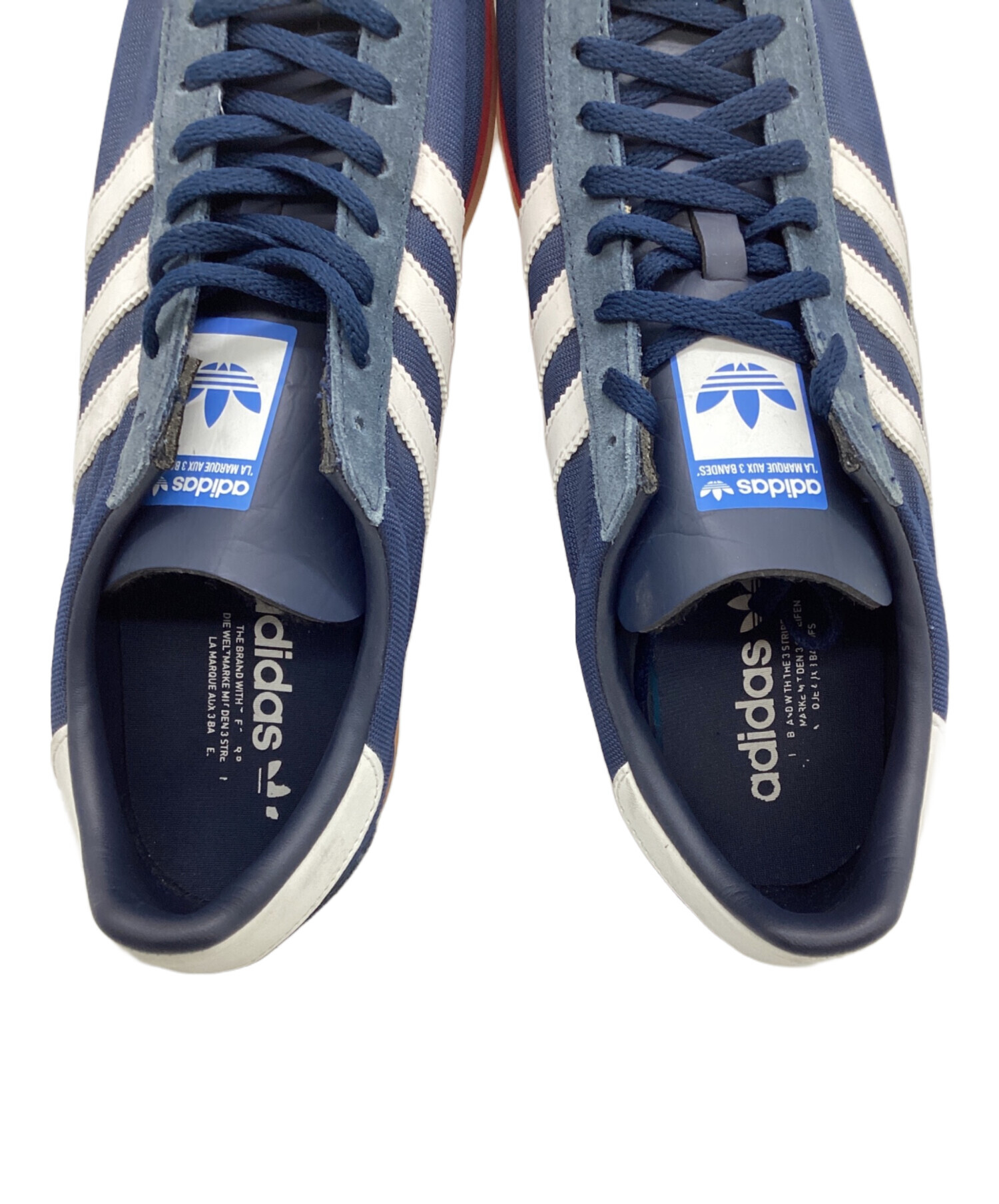 | スタッフコメント | Adidas(アディダス)のスニーカーです。ネイビーを中心とした色合いでソールに二色仕様のラインが施されています。どんなファッションにも似合う一品です。 |