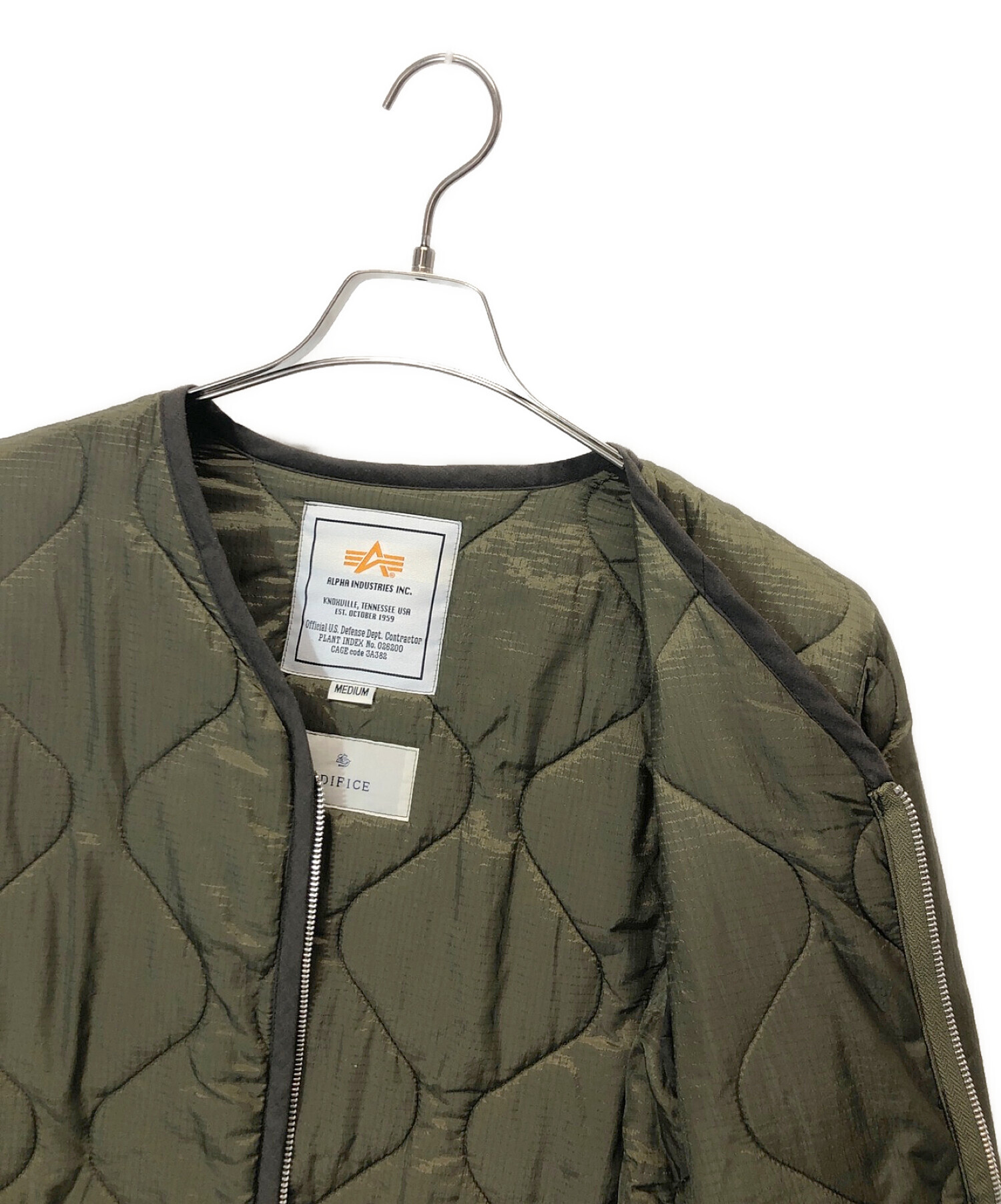 • EDIFICE(エディフィス)EDIFICE (エディフィス) ALPHA INDUSTRIES (アルファインダストリーズ) ライナーキルティングジャケット オリーブ サイズ:Mの古着・服飾アイテム 毛羽立ち有