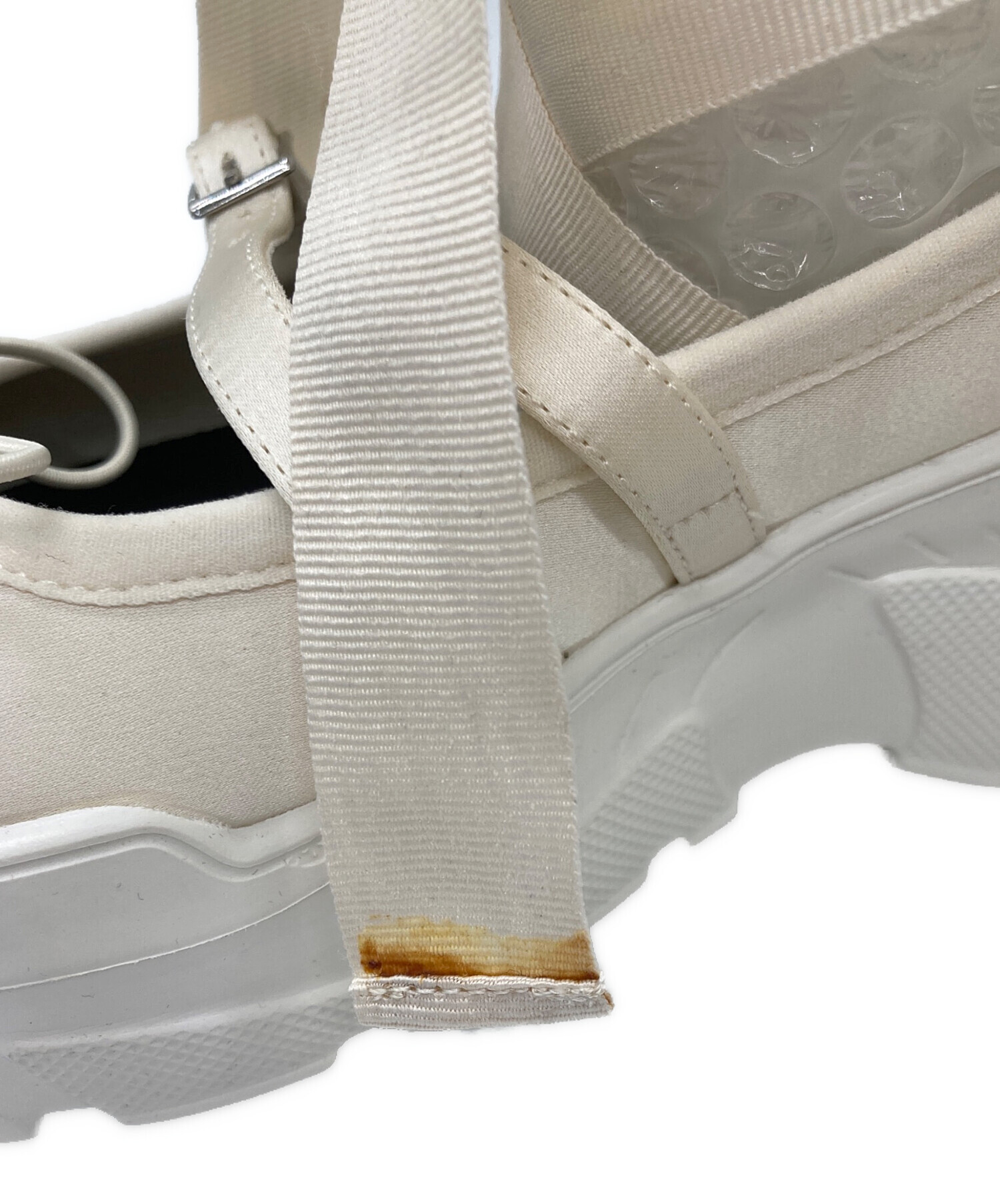 ソール汚れ(写真4枚目参照)、トゥ部分汚れ(写真5枚目参照)、くるぶし部分汚れ(写真6枚目参照)、リボン接着剤汚れ(写真7枚目参照)がございます。