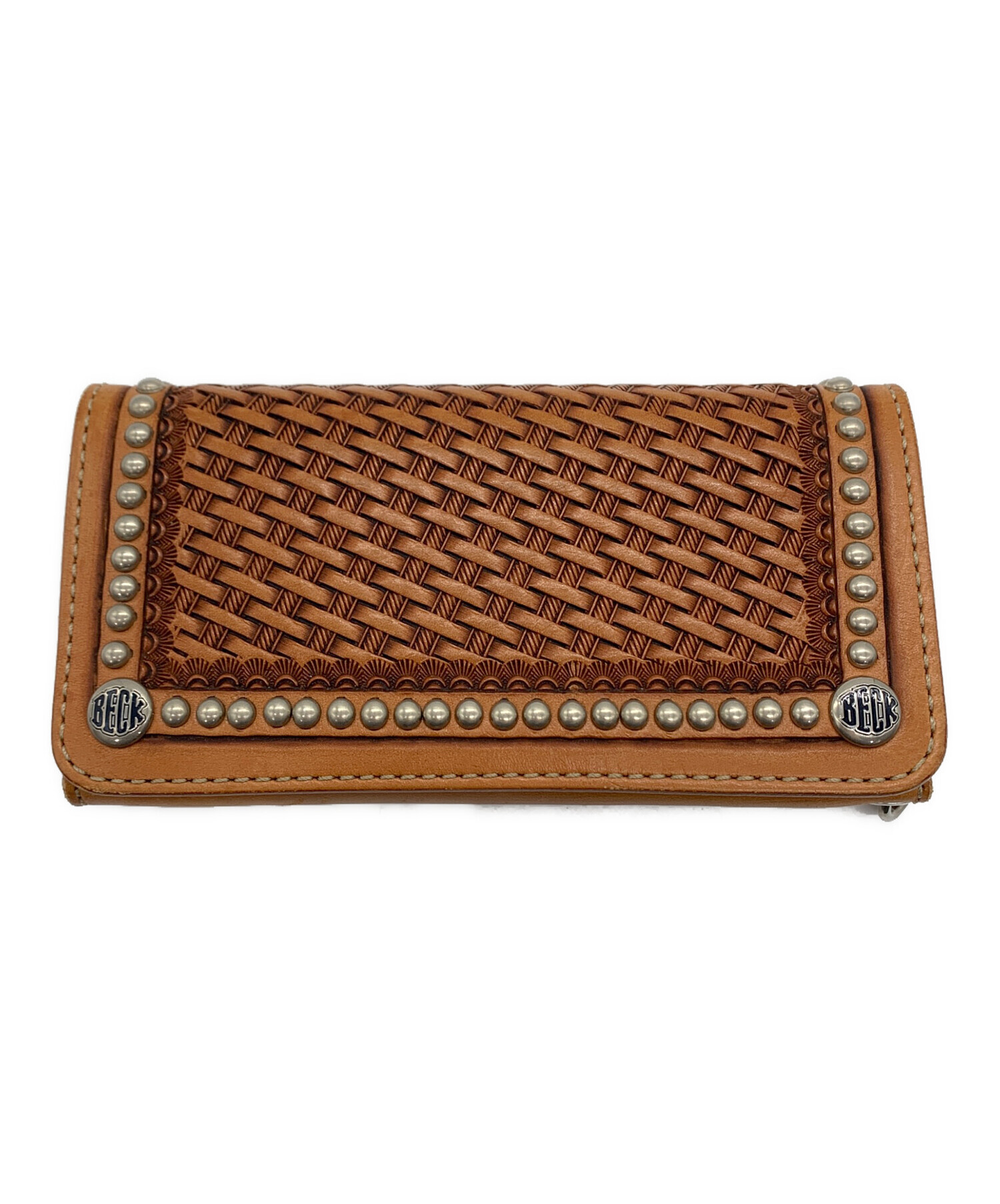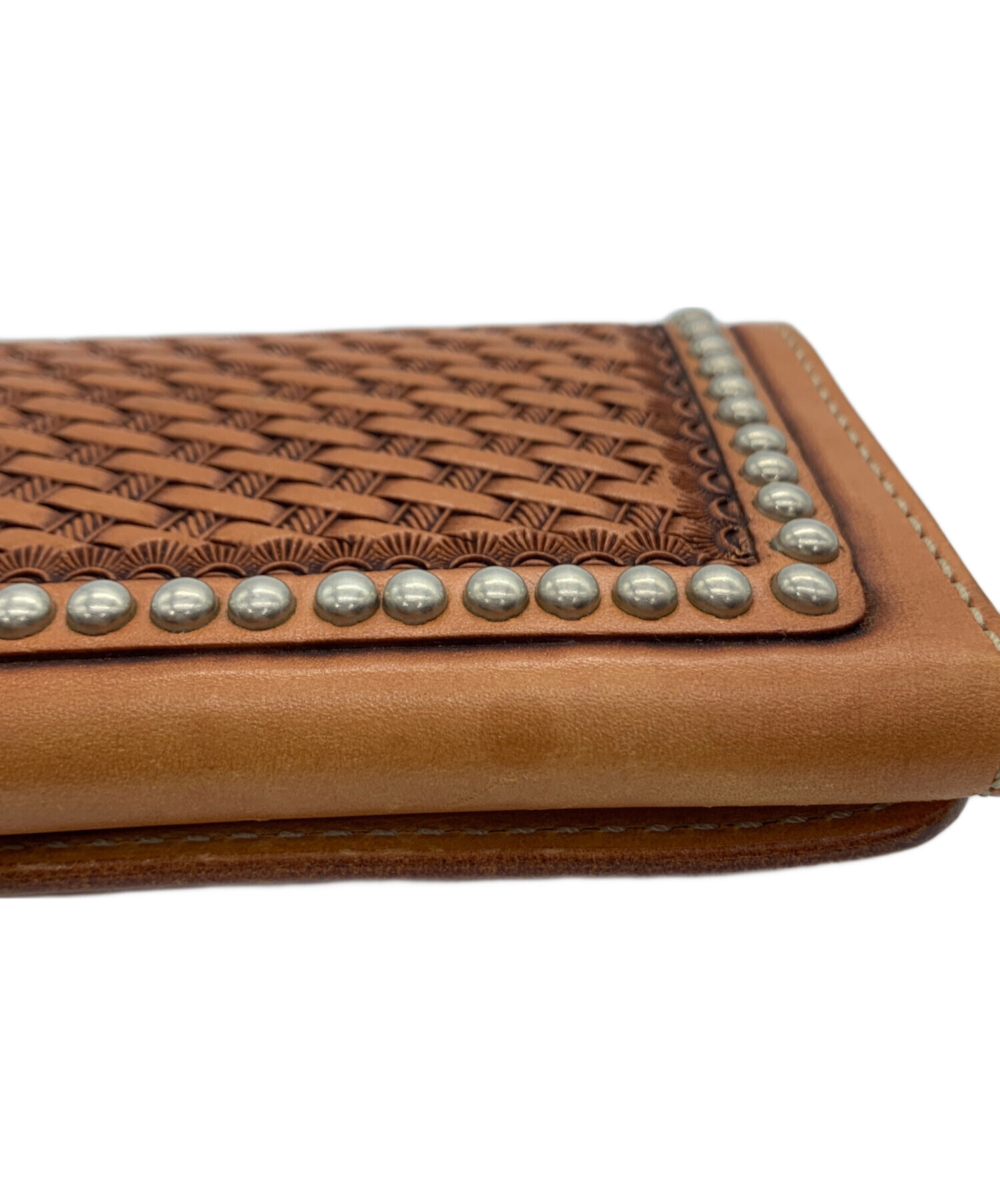 | スタッフコメント | フロントは編み込みされたメッシュデザインが施され、周囲にはスッタズが打ち込まれたクラフト感のある財布です。 |