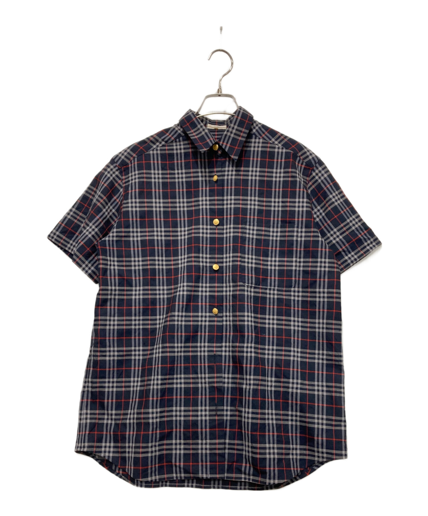 • Burberry's(バーバリー)Burberry's (バーバリー) 金釦半袖シャツ ネイビー×レッド サイズ:11ARの古着・服飾アイテム 一番下のボタン欠品有