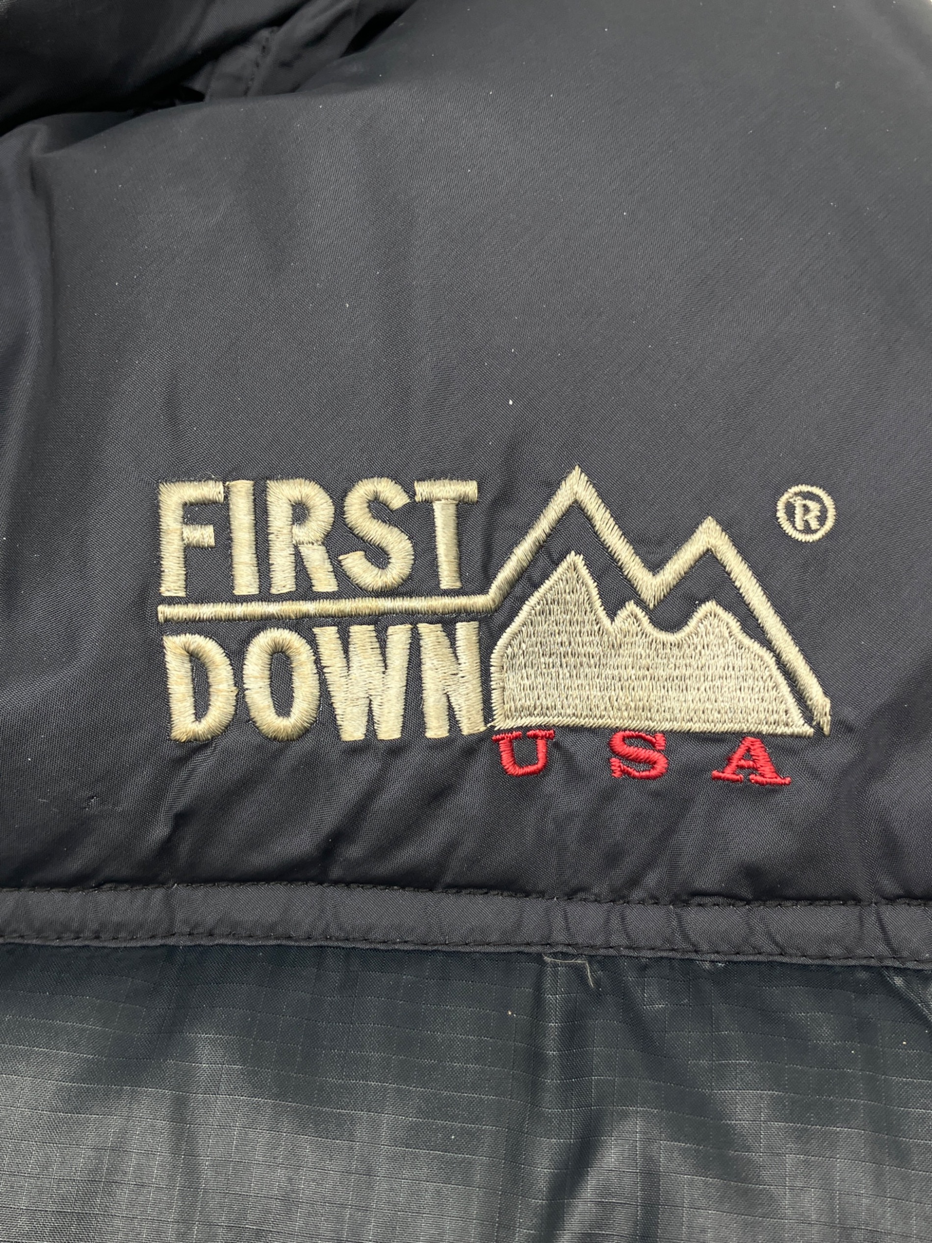 • FIRST DOWN(ファーストダウン)FIRST DOWN (ファーストダウン) ダウンジャケット ネイビー サイズ:Mの古着・服飾アイテム 胸部に小穴有り