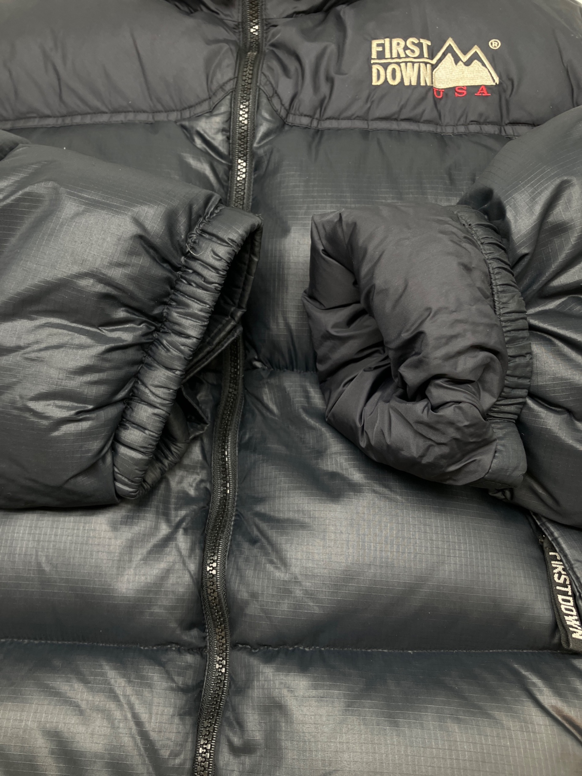 • FIRST DOWN(ファーストダウン)FIRST DOWN (ファーストダウン) ダウンジャケット ネイビー サイズ:Mの古着・服飾アイテム ファスナーに劣化有り